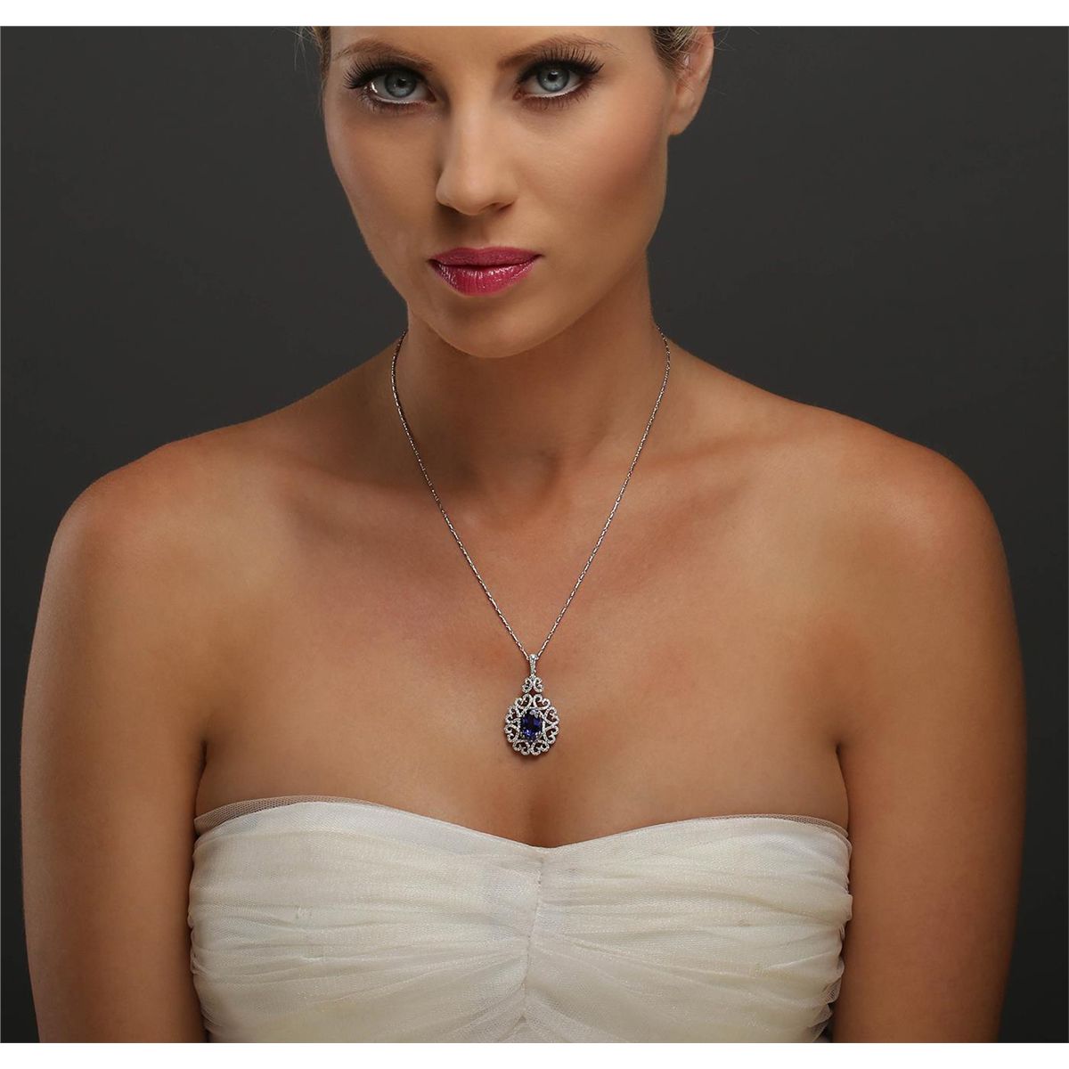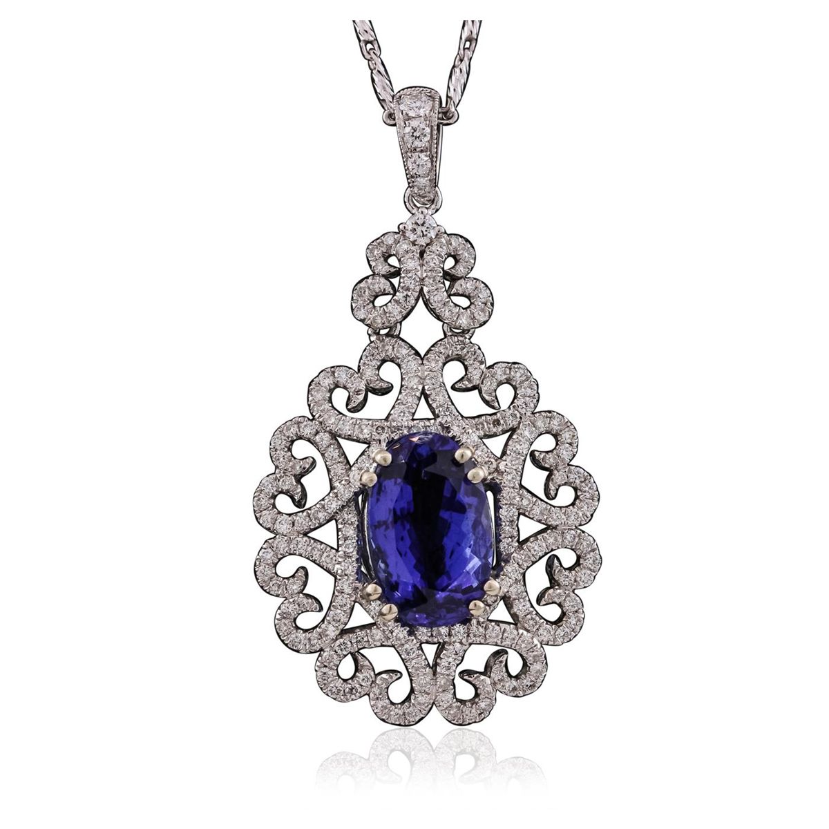 One electronically tested 18KT White Gold ladies cast & assembled tanzanite and diamond pendant with chain. The pendant features a tanzanite set within an intertwining heart shape diamond ribbon bezel, completed by a diamond set bail. The pendant is supported by an eighteen inch length 14KT White Gold designer style chain, terminating in a lobster claw clasp. Bright polish finish with milgrain detailing. Identified with markings of "18K 750". Condition is new, good workmanship. Containing: One prong set oval mixed cut natural tanzanite, measuring 12.30 x 7.75 x 5.45mm, 8% bulge factor, approximate weight of 3.96ct., clarity is eye clean, type I, medium dark, very slightly grayish, violetish blue color, (GIA vB 6/3), cut is good. Transmitting light with no distortion, transparent. Graded in the setting. Tanzanite is a very rare gemstone that is only found in the country of Tanzania. Originally discovered in 1967. Tiffany & Company, named the stone Tanzanite. It is found in the Usumburu Mountains that border the Umba Valley of northern Tanzania. Tanzanite occurs in gray, brown, violet, blue, reddish-purple, & green. The gem is interesting because of its exceptional pleochroism. Rotated in different directions a tanzanite will exhibit multiple changes of color. Tanzanite has a low tolerance to ultrasonic cleaning, and should not be cleaned using this method. One Hundred Eighty-Nine prong set round brilliant cut diamonds, measuring 1.20 - 1.10 x 0.69mm (depth est.) approximate total weight of 189 Stones = 1.14ct. Graded in the setting. Clarity: VS-1 to SI-1. Color: G - I. Total Weight of Colored Stones 3.96ct. Total Weight of Diamonds 1.14ct. Total Weight of Pendant With Chain 10.94 grams. AIG Appraised at $17,285.00.