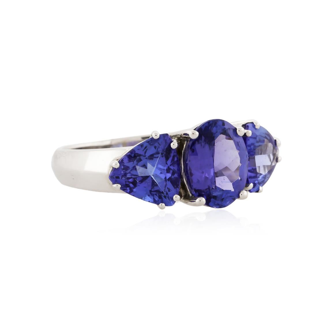 One electronically tested 18KT white gold ladies cast tanzanite ring with a bright polish finish. The ring features a tanzanite supported by a single tanzanite on either side, completed by a two and one-half millimeter wide band. Identified with markings of "18K". Condition is new, good workmanship. Containing: One prong set oval mixed cut natural tanzanite, measuring 8.75 x 6.75 x 4.00mm, 6%. bulge factor, approximate weight of 1.71ct., clarity is eye clean, type I, medium dark, moderately strong, bluish violet color, (GIA bV 6/4), cut is good. Transmitting light with no distortion, transparent. Graded in the setting. Two prong set triangle mixed cut natural tanzanites, measuring 7.10 x 7.00 x 3.50mm, 8%. bulge factor, approximate total weight of 2.26ct., clarity is eye clean, type I, medium dark, moderately strong, bluish violet color, (GIA bV 6/4), cut is good. Transmitting light with no distortion, transparent. Measurements & the color grade are an average for the group. Graded in the setting. Tanzanite is a very rare gemstone that is only found in the country of Tanzania. Originally discovered in 1967. Tiffany & Company, named the stone Tanzanite. It is found in the Usumburu Mountains that border the Umba Valley of northern Tanzania. Tanzanite occurs in gray, brown, violet, blue, reddish-purple, & green. The gem is interesting because of its exceptional pleochroism. Rotated in different directions a tanzanite will exhibit multiple changes of color. Tanzanite has a low tolerance to ultrasonic cleaning, and should not be cleaned using this method. Total Weight of Colored Stones 3.97ct. Total Weight of Ring 4.63 grams. AIG Appraised at $8,200.00.