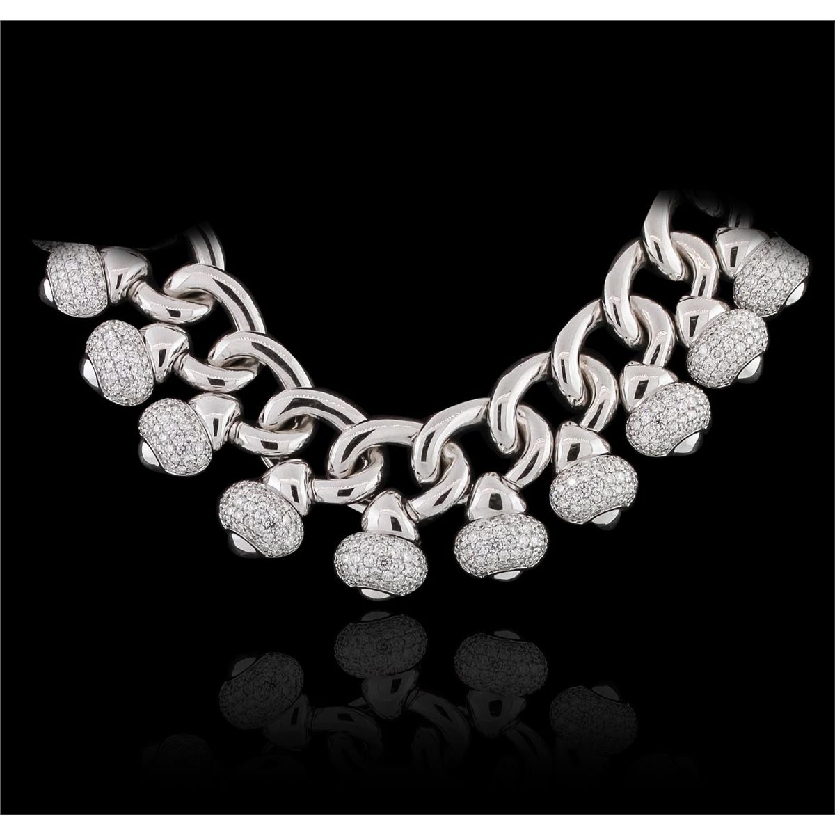 One electronically tested 18KT White Gold ladies custom cast & assembled diamond necklace with a bright finish. The thirteen inch length necklace features a series of thirty three curb chain links each supporting a flexible diamond set drop. Identified with markings of "18K". Condition is good. Containing: One Thousand, Three Hundred Eighty-Six prong set round brilliant cut diamonds, measuring 2.00 - 1.40 x 0.84mm (depth est.) approximate total weight of 1386 Stones = 33.07ct. Graded in the setting. Clarity: VVS-2 to VS-2. Color: F - H. Total Weight of Diamonds 33.07ct. AIG Appraised at $199,000.00.