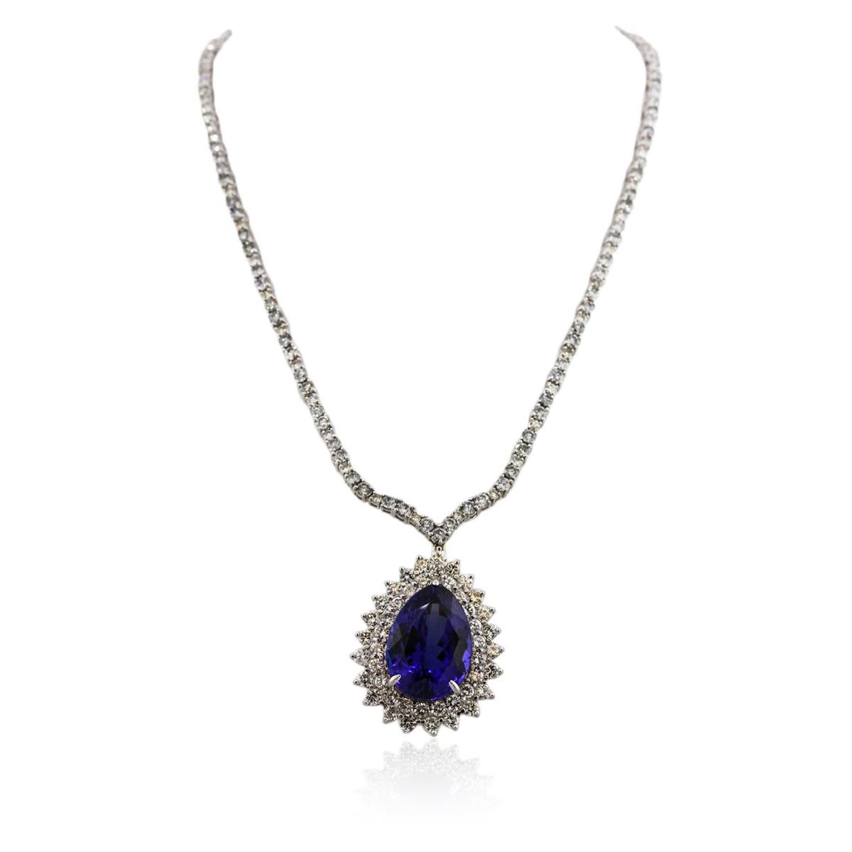 One electronically tested 18KT white gold Ladies combination cast & assembled necklace with a hidden box clasp with a bright polish finish. Condition is new. Measurements: 16" in length. Identified with markings of "750". Containing: One prong set pear modified brilliant cut natural tanzanite, measuring 22.32 x 15.97 x 12.75mm, exact weight 33.91ct., clarity is eye clean, type I, medium, moderately strong, violetish blue color, (GIA vB 5/4), cut is very good. GIA Report: 1156735336. One Hundred Thirty-Six prong set round brilliant cut diamonds, measuring 3.20 - 2.60 x 1.74mm (depth est.) approximate. Total Weight of 136 Stones = 12.13ct. Clarity: SI-2 to I-2. Color: J - K, Cut is Good. Forty-Six prong set round brilliant cut diamonds, measuring 2.30 - 2.30 x 1.38mm (depth est.) approximate. Total Weight of 46 Stones = 2.05ct. Clarity: I-1 to I-2. Color: J - L, Cut is Good. Total Weight of Colored Stones 33.91ct. Total Weight of Diamonds 14.18ct. Total Weight of Necklace 39.10 grams. GGL Appraised at $85,130.00.