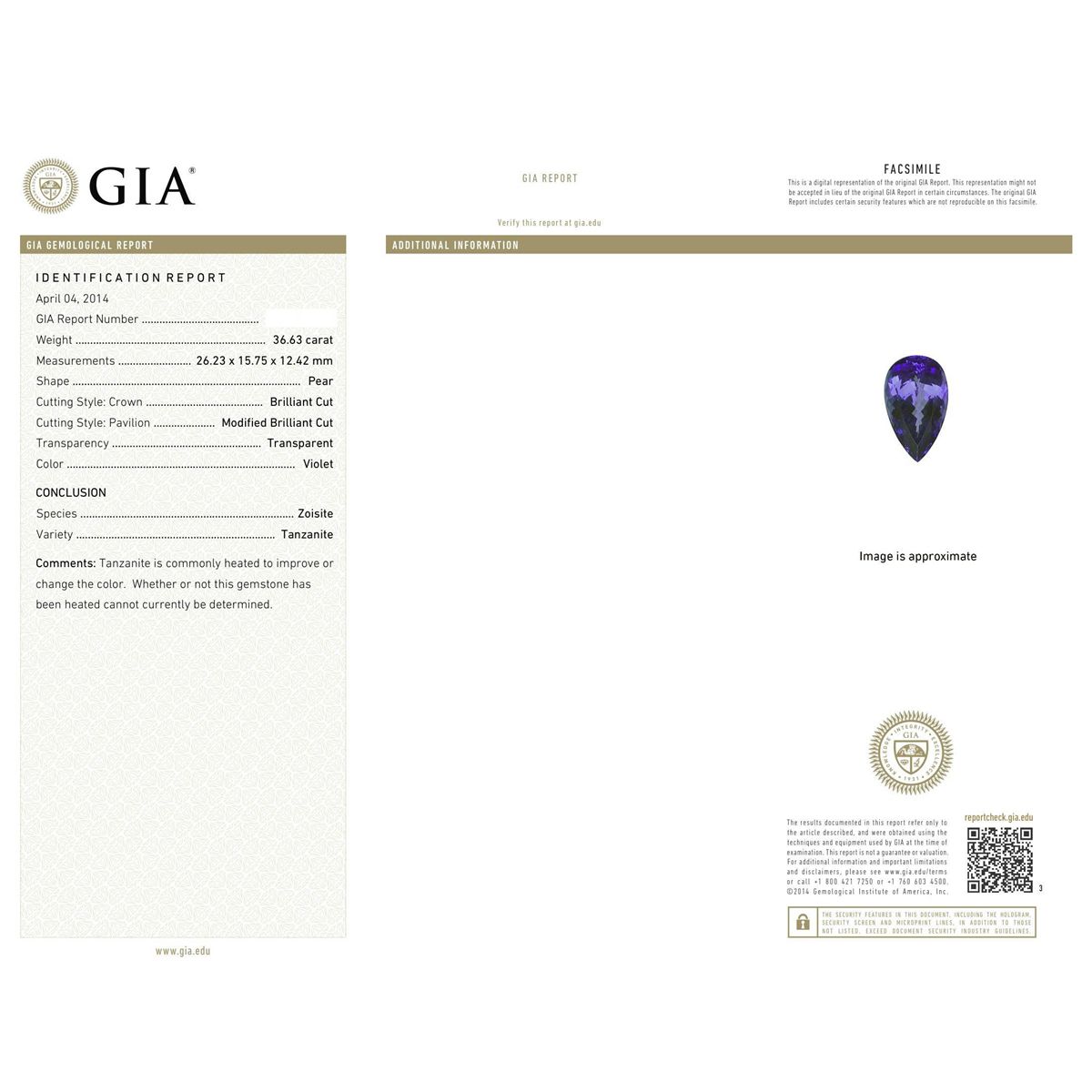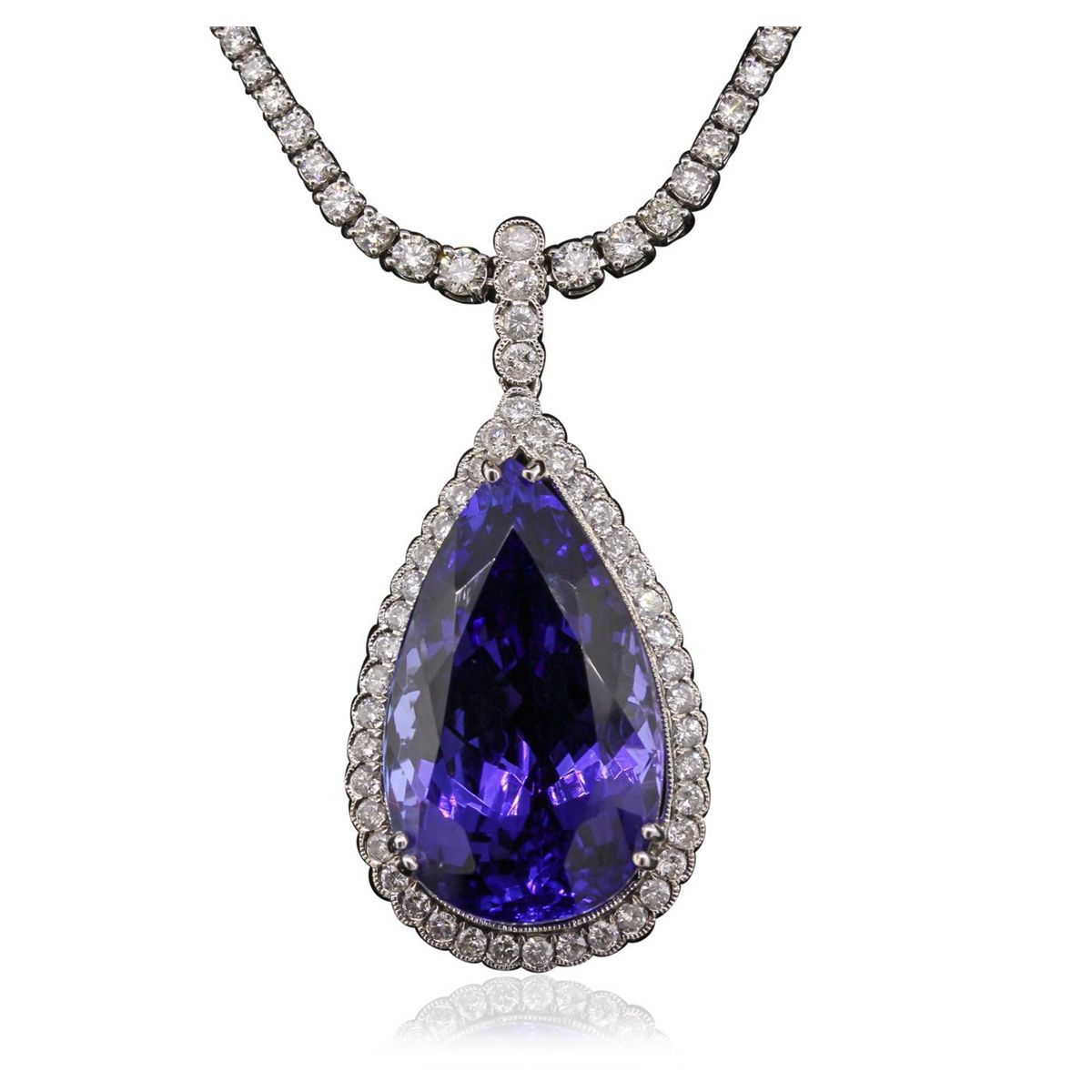One electronically tested 18KT white gold Ladies combination cast & assembled pendant & chain 16.8 inch long, medium with a hidden box clasp with a bright polish finish. Condition is new. Identified with markings of "18K". Containing: One prong set pear modified brilliant cut natural tanzanite, measuring 26.23 x 15.75 x 12.42mm, exact weight 36.63ct., clarity is eye clean, type I, medium, moderately strong, violet color, (GIA V 5/4), cut is very good. GIA Report: 1166000156. Five prong set round brilliant cut diamonds, measuring 3.00 - 2.50 x 1.65mm (depth est.) approximate. Total Weight of 5 Stones = 0.30ct. Clarity: I-1 to I-2. Color: J - K, Cut is Good. One Hundred Thirty-Eight prong set round brilliant cut diamonds, measuring 1.70 - 1.70 x 1.02mm (depth est.) approximate. Total Weight of 138 Stones = 2.47ct. Clarity: I-1 to I-2. Color: I - J, Cut is Good. Total Weight of Colored Stones 36.63ct. Total Weight of Diamonds 2.77ct. Total Weight of Pendant & Chain 27.60 grams. GGL Appraised at $64,965.00.