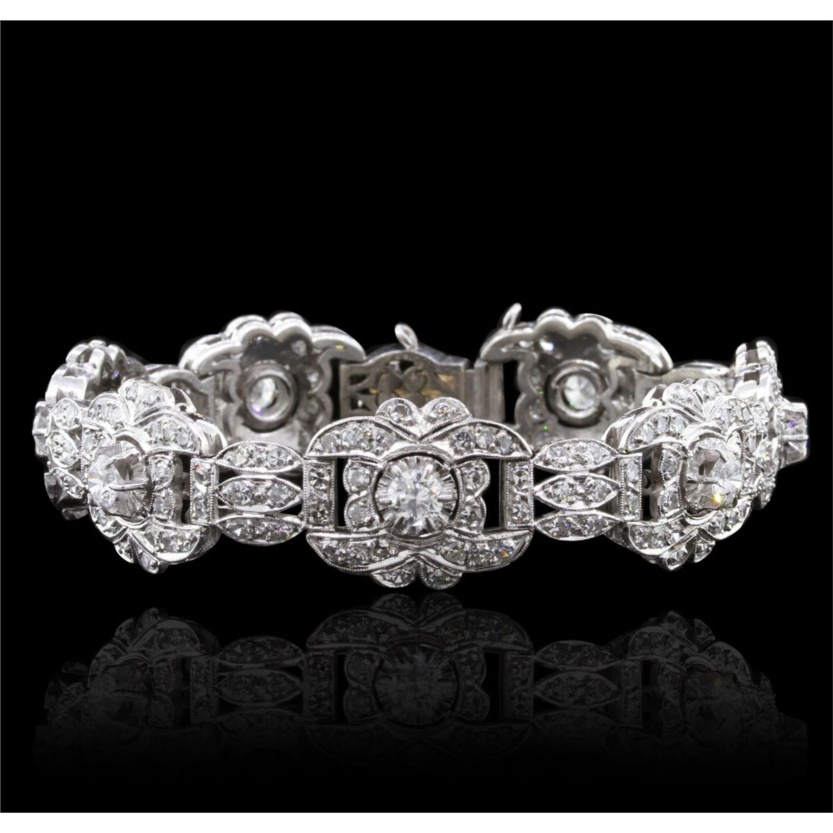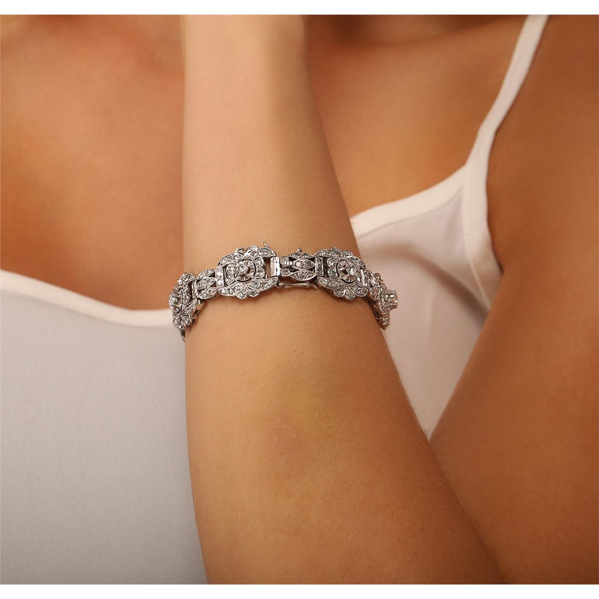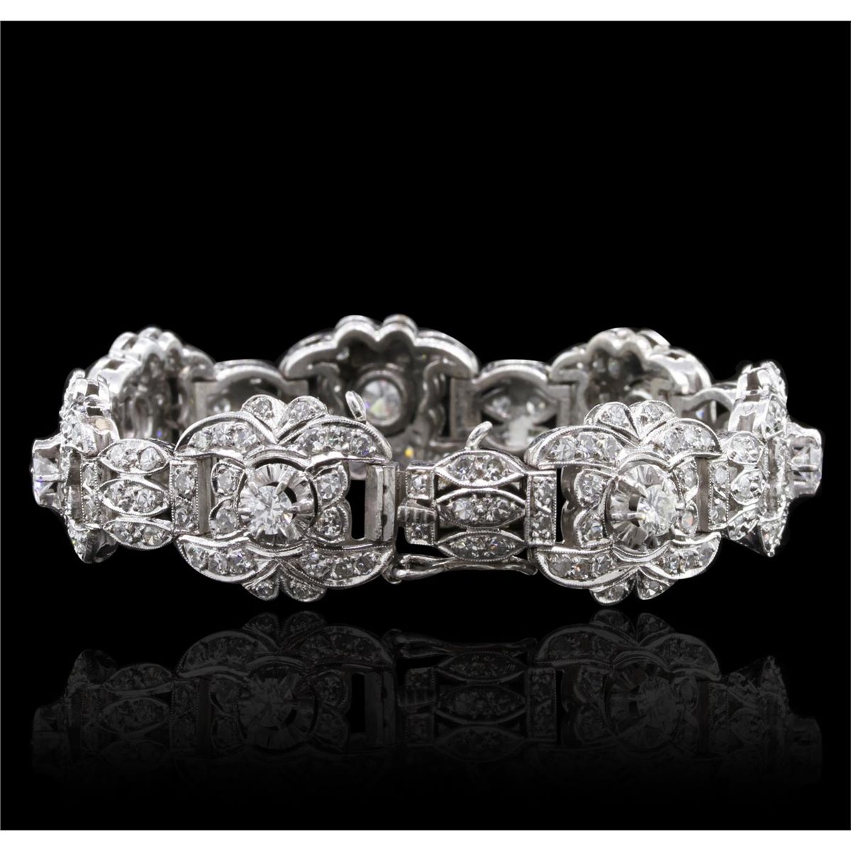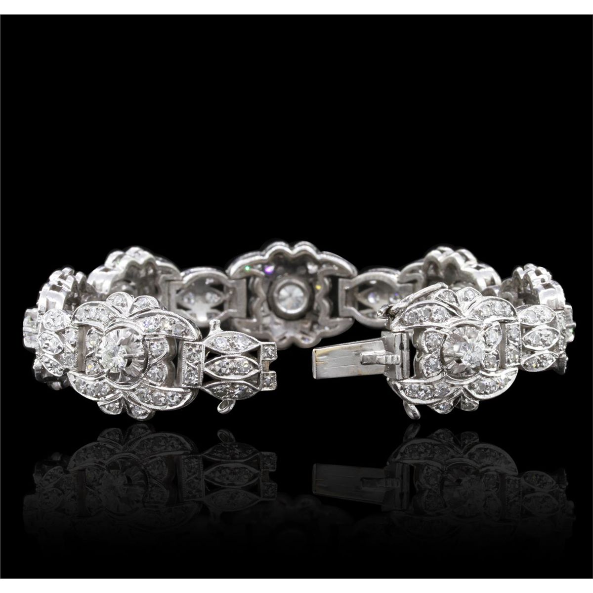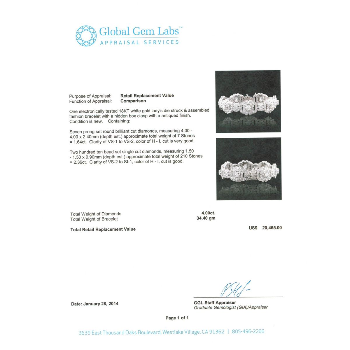 One electronically tested 18KT white gold Ladies die struck & assembled fashion bracelet with a hidden box clasp with a antiqued finish. Condition is new. Containing: Seven prong set round brilliant cut diamonds, measuring 4.00 - 4.00 x 2.40mm (depth est.) approximate total weight of 7 Stones = 1.64ct. Clarity of VS-1 to VS-2, Color of H - I, Cut is Very Good. Two Hundred Ten bead set single cut diamonds, measuring 1.50 - 1.50 x 0.90mm (depth est.) approximate total weight of 210 Stones = 2.36ct. Clarity of VS-2 to SI-1, Color of H - I, Cut is Good. Total Weight of Diamonds 4.00ct. Total Weight of Bracelet 34.40gm. GGL Appraised at $20,465.00.