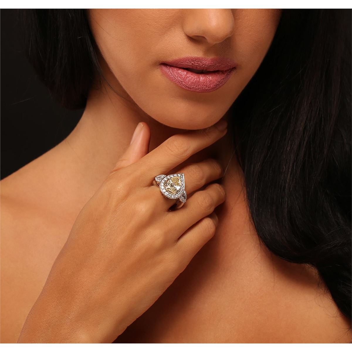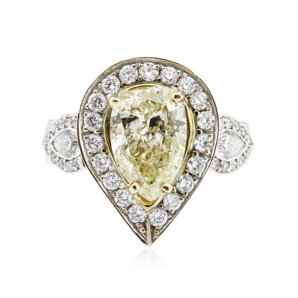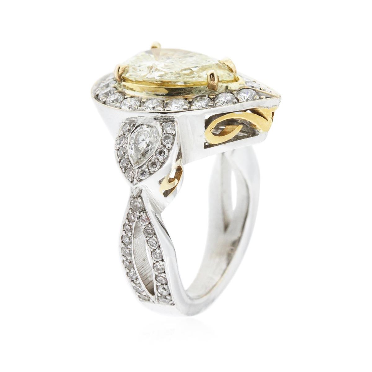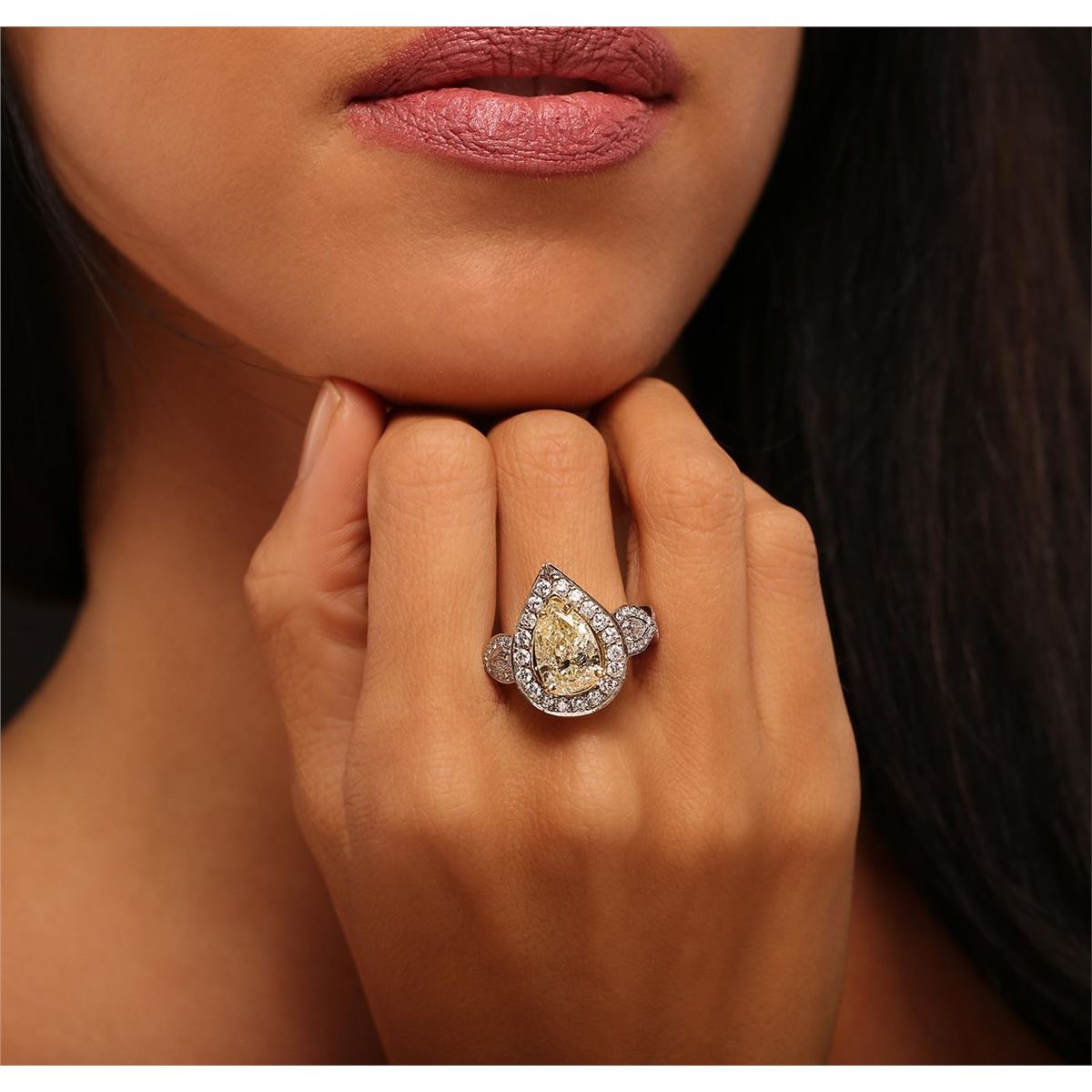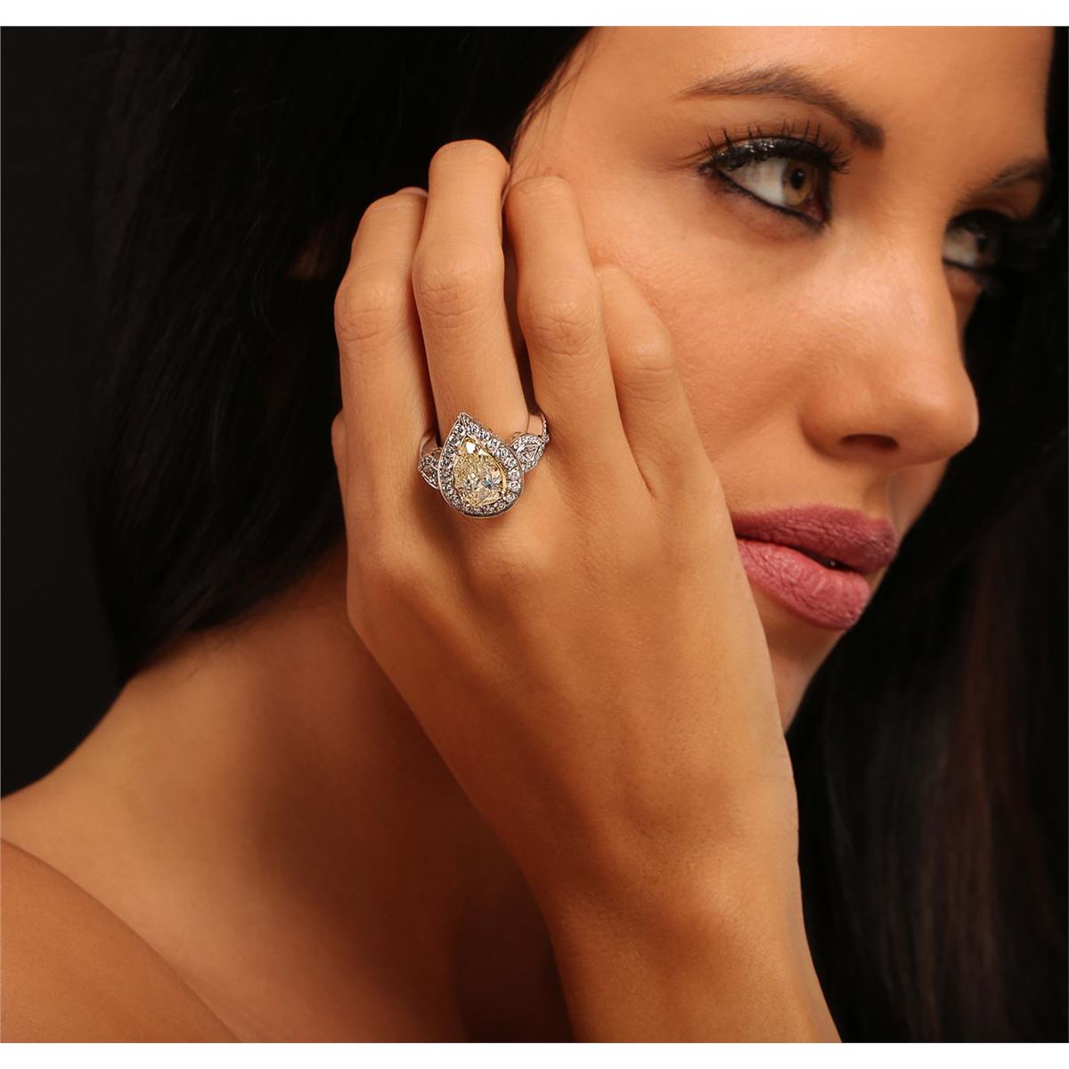 One electronically tested 18KT white gold ladies cast diamond ring. The featured diamond is set within a diamond bezel supported by intertwining diamond set shoulders, completed by a three millimeter wide band. Bright polish finish with yellow gold accents. Identified with markings of "18K". Condition is good. Containing: One prong set pear shaped cut diamond, measuring 12.30 x 8.15 x 3.65mm (depth est.) approximate weight of 2.26ct with a medium strong blue fluorescence. Diamond Grading Report attached. Naturally occurring internal & external characteristics are present, including natural iridescence. Graded in the setting. Clarity: I-1. Depth: 44.8%. Table 65.6%. Two bezel set pear shaped cut diamonds, measuring 4.80 x 3.30 x 2.08mm (depth est.) approximate. Total Weight of 2 Stones = 0.45ct. Color grade is an average for the pair. Graded in the setting. Clarity: VS-1 to VS-2. Color: G Nineteen prong set round brilliant cut diamonds, measuring 2.15 - 2.10 x 1.28mm (depth est.) approximate. Total Weight of 19 Stones = 0.77ct. Graded in the setting. Clarity: VS-1 to SI-1. Color: G - I Fifty-Four prong set round brilliant cut diamonds, measuring 1.40 - 1.20 x 0.78mm (depth est.) approximate. Total Weight of 54 Stones = 0.53ct. Graded in the setting. Clarity: VS-1 to SI-1. Color: G - I. Total Weight of Diamonds 4.01ct. Total Weight of Ring 13.79 grams. AIG Appraised at $27,055.00.