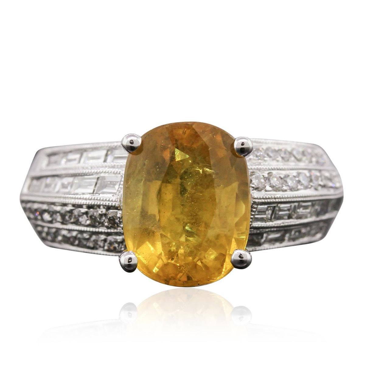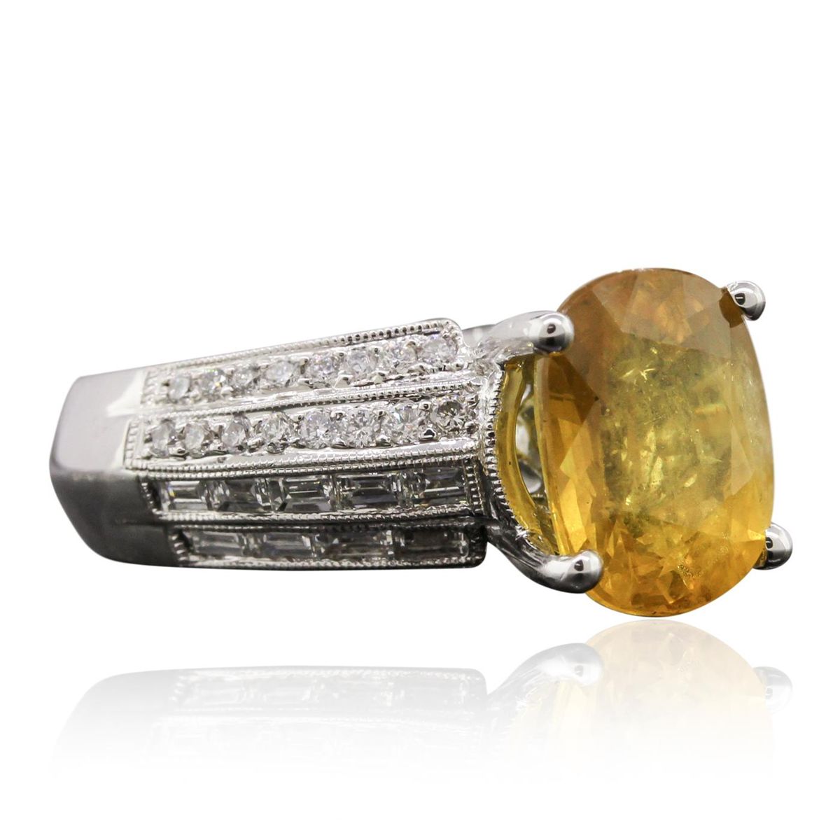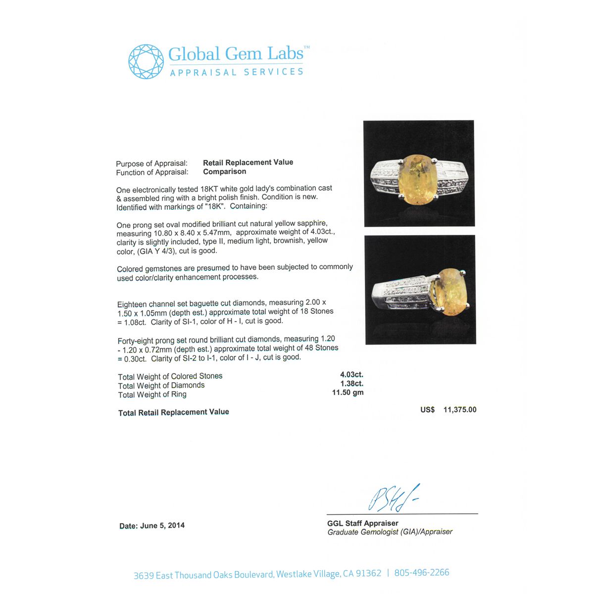 One electronically tested 18KT white gold Ladies combination cast & assembled ring with a bright polish finish. Condition is new. Identified with markings of "18K". Containing: One prong set oval modified brilliant cut natural yellow sapphire, measuring 10.80 x 8.40 x 5.47mm, approximate weight of 4.03ct., clarity is slightly included, type II, medium light, brownish, yellow color, (GIA Y 4/3), cut is good. Colored gemstones are presumed to have been subjected to commonly used color/clarity enhancement processes. Eighteen channel set baguette cut diamonds, measuring 2.00 x 1.50 x 1.05mm (depth est.) approximate total weight of 18 Stones = 1.08ct. Clarity of SI-1, Color of H - I, Cut is Good. Forty-Eight prong set round brilliant cut diamonds, measuring 1.20 - 1.20 x 0.72mm (depth est.) approximate total weight of 48 Stones = 0.30ct. Clarity of SI-2 to I-1, Color of I - J, Cut is Good. Total Weight of Colored Stones 4.03ct. Total Weight of Diamonds 1.38ct. Total Weight of Ring 11.50 grams. GGL Appraised at $11,375.00.