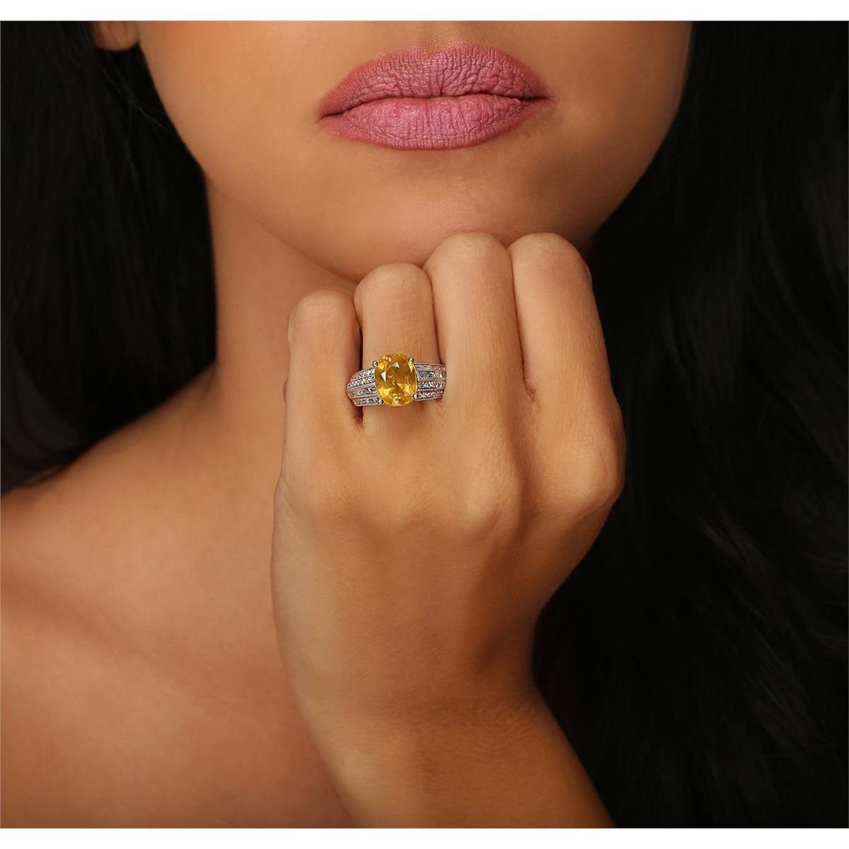One electronically tested 18KT white gold Ladies combination cast & assembled ring with a bright polish finish. Condition is new. Identified with markings of "18K". Containing: One prong set oval modified brilliant cut natural yellow sapphire, measuring 10.80 x 8.40 x 5.47mm, approximate weight of 4.03ct., clarity is slightly included, type II, medium light, brownish, yellow color, (GIA Y 4/3), cut is good. Colored gemstones are presumed to have been subjected to commonly used color/clarity enhancement processes. Eighteen channel set baguette cut diamonds, measuring 2.00 x 1.50 x 1.05mm (depth est.) approximate total weight of 18 Stones = 1.08ct. Clarity of SI-1, Color of H - I, Cut is Good. Forty-Eight prong set round brilliant cut diamonds, measuring 1.20 - 1.20 x 0.72mm (depth est.) approximate total weight of 48 Stones = 0.30ct. Clarity of SI-2 to I-1, Color of I - J, Cut is Good. Total Weight of Colored Stones 4.03ct. Total Weight of Diamonds 1.38ct. Total Weight of Ring 11.50 grams. GGL Appraised at $11,375.00.
