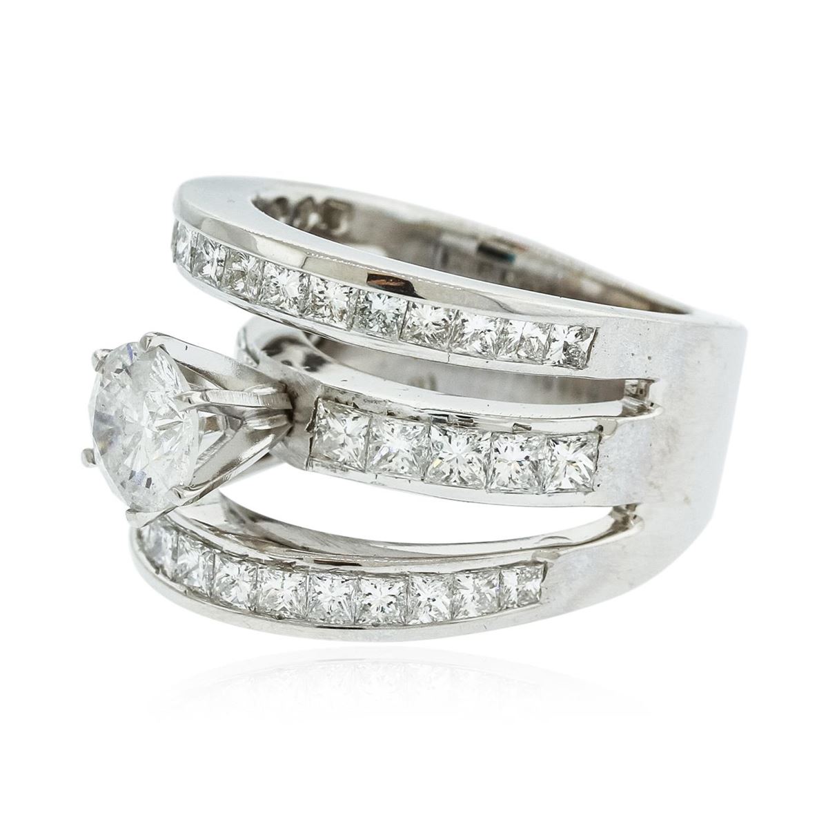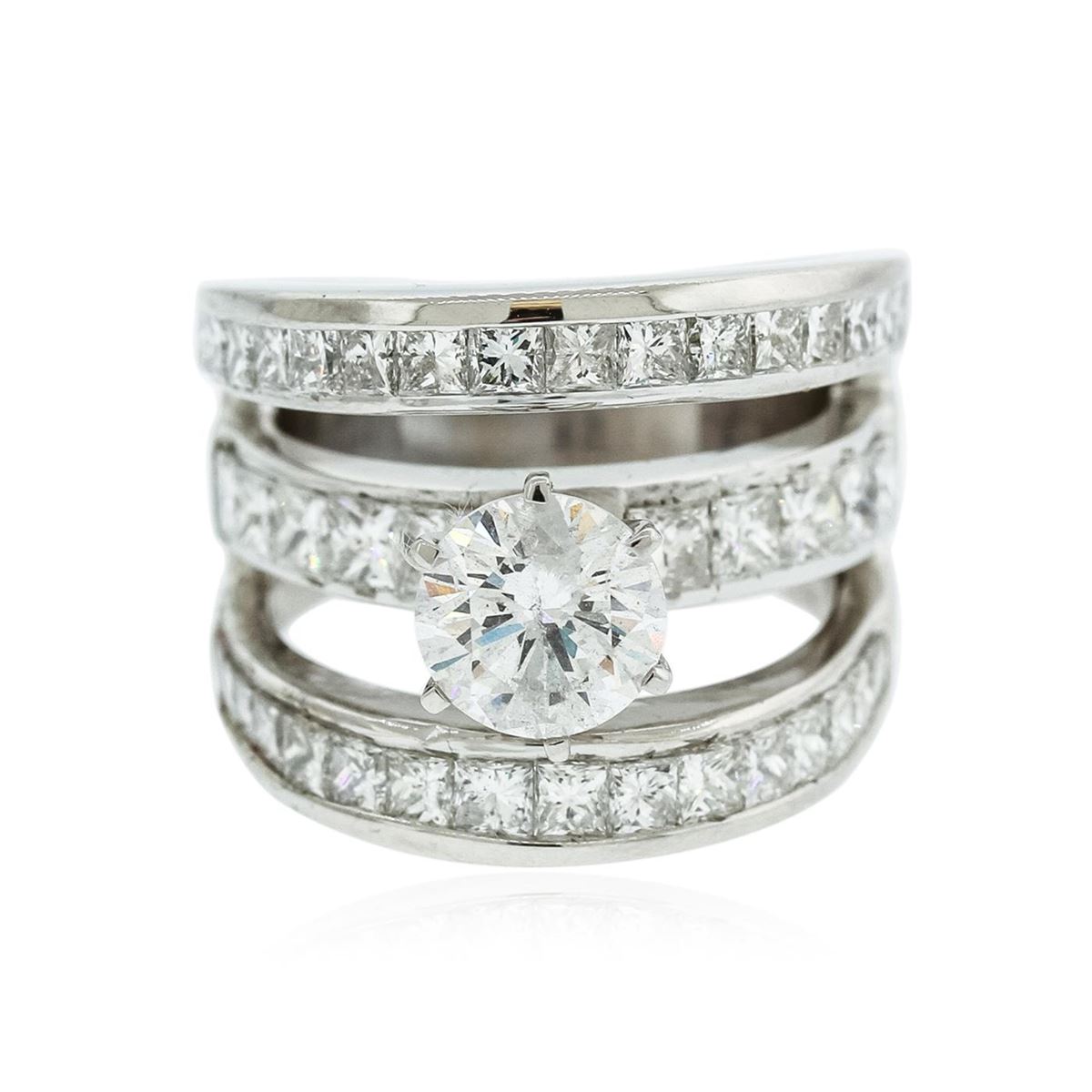 One electronically tested 18KT white gold Ladies combination cast & assembled engagement ring with a bright polish finish. Condition is excellent. Identified with markings of "18K". Containing: One prong set round brilliant cut diamond, measuring 7.28 - 7.15 x 4.33mm (depth est.) approximate weight of 1.45ct. Clarity: I-2. Color: G, Cut is Good. Thirty-Four channel set princess cut diamonds, measuring 2.00 x 2.00 x 1.50mm (depth est.) approximate. Total Weight of 34 Stones = 1.67ct. Clarity: SI-1 to SI-2. Color: I - J, Cut is Good. Ten channel set princess cut diamonds, measuring 2.50 x 2.50 x 1.88mm (depth est.) approximate. Total Weight of 10 Stones = 0.96ct. Clarity: SI-1 to SI-2. Color: H - I, Cut is Good. Total Weight of Diamonds 4.09ct. Total Weight of Ring 19.60 grams. GGL Appraised at $27,390.00.