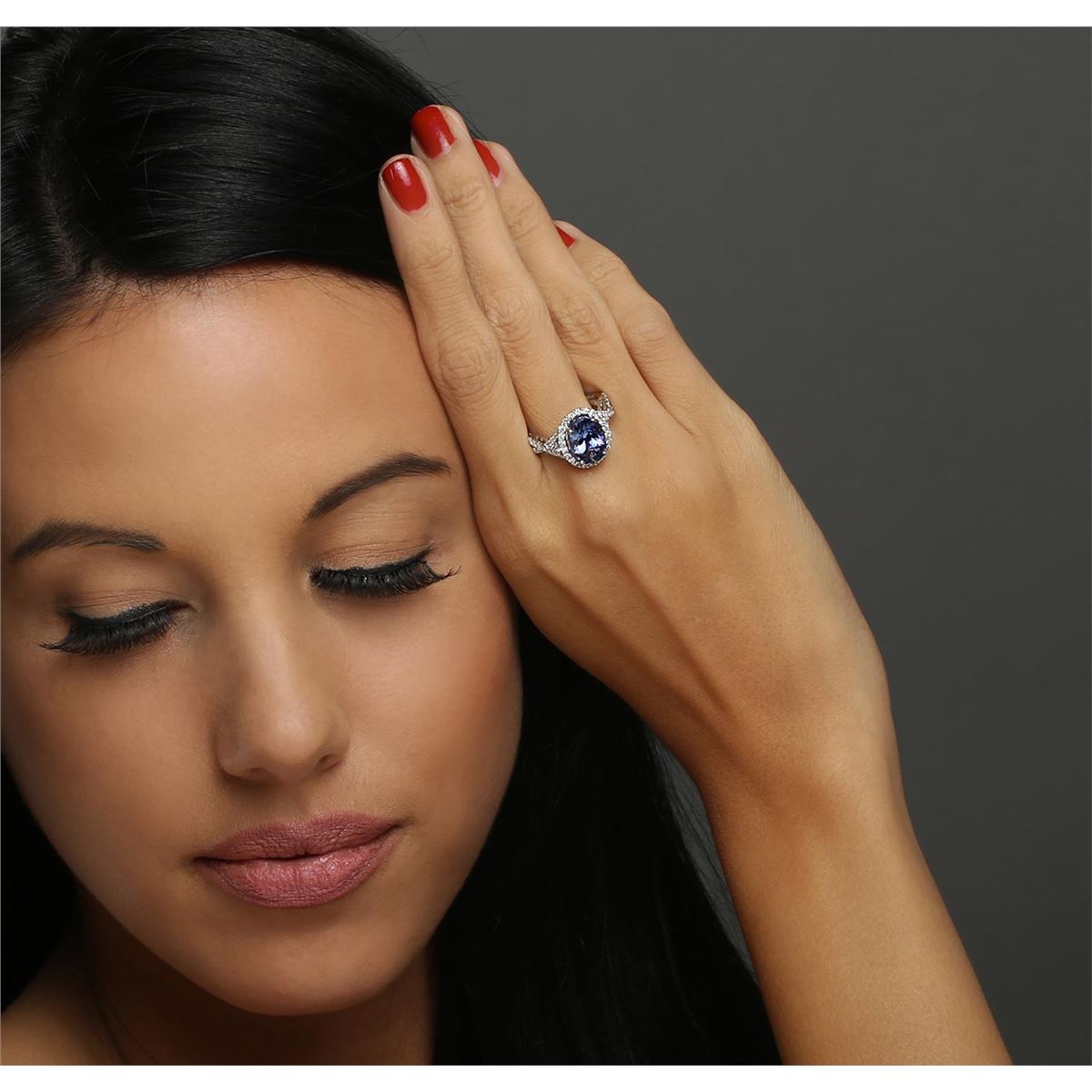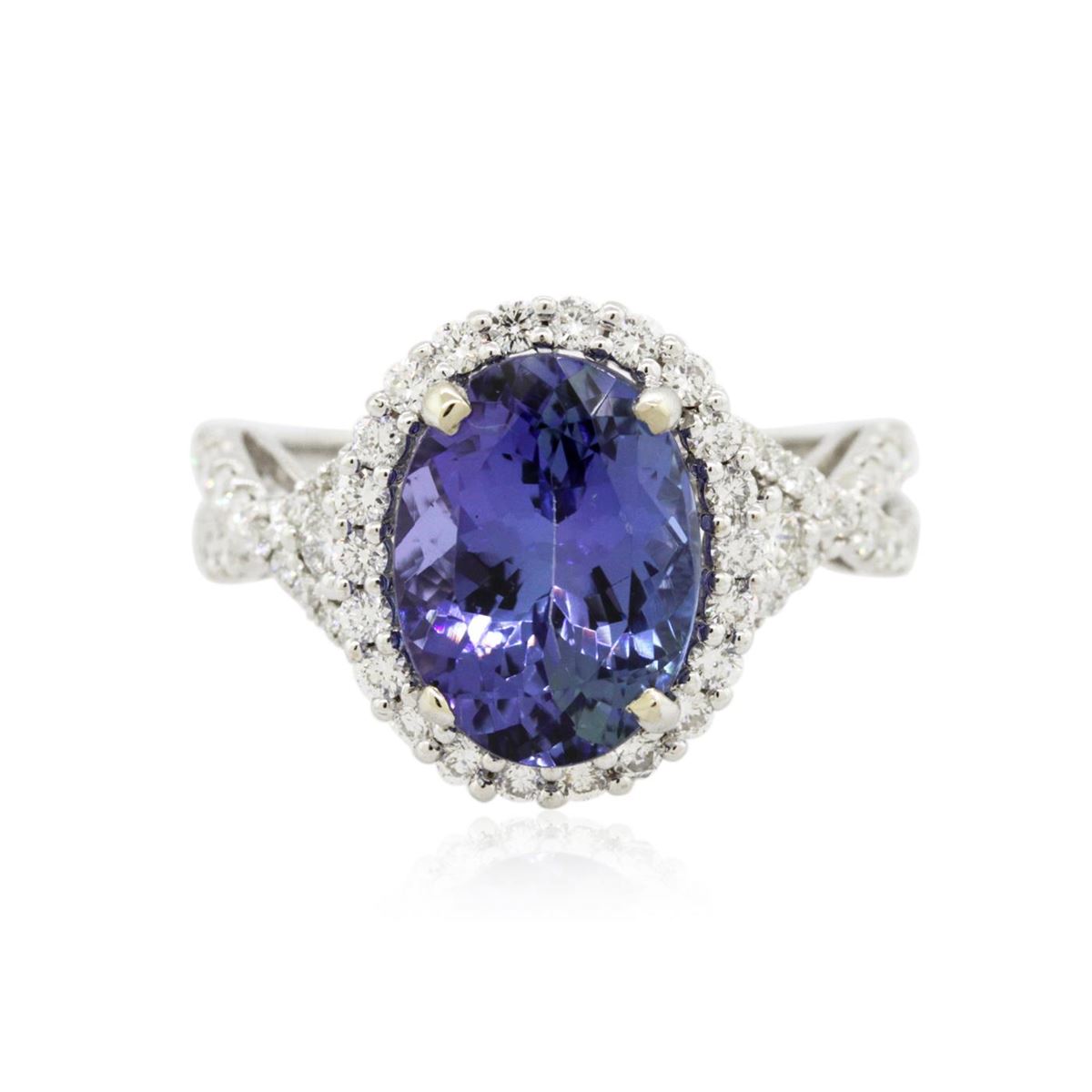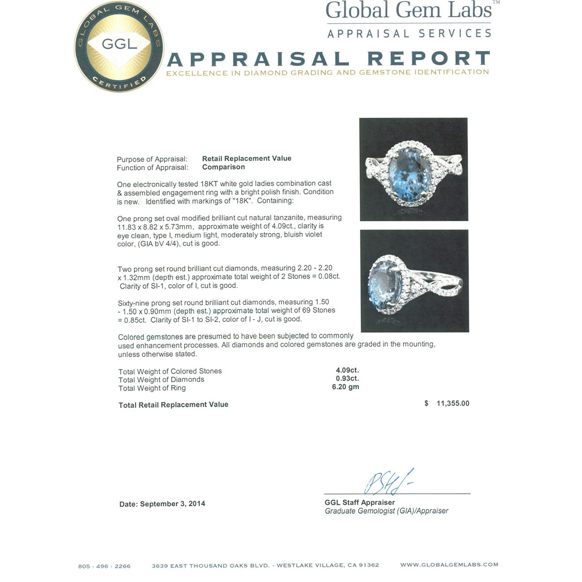One electronically tested 18KT white gold ladies combination cast & assembled engagement ring with a bright polish finish. Identified with markings of "18K". Condition is new. Containing: One prong set oval modified brilliant cut natural tanzanite, measuring 11.83 x 8.82 x 5.73mm, approximate weight of 4.09ct., clarity is eye clean, type I, medium light, moderately strong, bluish violet color, (GIA bV 4/4), cut is good. Two prong set round brilliant cut diamonds, measuring 2.20 - 2.20 x 1.32mm (depth est.) approximate total weight of 2 Stones = 0.08ct. Clarity: SI-1. Color: I, Cut is Good. Sixty-Nine prong set round brilliant cut diamonds, measuring 1.50 - 1.50 x 0.90mm (depth est.) approximate total weight of 69 Stones = 0.85ct. Clarity: SI-1 to SI-2. Color: I - J, Cut is Good. Colored gemstones are presumed to have been subjected to commonly used enhancement processes. All diamonds and colored gemstones are graded in the mounting, unless otherwise stated. Total Weight of Colored Stones 4.09ct. Total Weight of Diamonds 0.93ct. Total Weight of Ring 6.20 grams. GGL Appraised at $11,355.00.