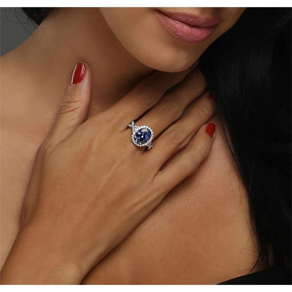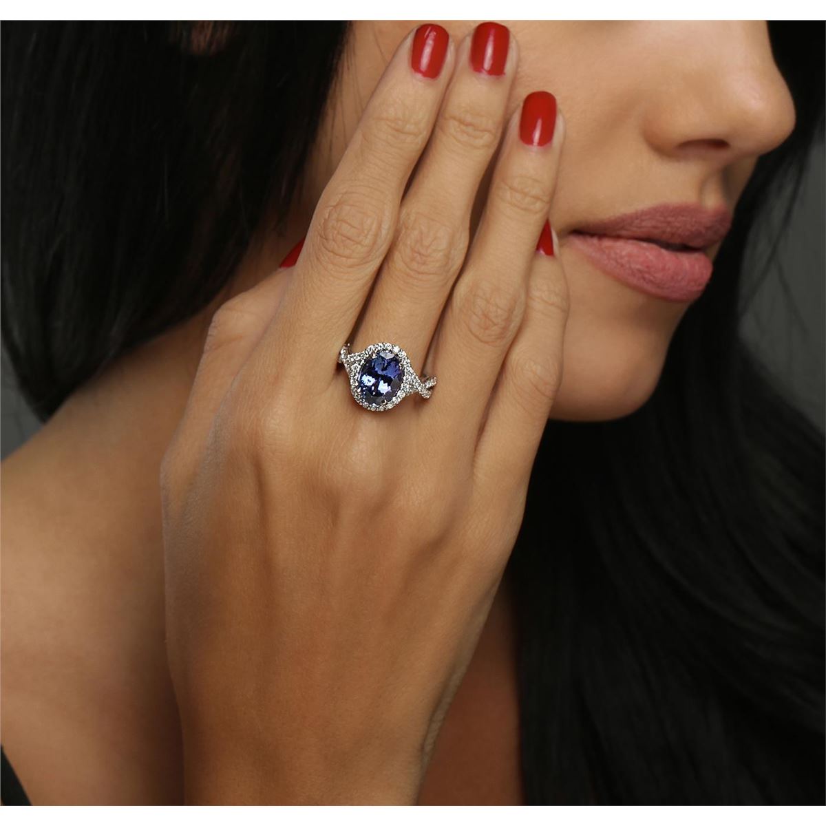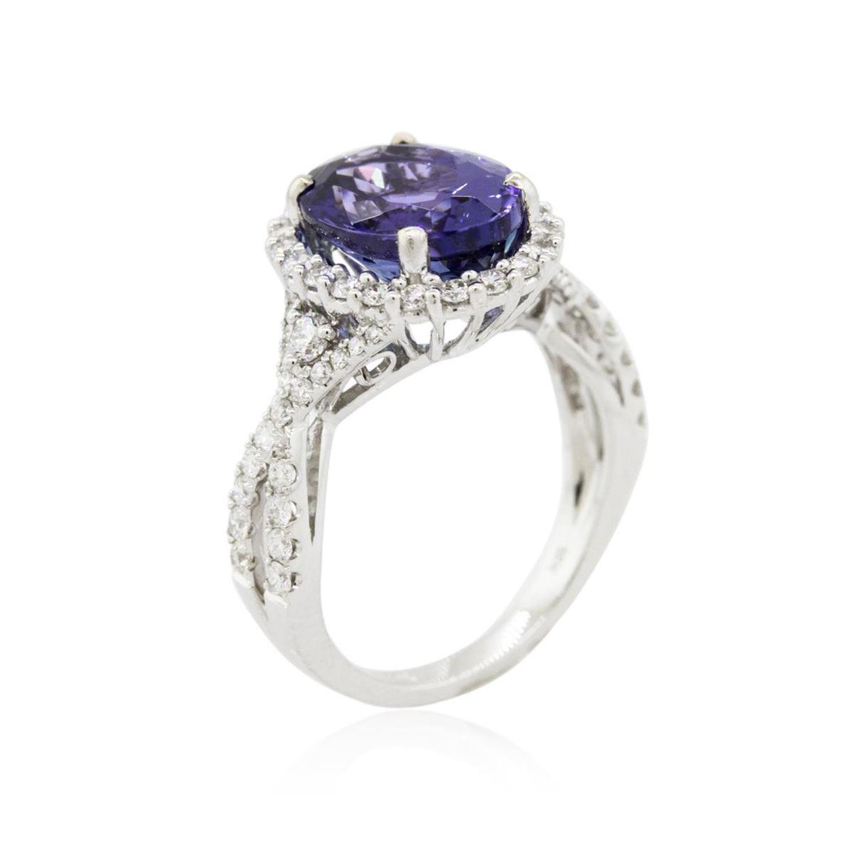 One electronically tested 18KT white gold ladies combination cast & assembled engagement ring with a bright polish finish. Identified with markings of "18K". Condition is new. Containing: One prong set oval modified brilliant cut natural tanzanite, measuring 11.83 x 8.82 x 5.73mm, approximate weight of 4.09ct., clarity is eye clean, type I, medium light, moderately strong, bluish violet color, (GIA bV 4/4), cut is good. Two prong set round brilliant cut diamonds, measuring 2.20 - 2.20 x 1.32mm (depth est.) approximate total weight of 2 Stones = 0.08ct. Clarity: SI-1. Color: I, Cut is Good. Sixty-Nine prong set round brilliant cut diamonds, measuring 1.50 - 1.50 x 0.90mm (depth est.) approximate total weight of 69 Stones = 0.85ct. Clarity: SI-1 to SI-2. Color: I - J, Cut is Good. Colored gemstones are presumed to have been subjected to commonly used enhancement processes. All diamonds and colored gemstones are graded in the mounting, unless otherwise stated. Total Weight of Colored Stones 4.09ct. Total Weight of Diamonds 0.93ct. Total Weight of Ring 6.20 grams. GGL Appraised at $11,355.00.