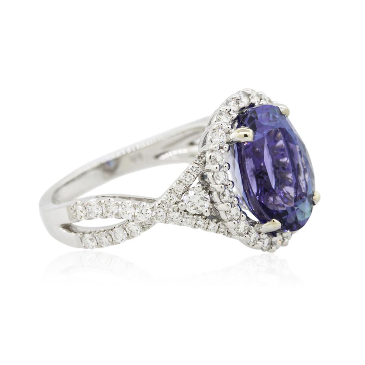 One electronically tested 18KT white gold ladies combination cast & assembled engagement ring with a bright polish finish. Identified with markings of "18K". Condition is new. Containing: One prong set oval modified brilliant cut natural tanzanite, measuring 11.83 x 8.82 x 5.73mm, approximate weight of 4.09ct., clarity is eye clean, type I, medium light, moderately strong, bluish violet color, (GIA bV 4/4), cut is good. Two prong set round brilliant cut diamonds, measuring 2.20 - 2.20 x 1.32mm (depth est.) approximate total weight of 2 Stones = 0.08ct. Clarity: SI-1. Color: I, Cut is Good. Sixty-Nine prong set round brilliant cut diamonds, measuring 1.50 - 1.50 x 0.90mm (depth est.) approximate total weight of 69 Stones = 0.85ct. Clarity: SI-1 to SI-2. Color: I - J, Cut is Good. Colored gemstones are presumed to have been subjected to commonly used enhancement processes. All diamonds and colored gemstones are graded in the mounting, unless otherwise stated. Total Weight of Colored Stones 4.09ct. Total Weight of Diamonds 0.93ct. Total Weight of Ring 6.20 grams. GGL Appraised at $11,355.00.