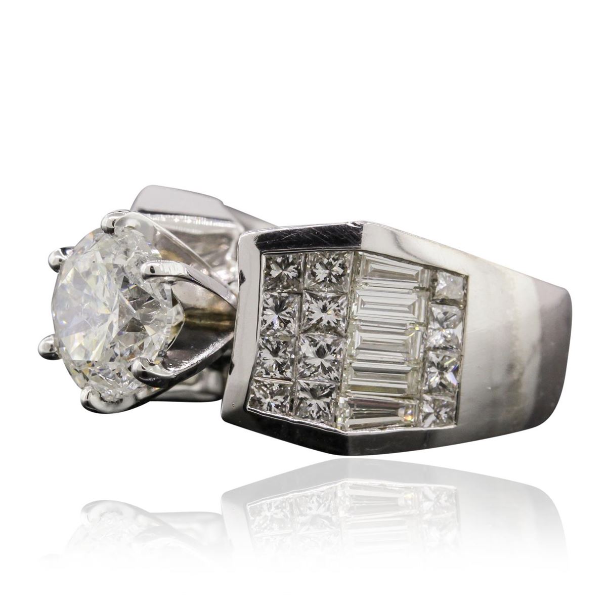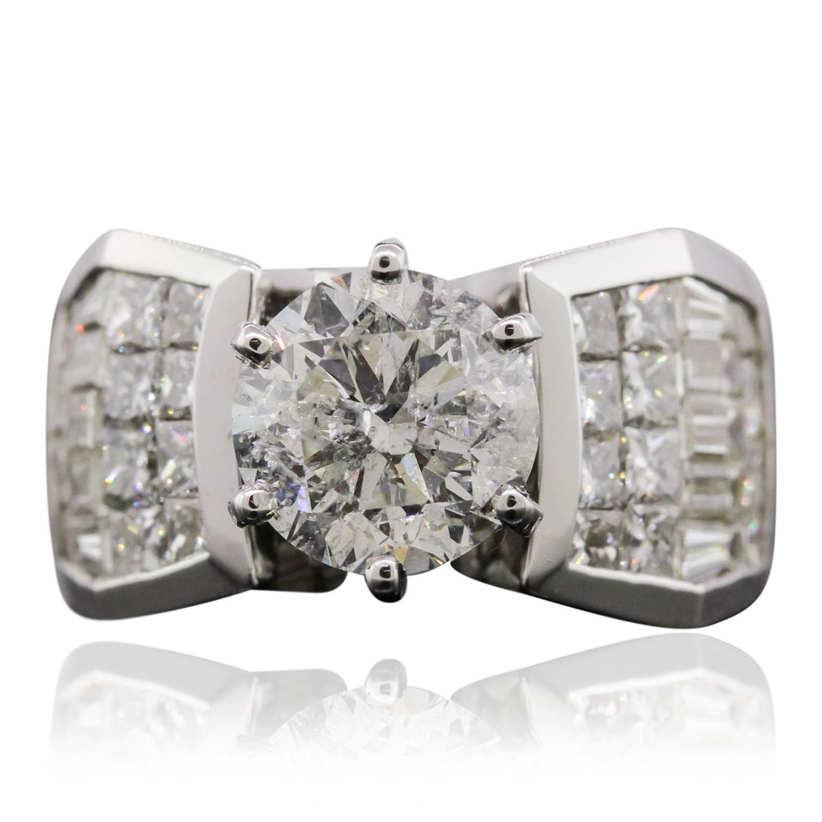 One electronically tested 18KT white gold Ladies combination cast & assembled engagement ring with a bright polish finish. Condition is new. Identified with markings of "18K". Containing: One prong set round brilliant cut diamond, measuring 8.50 - 8.50 x 5.40mm (depth est.) approximate weight of 2.38ct. Clarity: I-2. Color: J, Cut is Good. Twenty-Four invisible set princess cut diamonds, measuring 2.00 x 2.00 x 1.50mm (depth est.) approximate. Total Weight of 24 Stones = 1.18ct. Clarity: SI-1 to SI-2. Color: J - K, Cut is Good. Ten invisible set baguette cut diamonds, measuring 3.50 x 1.50 x 1.13mm (depth est.) approximate. Total Weight of 10 Stones = 0.60ct. Clarity: VS-2. Color: J - K, Cut is Good. Total Weight of Diamonds 4.16ct. Total Weight of Engagement Ring 15.30 grams. GGL Appraised at $36,070.00.
