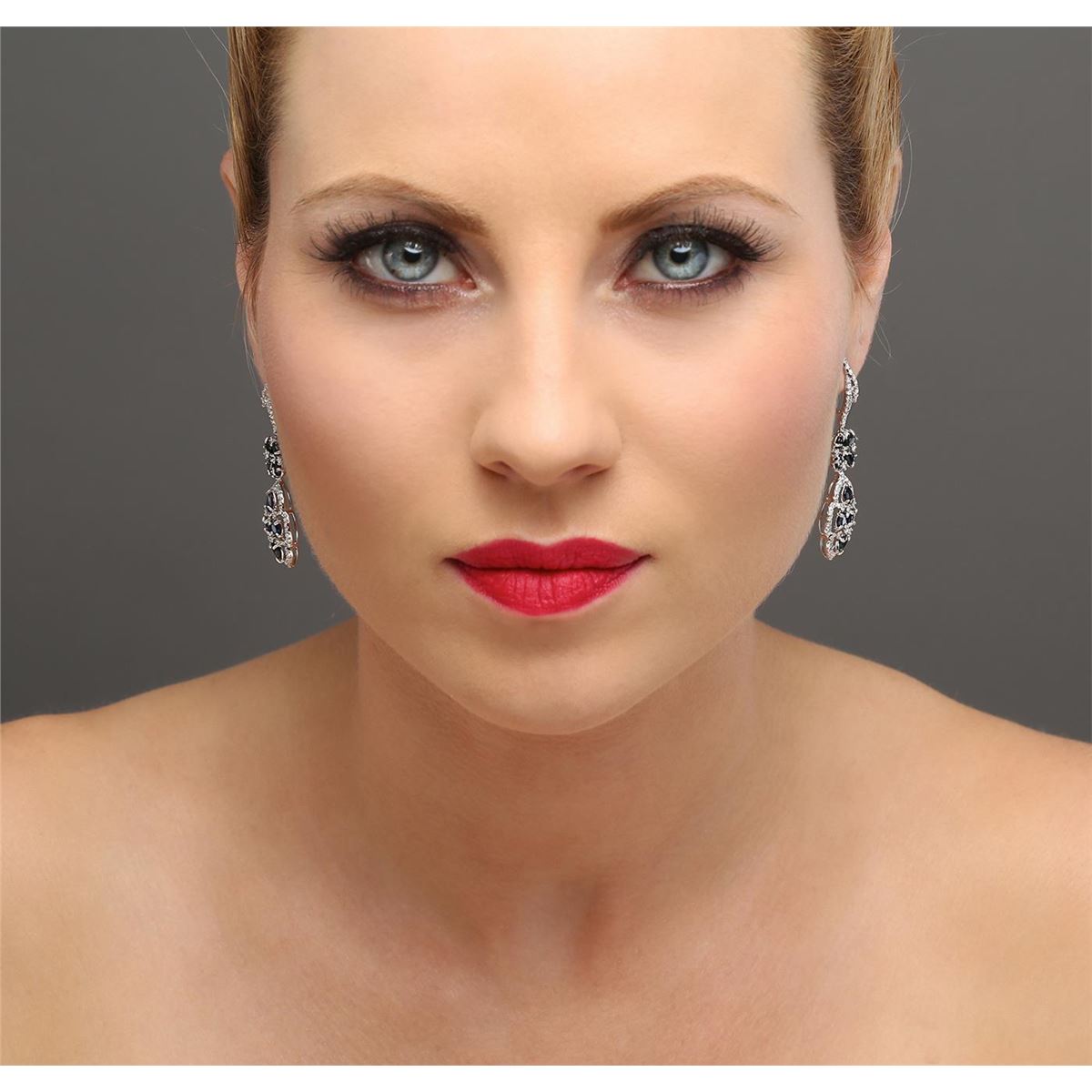 One pair of earrings featuring: 18KT white gold weighing 9.15 grams containing 16 sapphires with a total weight of 4.20ct and 128 round diamonds with a total weight of 1.27ct.