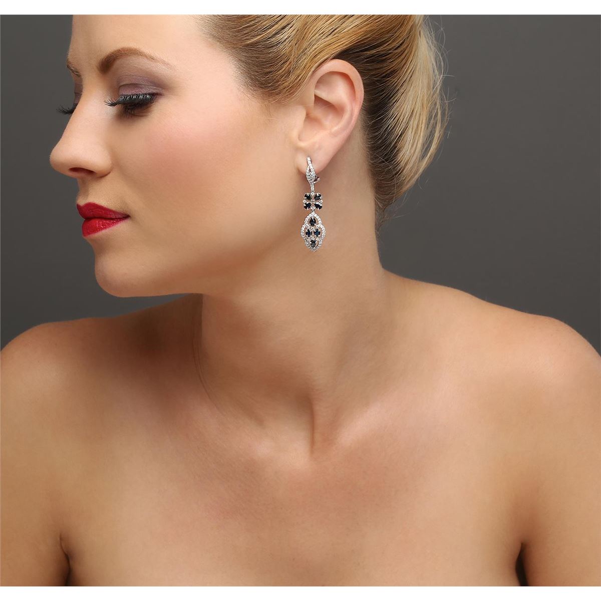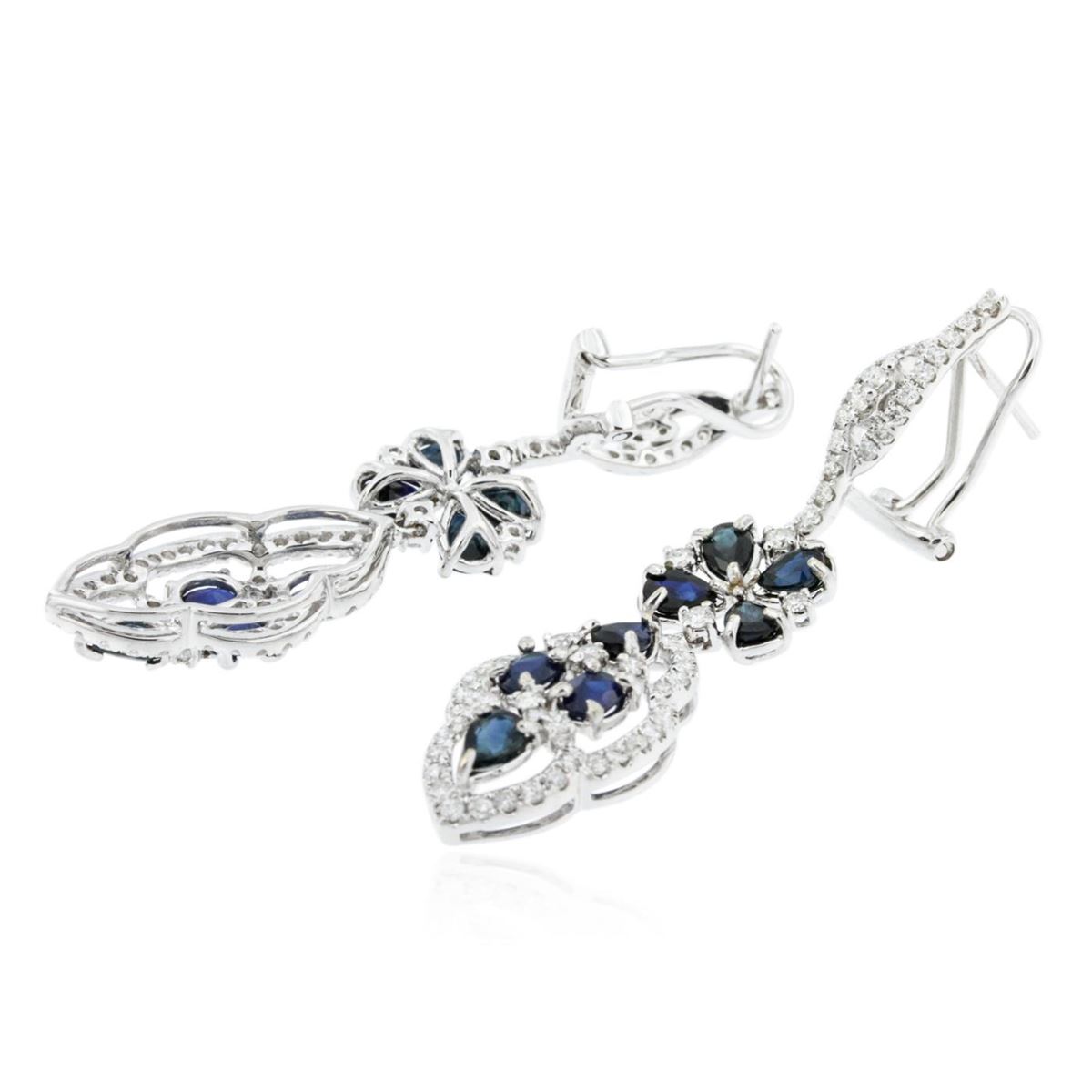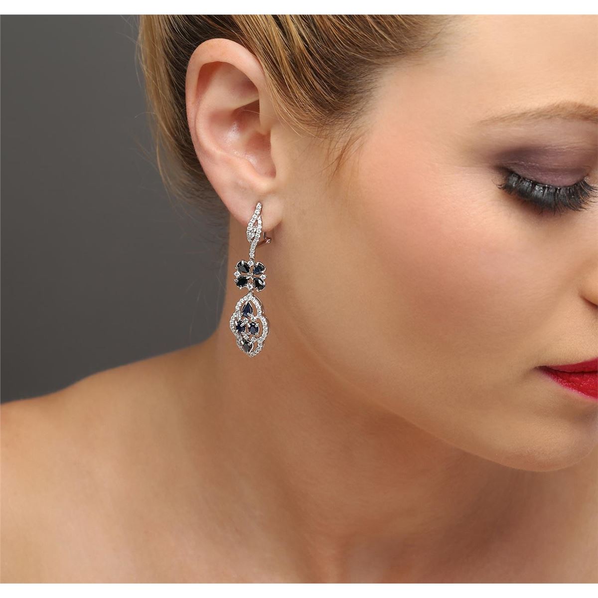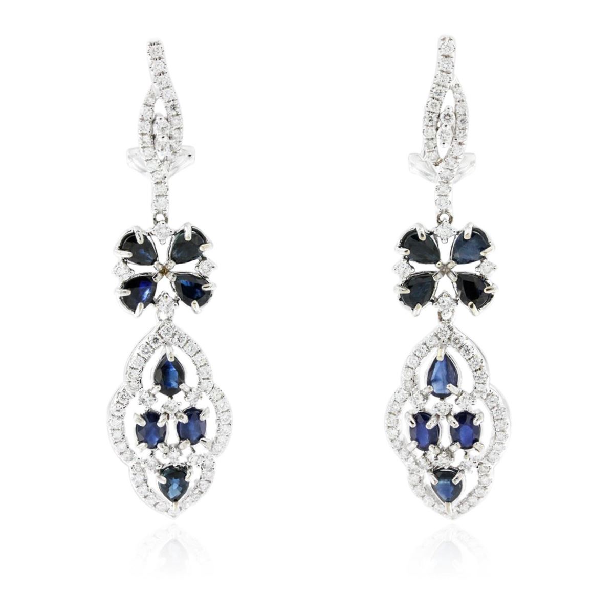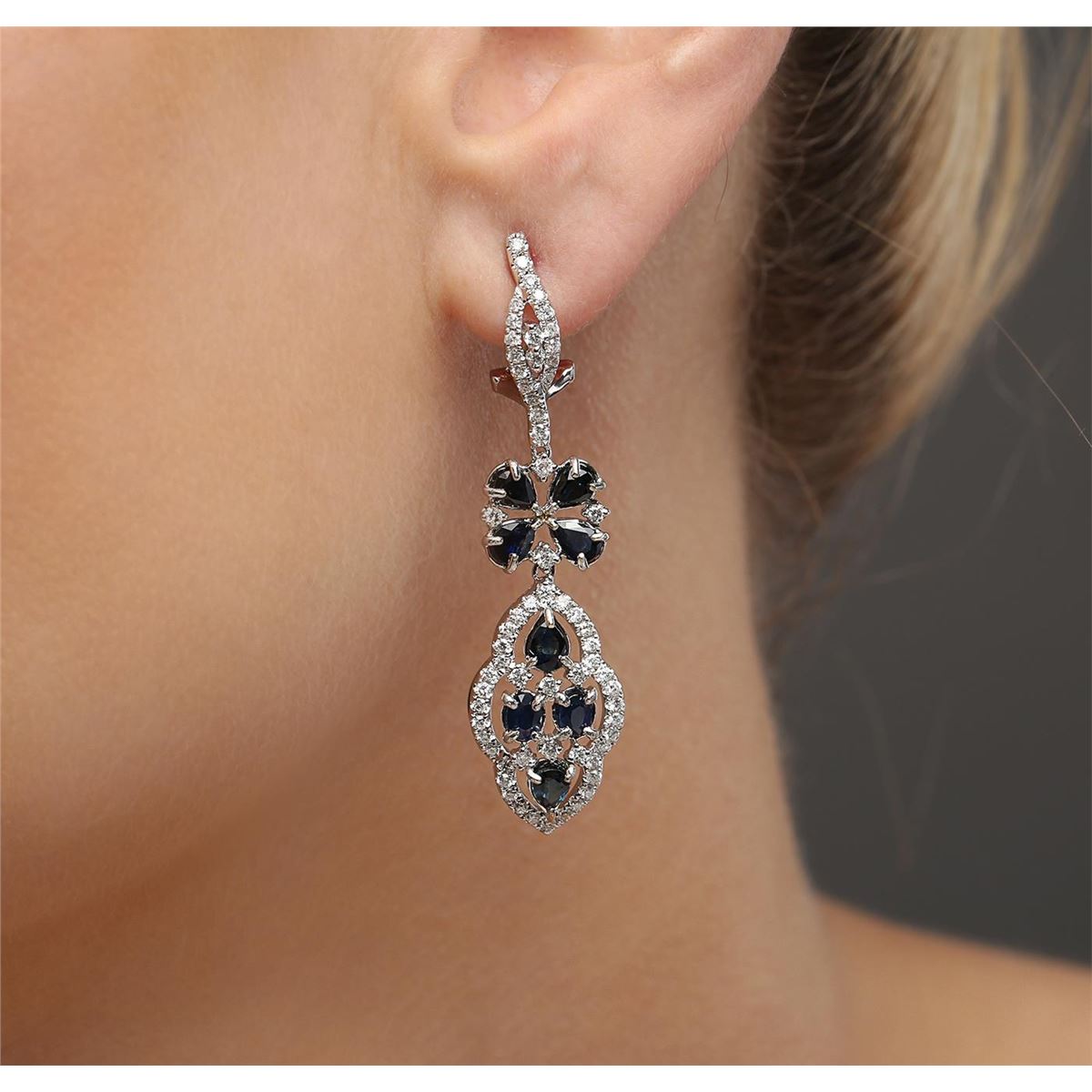 One pair of earrings featuring: 18KT white gold weighing 9.15 grams containing 16 sapphires with a total weight of 4.20ct and 128 round diamonds with a total weight of 1.27ct.