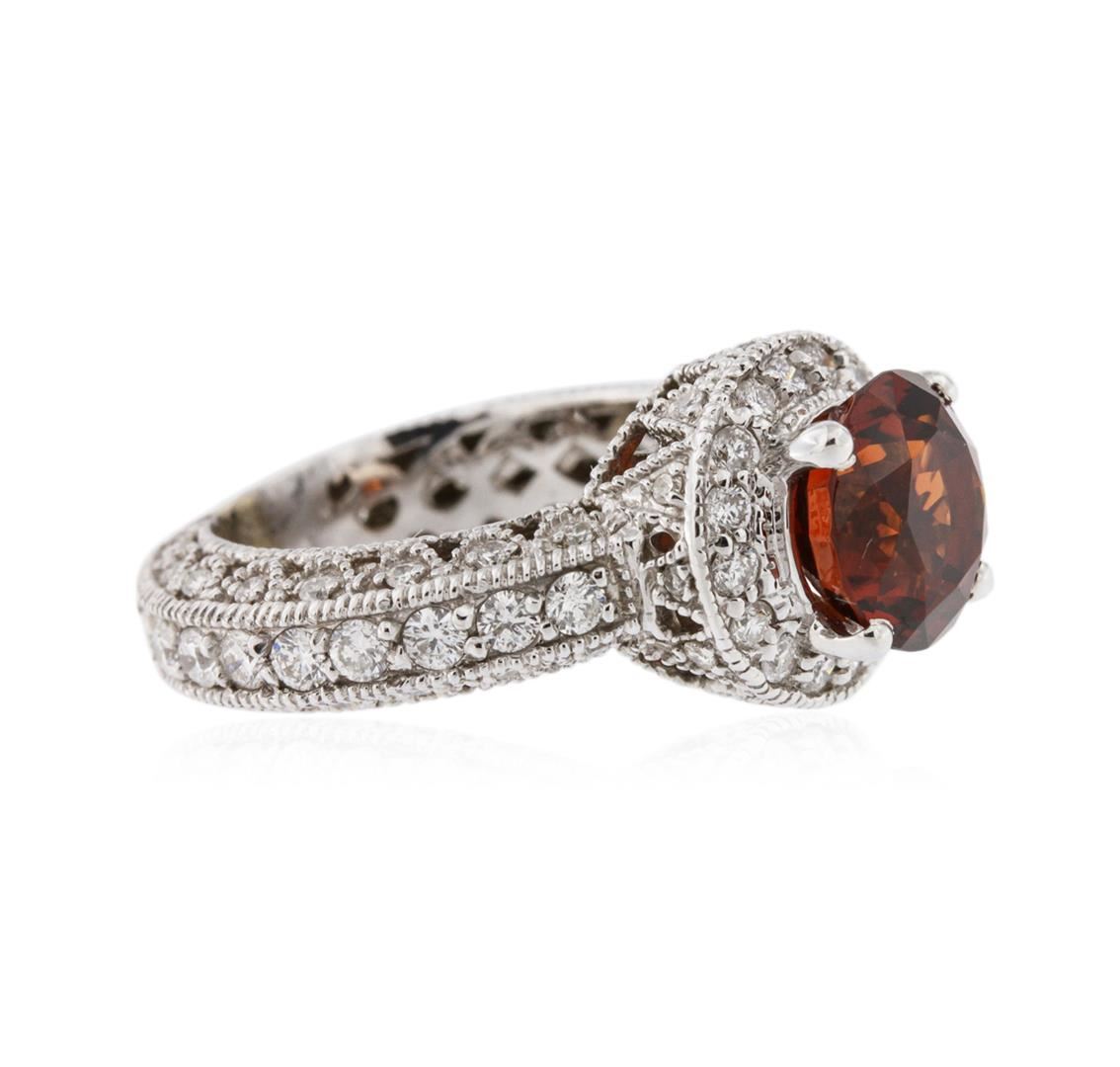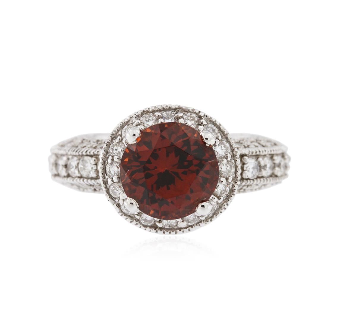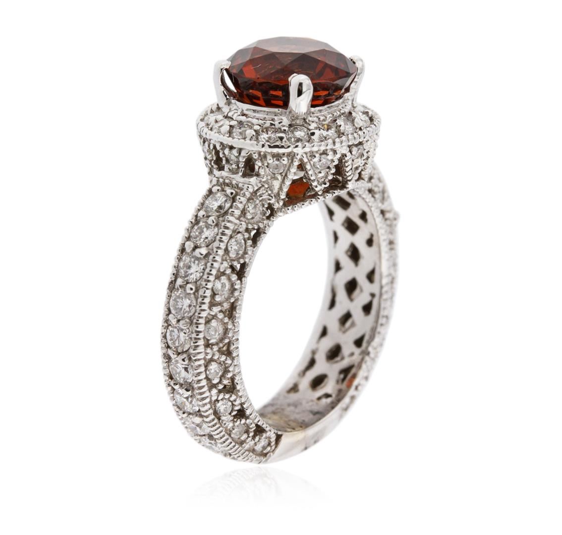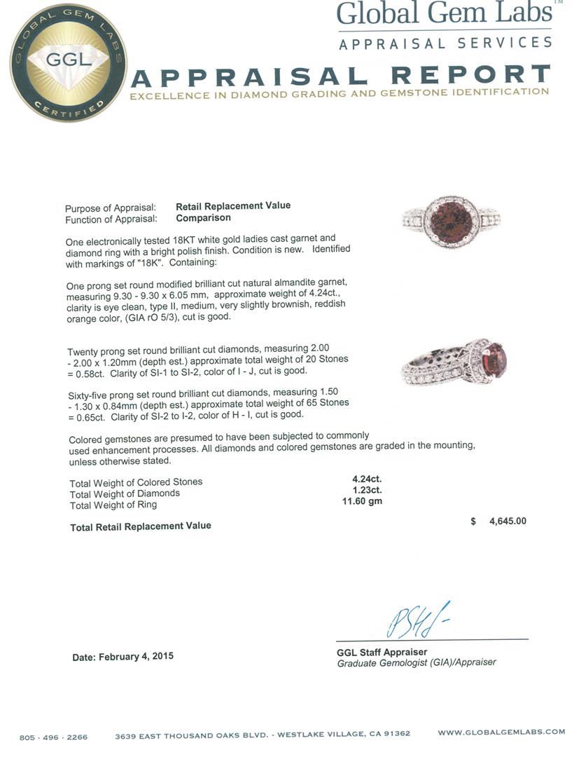 One electronically tested 18KT white gold ladies cast garnet and diamond ring with a bright polish finish. Identified with markings of "18K". Condition is new. Containing: One prong set round modified brilliant cut natural almandite garnet, measuring 9.30 - 9.30 x 6.05 mm, approximate weight of 4.24ct., clarity is eye clean, type II, medium, very slightly brownish, reddish orange color, (GIA rO 5/3), cut is good. Twenty prong set round brilliant cut diamonds, measuring 2.00 - 2.00 x 1.20mm (depth est.) approximate total weight of 20 Stones = 0.58ct. Clarity: SI-1 to SI-2. Color: I - J, Cut is Good. Sixty-Five prong set round brilliant cut diamonds, measuring 1.50 - 1.30 x 0.84mm (depth est.) approximate total weight of 65 Stones = 0.65ct. Clarity: SI-2 to I-2. Color: H - I, Cut is Good. Colored gemstones are presumed to have been subjected to commonly used enhancement processes. All diamonds and colored gemstones are graded in the mounting, unless otherwise stated. Total Weight of Colored Stones 4.24ct. Total Weight of Diamonds 1.23ct. Total Weight of Ring 11.60 grams. GGL Appraised at $4,645.00.