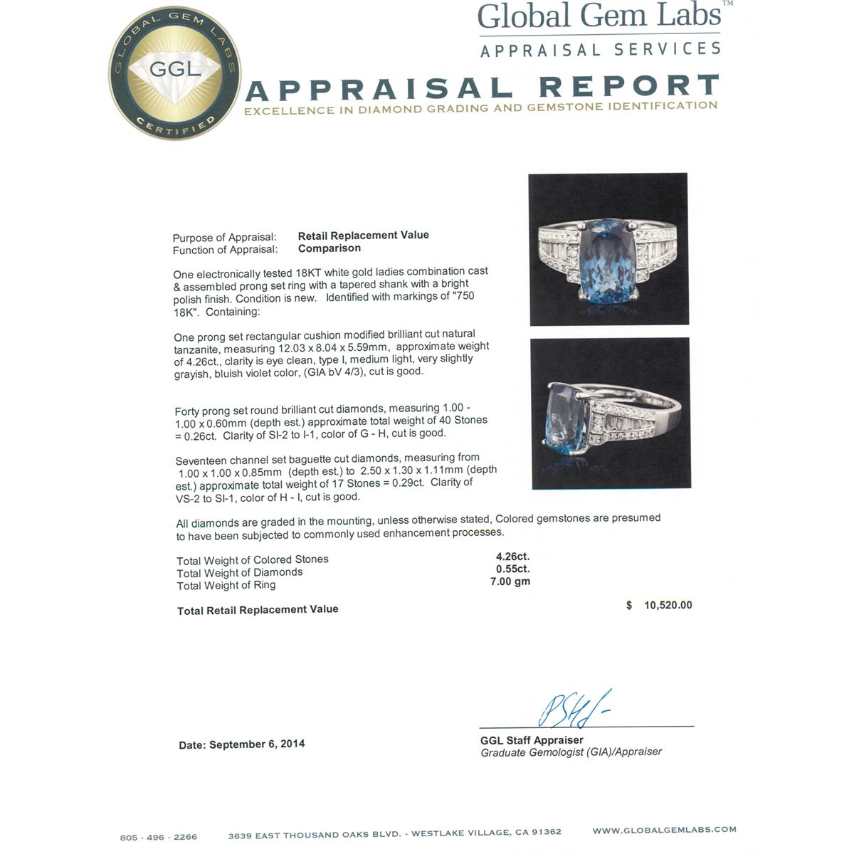 One electronically tested 18KT white gold ladies combination cast & assembled prong set ring with a tapered shank with a bright polish finish. Identified with markings of "750 18K". Condition is new. Containing: One prong set rectangular cushion modified brilliant cut natural tanzanite, measuring 12.03 x 8.04 x 5.59mm, approximate weight of 4.26ct., clarity is eye clean, type I, medium light, very slightly grayish, bluish violet color, (GIA bV 4/3), cut is good. Forty prong set round brilliant cut diamonds, measuring 1.00 - 1.00 x 0.60mm (depth est.) approximate total weight of 40 Stones = 0.26ct. Clarity: SI-2 to I-1. Color: G - H, Cut is Good. Seventeen channel set baguette cut diamonds, measuring from 1.00 x 1.00 x 0.85mm (depth est.) to 2.50 x 1.30 x 1.11mm (depth est.) approximate total weight of 17 Stones = 0.29ct. Clarity: VS-2 to SI-1. Color: H - I, Cut is Good. All diamonds are graded in the mounting, unless otherwise stated, Colored gemstones are presumed to have been subjected to commonly used enhancement processes. Total Weight of Colored Stones 4.26ct. Total Weight of Diamonds 0.55ct. Total Weight of Ring 7.00 grams. GGL Appraised at $10,520.00.