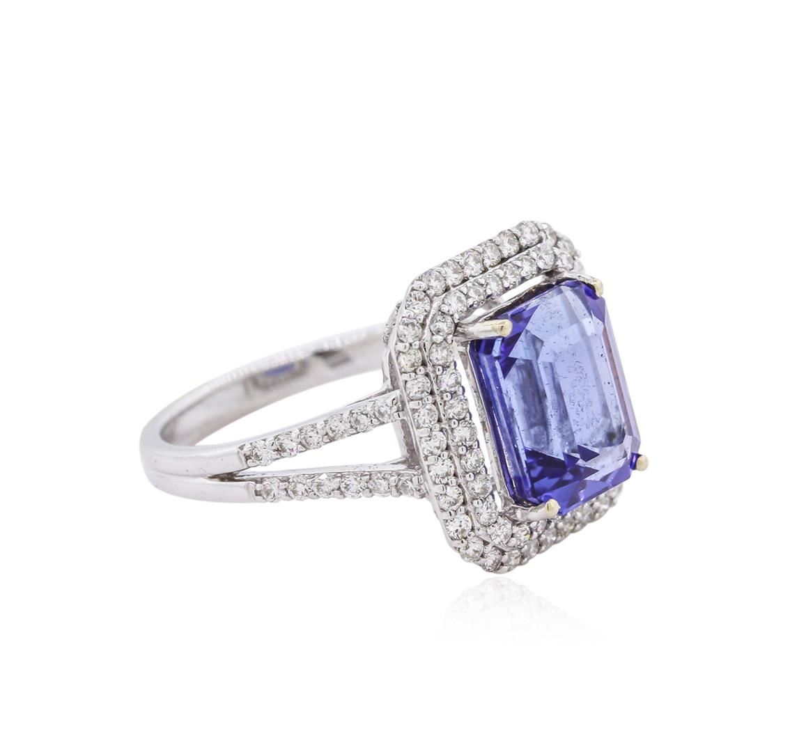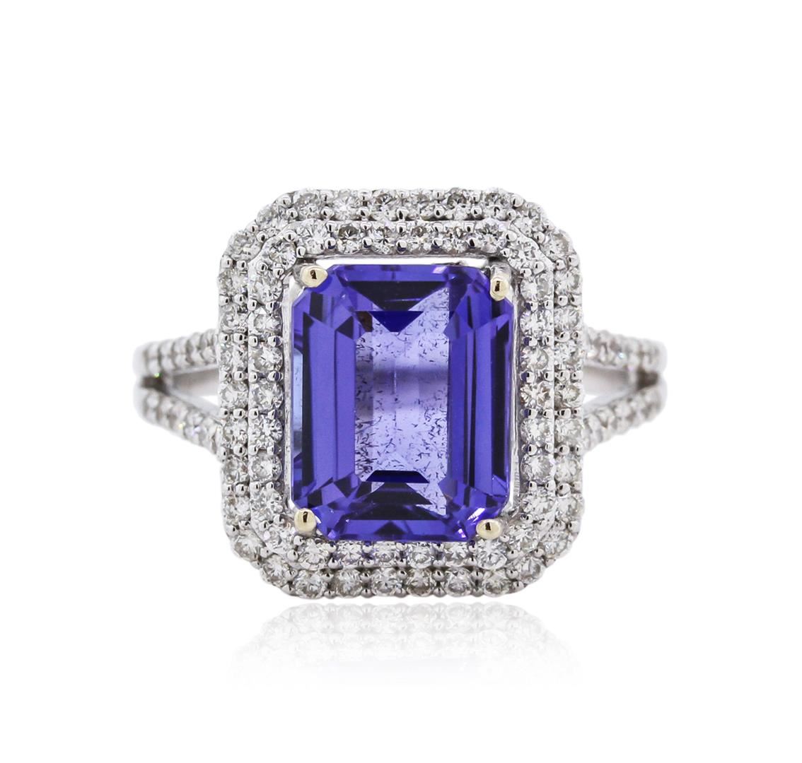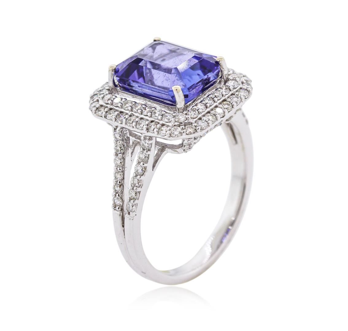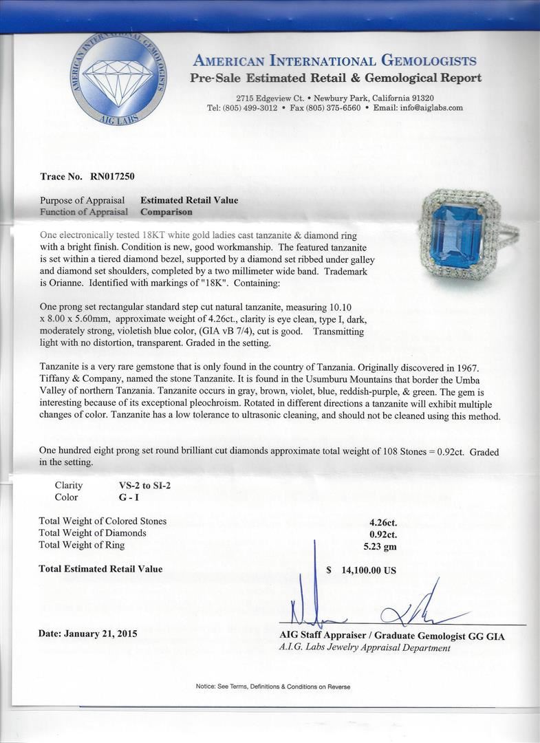 One electronically tested 18KT white gold ladies cast tanzanite & diamond ring with a bright finish. The featured tanzanite is set within a tiered diamond bezel, supported by a diamond set ribbed under galley and diamond set shoulders, completed by a two millimeter wide band. Trademark is Orianne. Identified with markings of "18K". Condition is new, good workmanship. Containing: One prong set rectangular standard step cut natural tanzanite, measuring 10.10 x 8.00 x 5.60mm, approximate weight of 4.26ct., clarity is eye clean, type I, dark, moderately strong, violetish blue color, (GIA vB 7/4), cut is good. Transmitting light with no distortion, transparent. Graded in the setting. Tanzanite is a very rare gemstone that is only found in the country of Tanzania. Originally discovered in 1967. Tiffany & Company, named the stone Tanzanite. It is found in the Usumburu Mountains that border the Umba Valley of northern Tanzania. Tanzanite occurs in gray, brown, violet, blue, reddish-purple, & green. The gem is interesting because of its exceptional pleochroism. Rotated in different directions a tanzanite will exhibit multiple changes of color. Tanzanite has a low tolerance to ultrasonic cleaning, and should not be cleaned using this method. One Hundred Eight prong set round brilliant cut diamonds approximate total weight of 108 Stones = 0.92ct. Graded in the setting. Clarity: VS-2 to SI-2. Color: G - I. Total Weight of Colored Stones 4.26ct. Total Weight of Diamonds 0.92ct. Total Weight of Ring 5.23 grams. AIG Appraised at $14,100.00.
