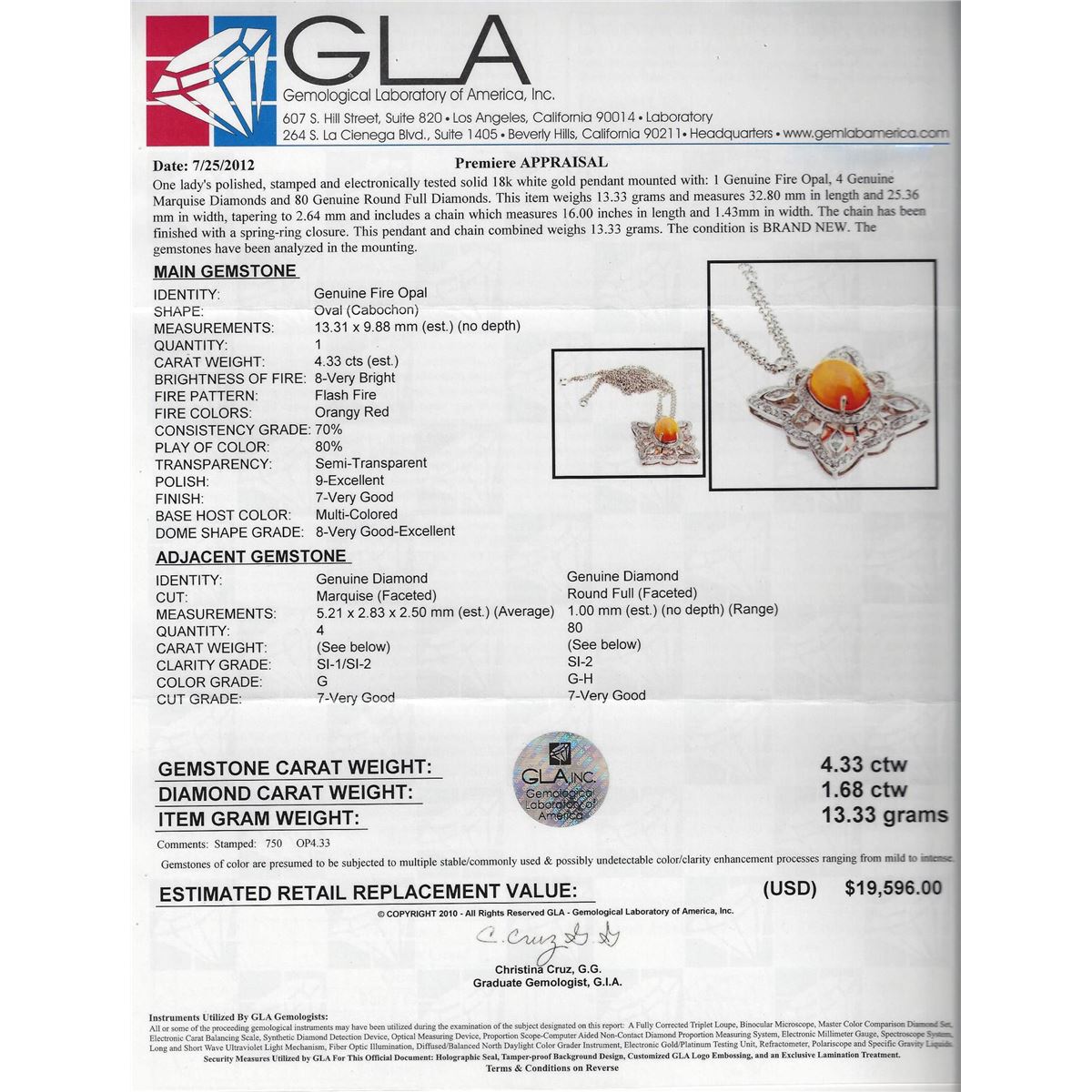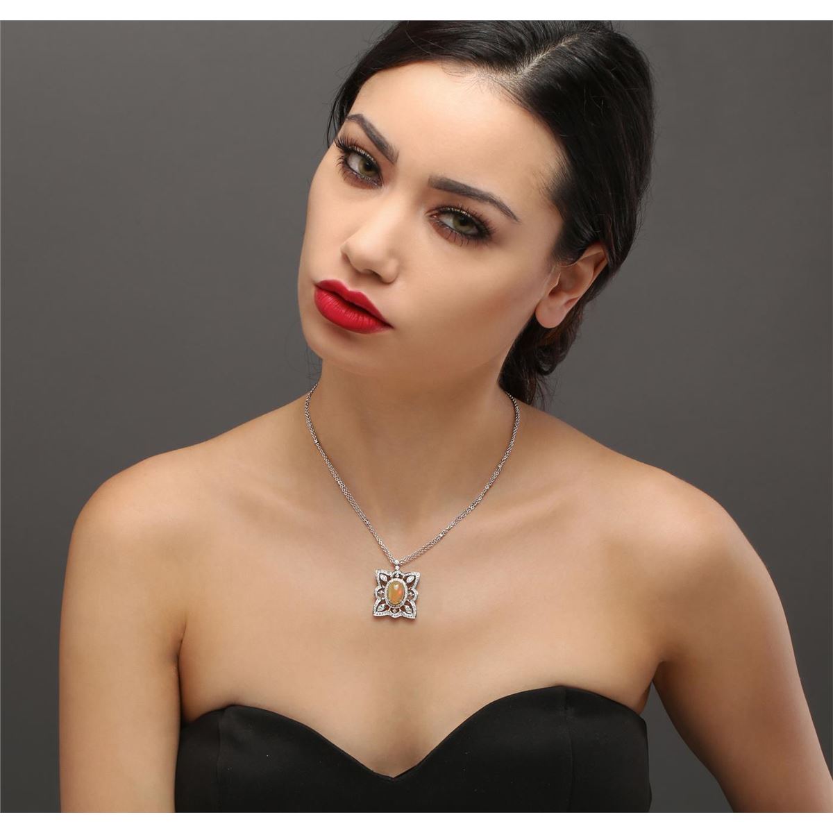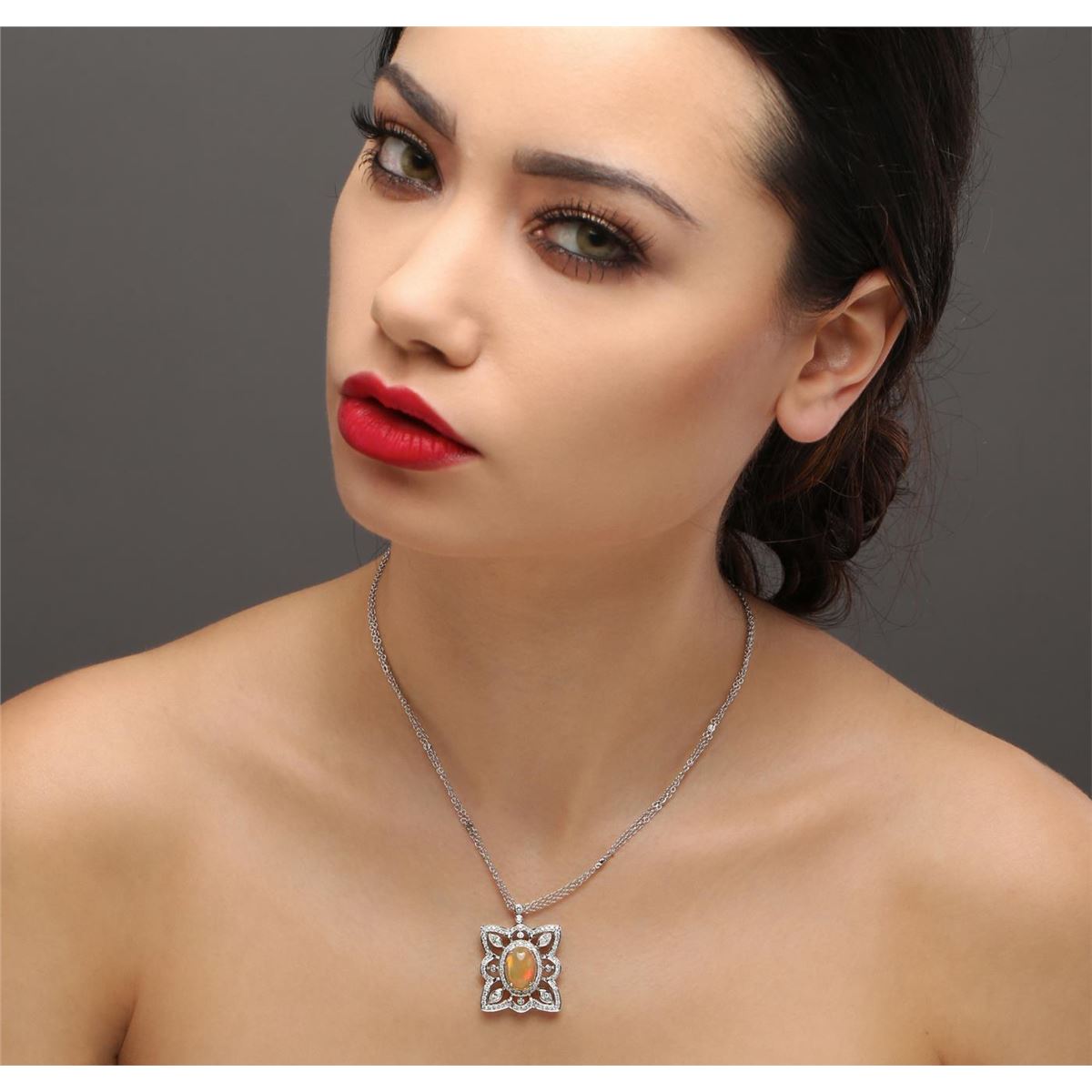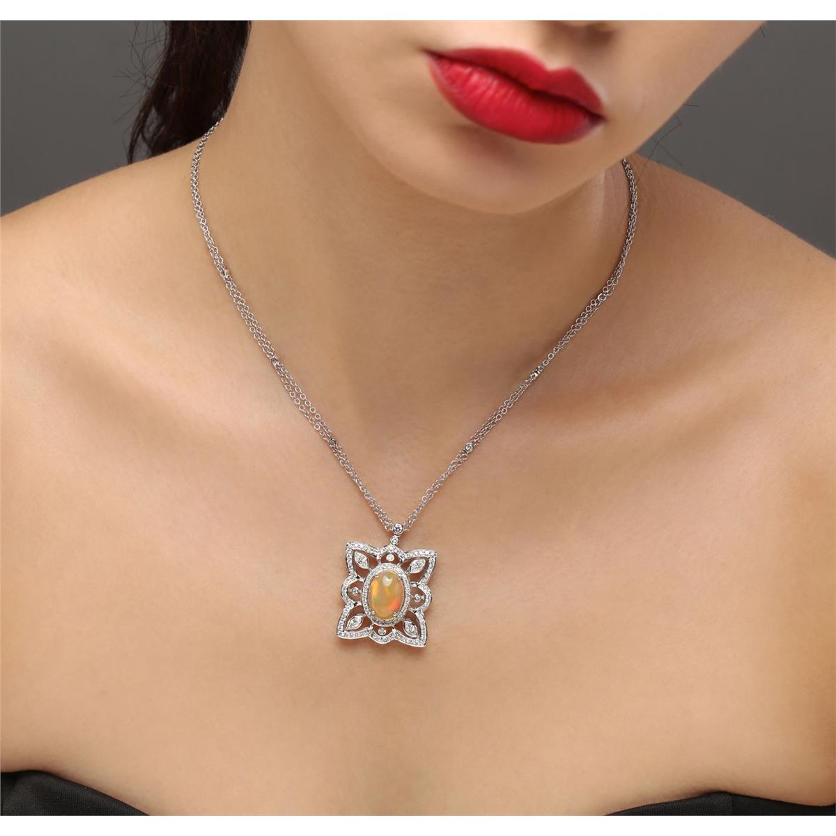 One ladies polished, stamped and electronically tested solid 18KT white gold pendant mounted with: 1 genuine fire opal with a total weight of 4.33ct, 4 genuine marquise diamonds and 80 genuine round full diamonds for a total diamond weight of 1.68ct. Measures 32.80mm in length and 25.36mm in width, tapering to 2.64mm and includes a chain which measures 16.00 inches in length and 1.43mm in width. The chain has been finished with a spring-ring closure. This pendant and chain combined weighs 13.33 grams. The condition is brand new. GLA Appraised at $19,596.00.