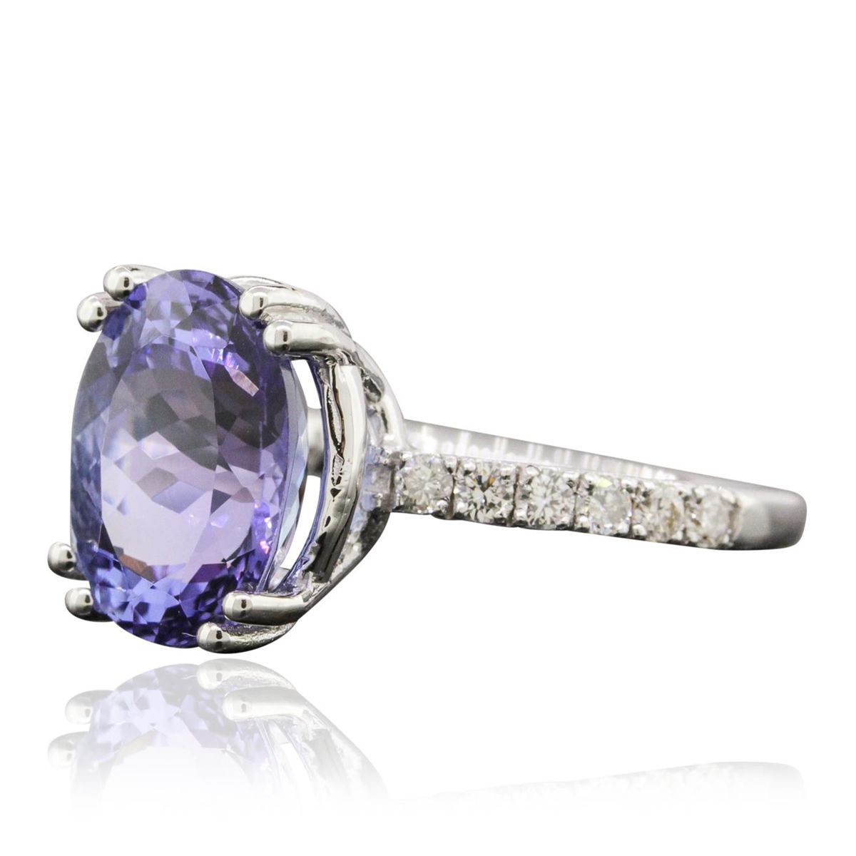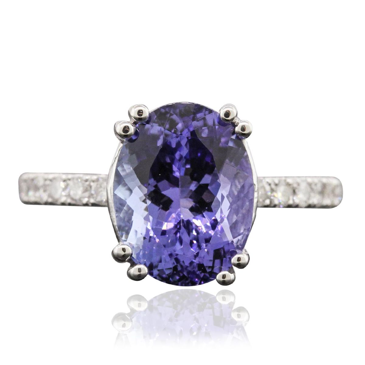 One electronically tested 18KT white gold ladies cast tanzanite and diamond ring with a bright polish finish. The featured tanzanite is supported by diamond set shoulders, completed by a one and one-half millimeter wide band. Identified with markings of "18K". Condition is new, good workmanship. Containing: One prong set oval brilliant cut natural tanzanite, measuring 11.25 x 8.60 x 6.40mm, 6%. bulge factor, approximate weight of 4.48ct., clarity is eye clean, type I, medium dark, very slightly grayish, violet color, (GIA V 6/3), cut is good. Transmitting light with no distortion, transparent. Graded in the setting. Tanzanite is a very rare gemstone that is only found in the country of Tanzania. Originally discovered in 1967. Tiffany & Company, named the stone Tanzanite. It is found in the Usumburu Mountains that border the Umba Valley of northern Tanzania. Tanzanite occurs in gray, brown, violet, blue, reddish-purple, & green. The gem is interesting because of its exceptional pleochroism. Rotated in different directions a tanzanite will exhibit multiple changes of color. Tanzanite has a low tolerance to ultrasonic cleaning, and should not be cleaned using this method. Twelve prong set round brilliant cut diamonds, measuring 1.80 - 1.70 x 1.05mm (depth est.) approximate total weight of 12 Stones = 0.33ct. Graded in the setting. Clarity: SI-2 to I-1. Color: G - H. Total Weight of Colored Stones 4.48ct. Total Weight of Diamonds 0.33ct. Total Weight of Ring 3.79 grams. AIG Appraised at $12,610.00.