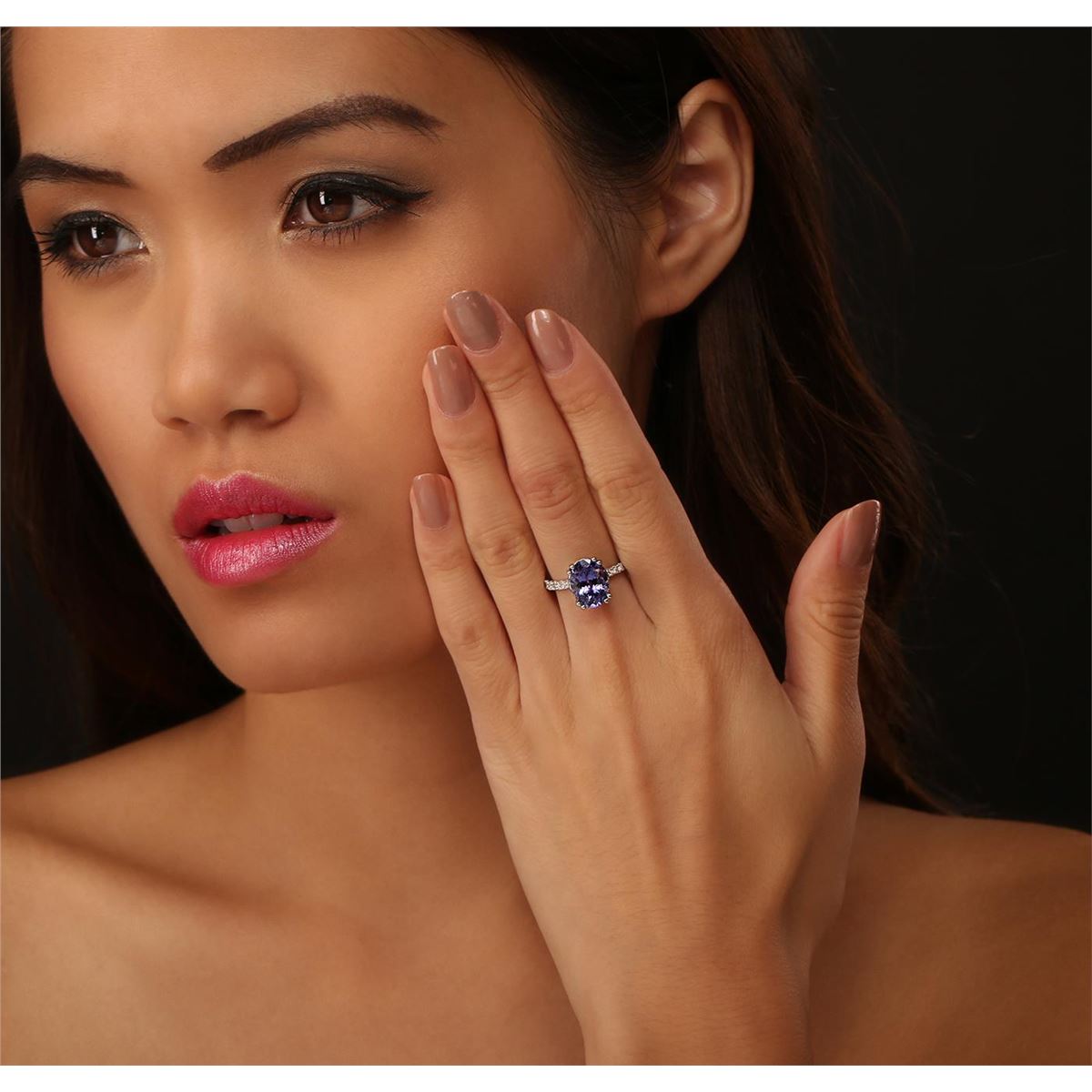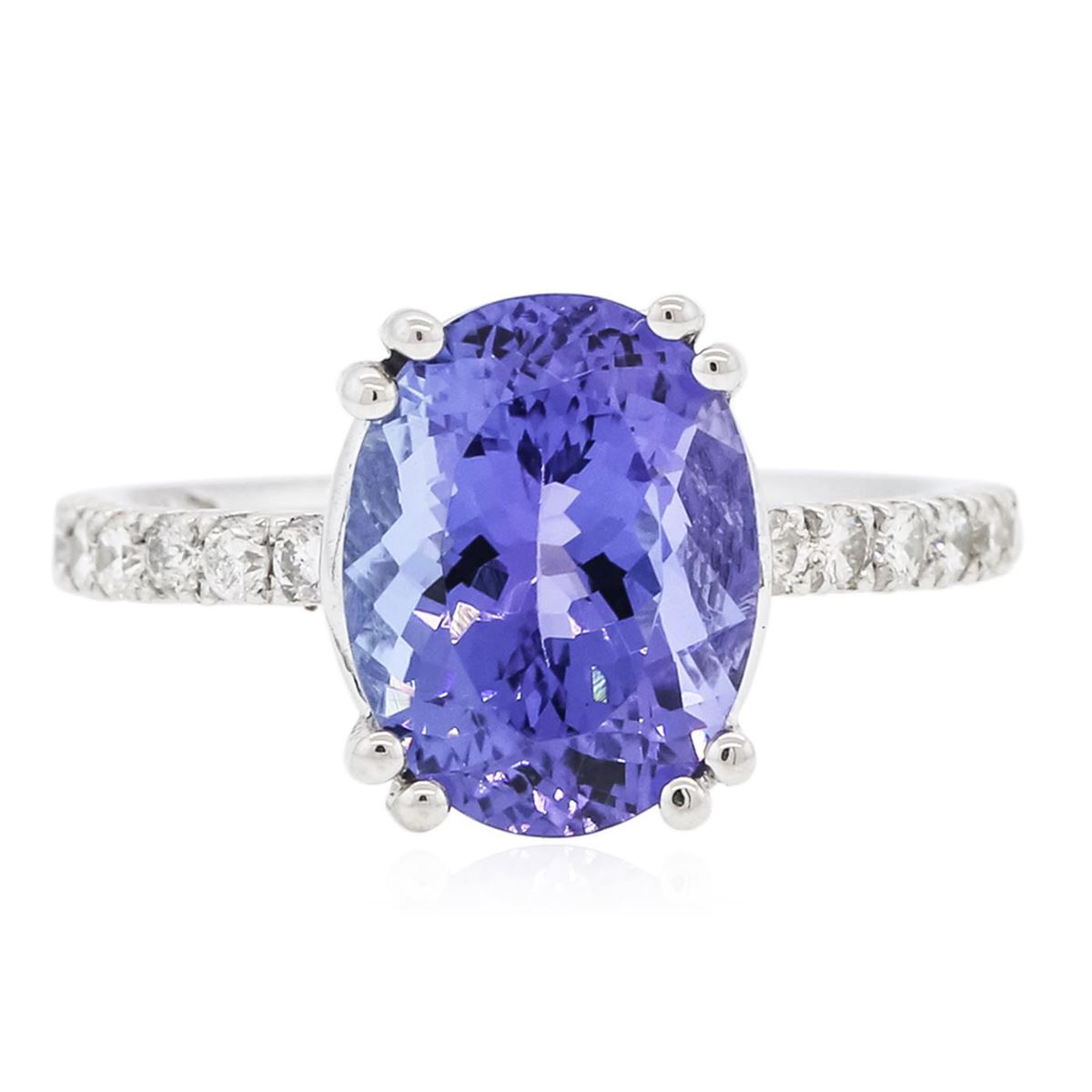 One electronically tested 18KT white gold ladies cast tanzanite and diamond ring with a bright polish finish. The featured tanzanite is supported by diamond set shoulders, completed by a one and one-half millimeter wide band. Identified with markings of "18K". Condition is new, good workmanship. Containing: One prong set oval brilliant cut natural tanzanite, measuring 11.25 x 8.60 x 6.40mm, 6%. bulge factor, approximate weight of 4.48ct., clarity is eye clean, type I, medium dark, very slightly grayish, violet color, (GIA V 6/3), cut is good. Transmitting light with no distortion, transparent. Graded in the setting. Tanzanite is a very rare gemstone that is only found in the country of Tanzania. Originally discovered in 1967. Tiffany & Company, named the stone Tanzanite. It is found in the Usumburu Mountains that border the Umba Valley of northern Tanzania. Tanzanite occurs in gray, brown, violet, blue, reddish-purple, & green. The gem is interesting because of its exceptional pleochroism. Rotated in different directions a tanzanite will exhibit multiple changes of color. Tanzanite has a low tolerance to ultrasonic cleaning, and should not be cleaned using this method. Twelve prong set round brilliant cut diamonds, measuring 1.80 - 1.70 x 1.05mm (depth est.) approximate total weight of 12 Stones = 0.33ct. Graded in the setting. Clarity: SI-2 to I-1. Color: G - H. Total Weight of Colored Stones 4.48ct. Total Weight of Diamonds 0.33ct. Total Weight of Ring 3.79 grams. AIG Appraised at $12,610.00.