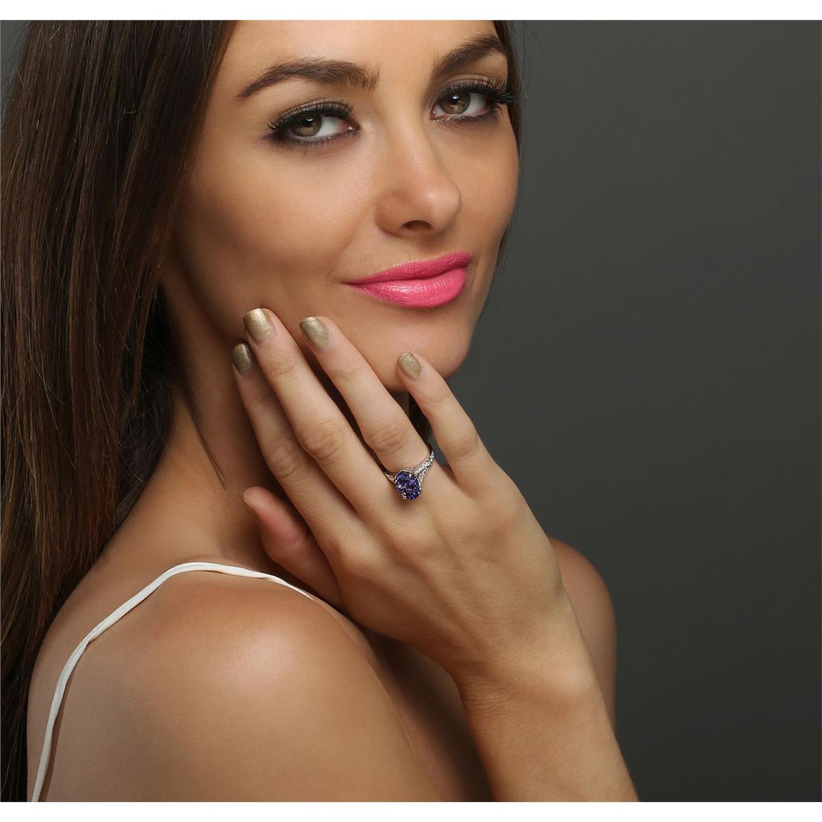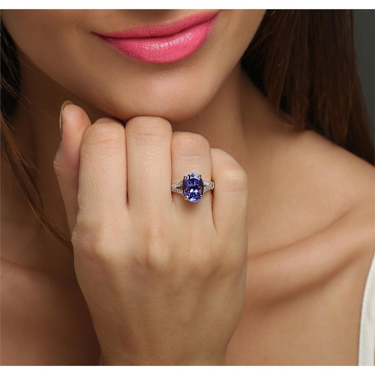 One electronically tested 18KT white gold ladies combination cast & assembled prong set ring with a split shank with a bright polish finish. Identified with markings of "750 18K". Condition is new. Containing: One prong set oval modified brilliant cut natural tanzanite, measuring 11.84 x 8.17 x 6.76mm, approximate weight of 4.53ct., clarity is eye clean, type I, medium light, moderately strong, violet color, (GIA V 4/4), cut is good. Twenty-Four prong set round brilliant cut diamonds, measuring 1.60 - 1.10 x 0.81mm (depth est.) approximate total weight of 24 Stones = 0.28ct. Clarity: SI-2. Color: H - I, Cut is Good. Two bezel set triangle cut diamonds, measuring 1.70 x 1.70 x 1.05mm (depth est.) approximate total weight of 2 Stones = 0.07ct. Clarity: SI-1. Color: I, Cut is Good. All diamonds are graded in the mounting, unless otherwise stated, Colored gemstones are presumed to have been subjected to commonly used enhancement processes. Total Weight of Colored Stones 4.53ct. Total Weight of Diamonds 0.35ct. Total Weight of Ring 5.00 grams. GGL Appraised at $9,155.00.