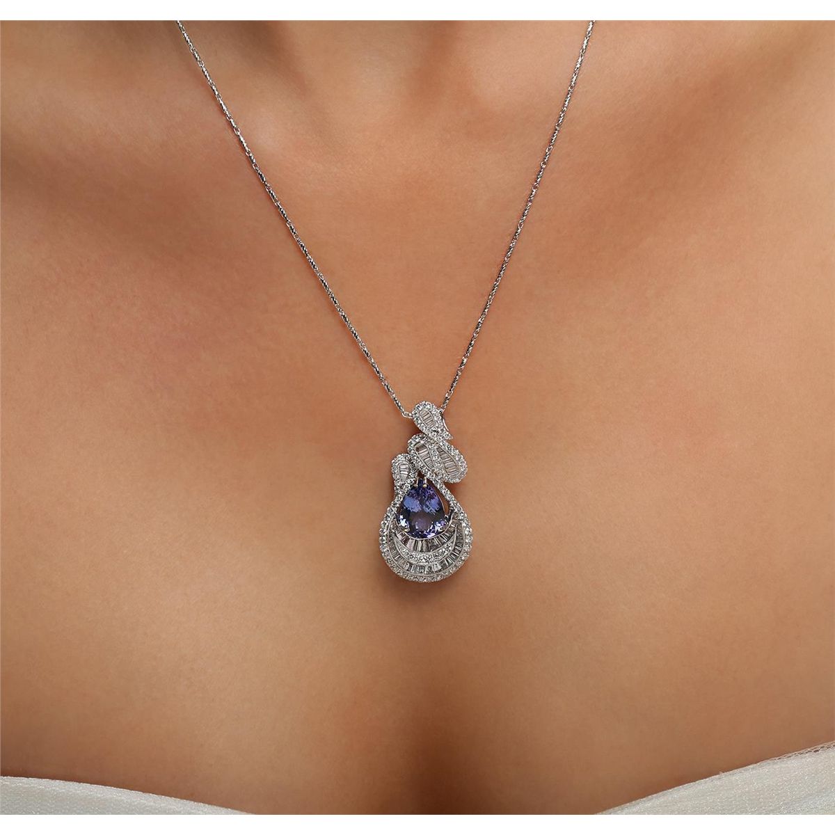 One electronically tested 18KT White Gold ladies cast & assembled tanzanite and diamond pendant with chain. The pendant features a tanzanite set within intertwining diamond ribbons, completed by a diamond set hidden bail. The pendant is supported by an eighteen inch length 14KT White Gold designer style chain, terminating in a lobster claw clasp. Bright polish finish with milgrain detailing. Identified with markings of "18K 750". Condition is new, good workmanship. Containing: One prong set pear brilliant cut natural tanzanite, measuring 12.50 x 8.80 x 5.70mm, 8% bulge factor, approximate weight of 4.54ct., clarity is eye clean, type I, medium dark, very slightly grayish, bluish violet color, (GIA bV 6/3), cut is good. Transmitting light with no distortion, transparent. Graded in the setting. Tanzanite is a very rare gemstone that is only found in the country of Tanzania. Originally discovered in 1967. Tiffany & Company, named the stone Tanzanite. It is found in the Usumburu Mountains that border the Umba Valley of northern Tanzania. Tanzanite occurs in gray, brown, violet, blue, reddish-purple, & green. The gem is interesting because of its exceptional pleochroism. Rotated in different directions a tanzanite will exhibit multiple changes of color. Tanzanite has a low tolerance to ultrasonic cleaning, and should not be cleaned using this method. One Hundred Forty-Seven prong and channel set round brilliant & baguette cut diamonds approximate total weight of 147 Stones = 2.37ct. Graded in the setting. Clarity: VS-1 to SI-1. Color: G - I. Total Weight of Colored Stones 4.54ct. Total Weight of Diamonds 2.37ct. Total Weight of Pendant With Chain 10.38 grams. AIG Appraised at $21,990.00.