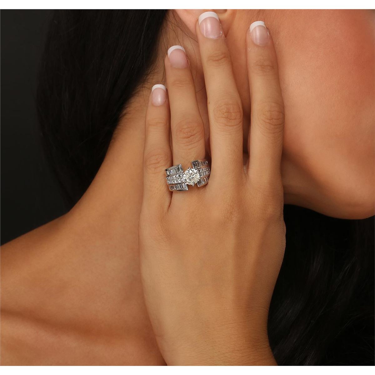 One electronically tested 18KT white gold Ladies combination cast & assembled engagement ring with a bright polish finish. Condition is new. Containing: One prong set round brilliant cut diamond, measuring 8.20 - 8.10 x 5.00mm (depth est.) approximate weight of 2.03ct. Clarity: I-2. Color: J, Cut is Good. Twenty-Four invisible set princess cut diamonds, measuring 2.00 x 2.00 x 1.51mm (depth est.) approximate. Total Weight of 24 Stones = 1.19ct. Clarity: SI-2. Color: I - J, Cut is Good. Thirty-Two channel set baguette cut diamonds, measuring from 2.00 x 1.50 x 1.28mm (depth est.) to 2.80 x 1.50 x 1.28mm (depth est.) approximate. Total Weight of 32 Stones = 1.35ct. Clarity: VS-2. Color: H - I, Cut is Good. Total Weight of Diamonds 4.56ct. Total Weight of Engagement Ring 16.30 grams. GGL Appraised at $34,580.00.