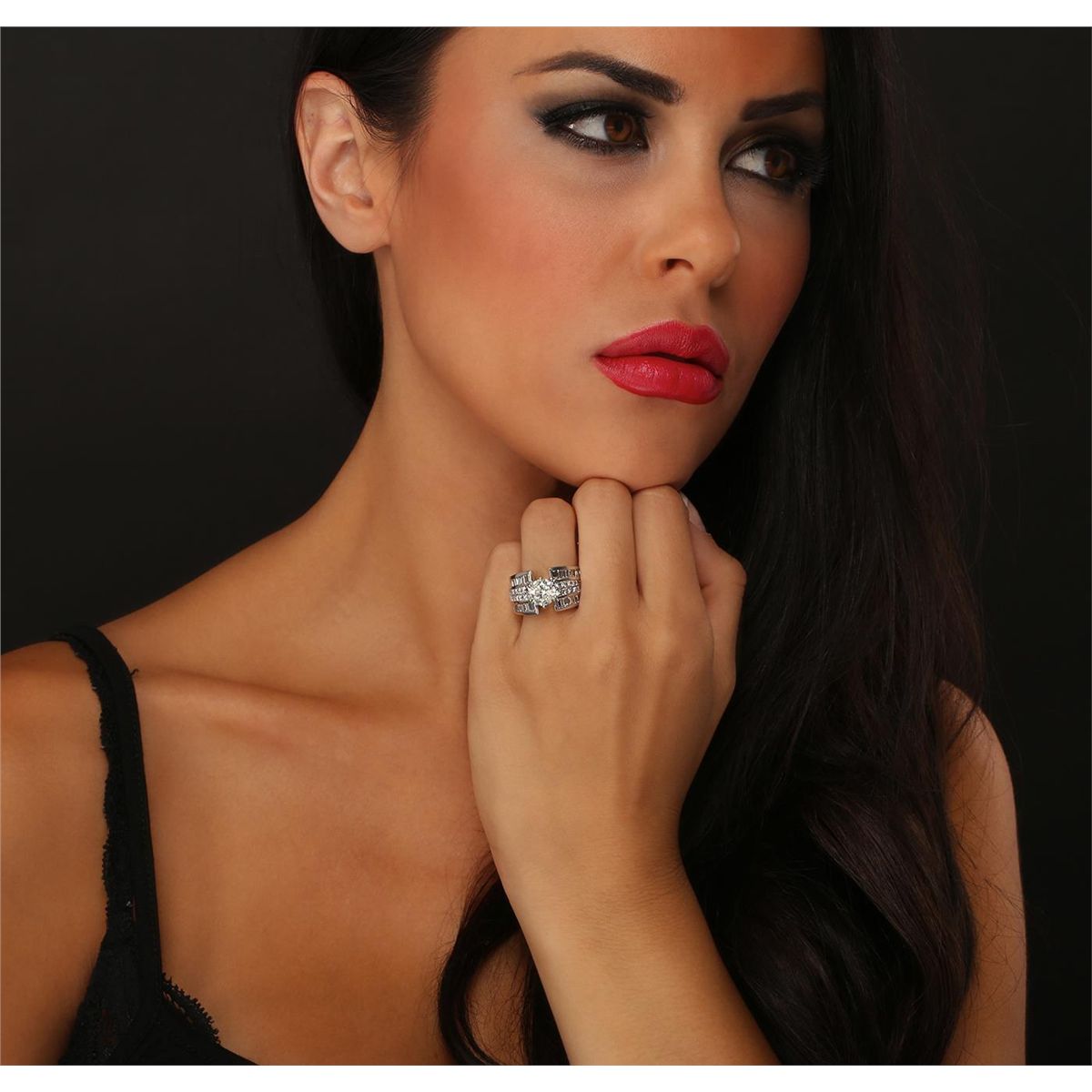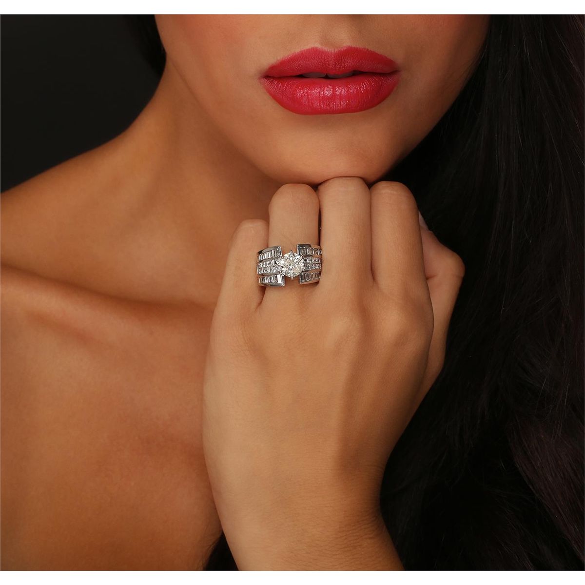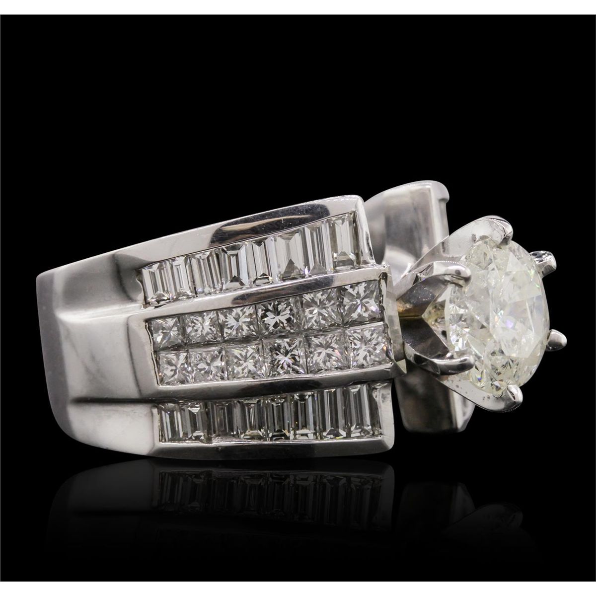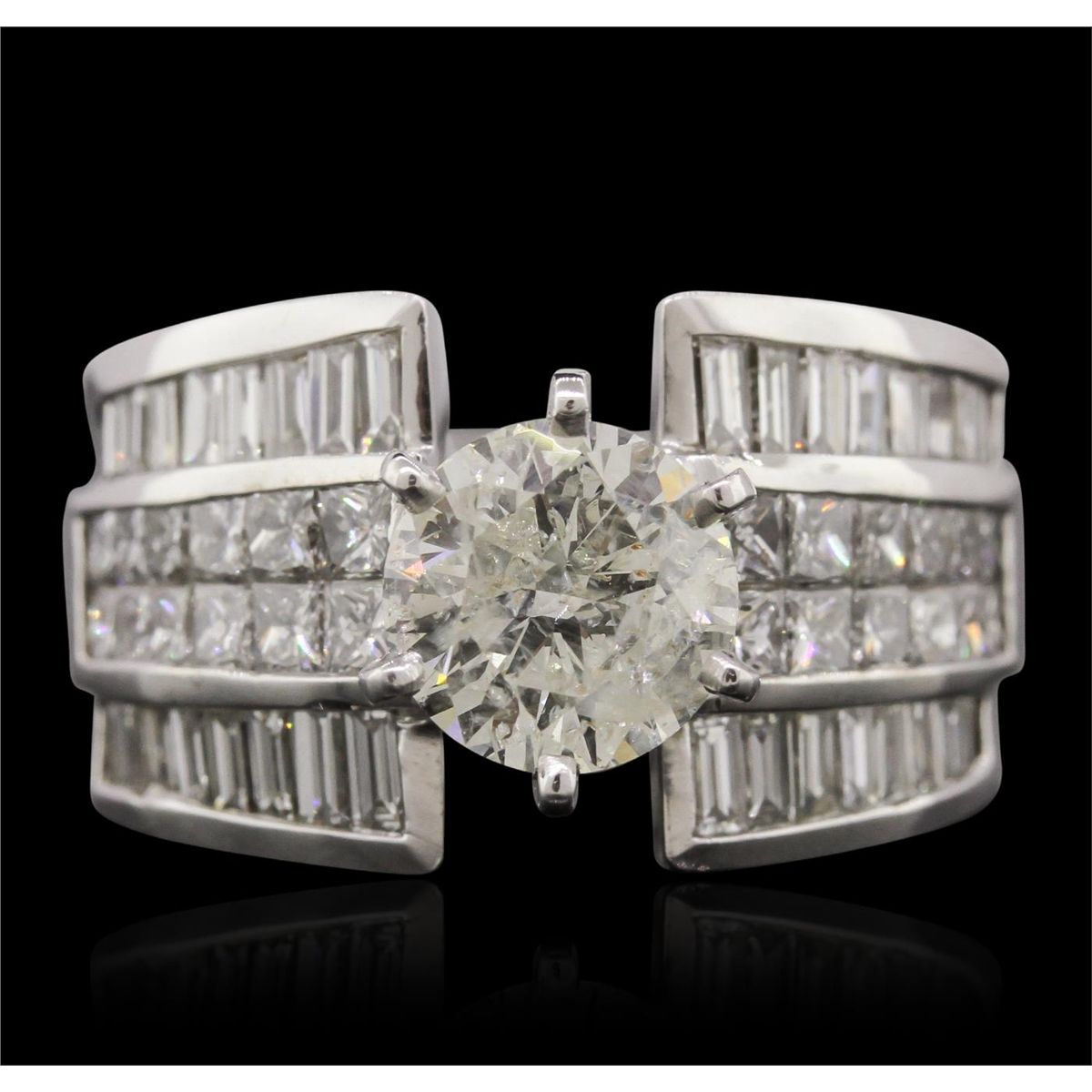 One electronically tested 18KT white gold Ladies combination cast & assembled engagement ring with a bright polish finish. Condition is new. Containing: One prong set round brilliant cut diamond, measuring 8.20 - 8.10 x 5.00mm (depth est.) approximate weight of 2.03ct. Clarity: I-2. Color: J, Cut is Good. Twenty-Four invisible set princess cut diamonds, measuring 2.00 x 2.00 x 1.51mm (depth est.) approximate. Total Weight of 24 Stones = 1.19ct. Clarity: SI-2. Color: I - J, Cut is Good. Thirty-Two channel set baguette cut diamonds, measuring from 2.00 x 1.50 x 1.28mm (depth est.) to 2.80 x 1.50 x 1.28mm (depth est.) approximate. Total Weight of 32 Stones = 1.35ct. Clarity: VS-2. Color: H - I, Cut is Good. Total Weight of Diamonds 4.56ct. Total Weight of Engagement Ring 16.30 grams. GGL Appraised at $34,580.00.