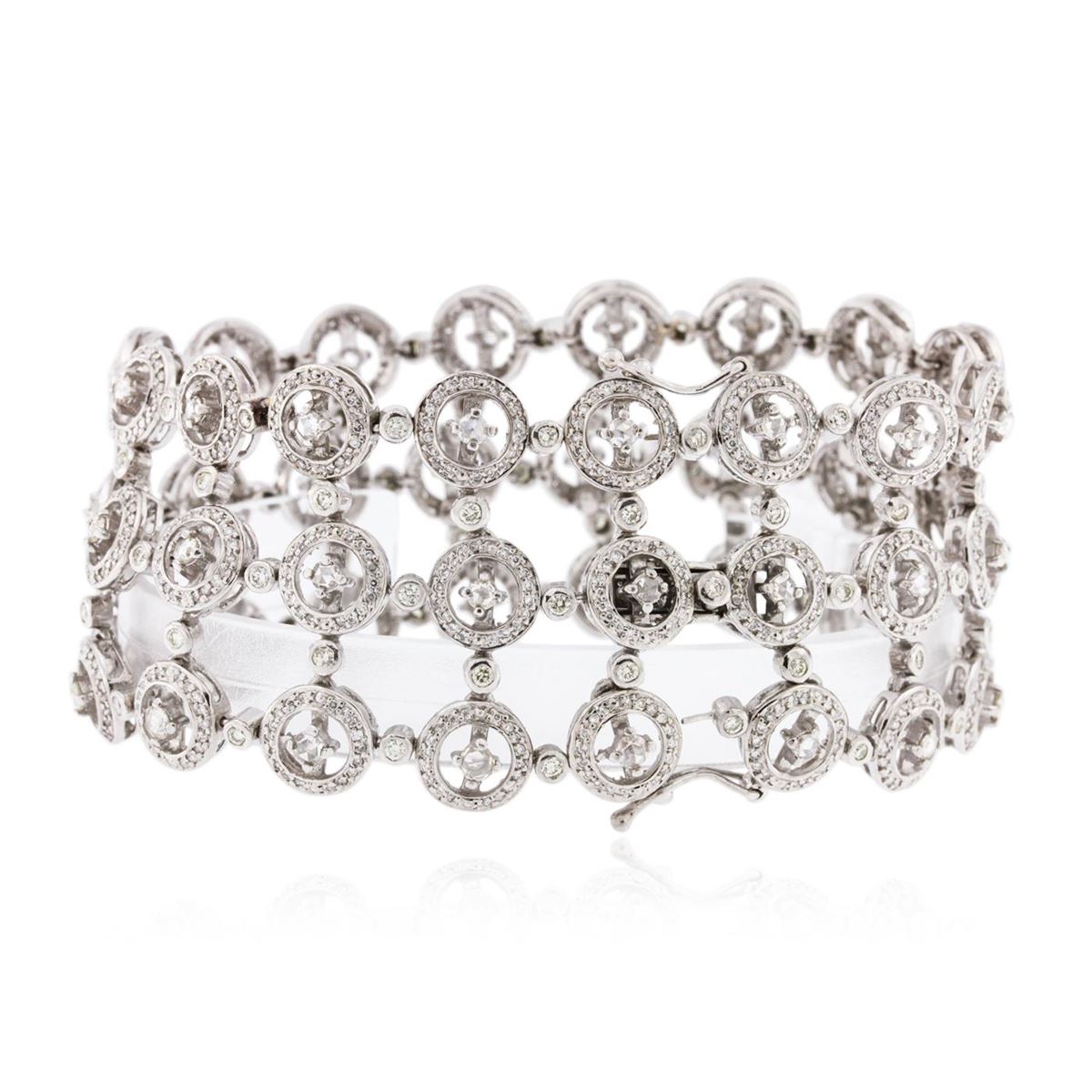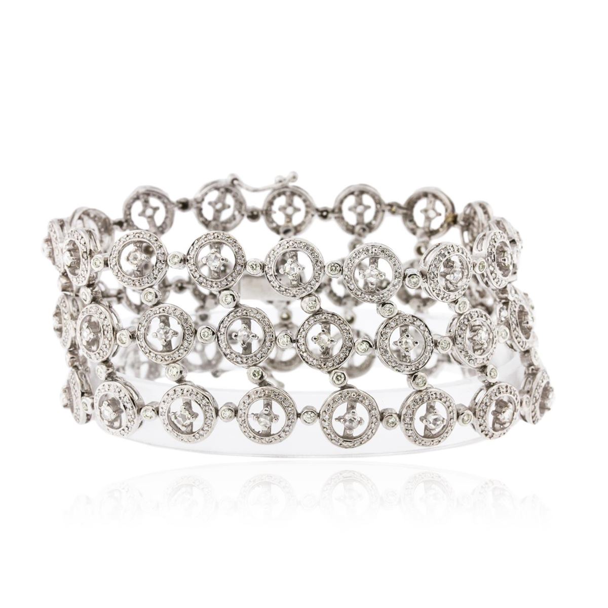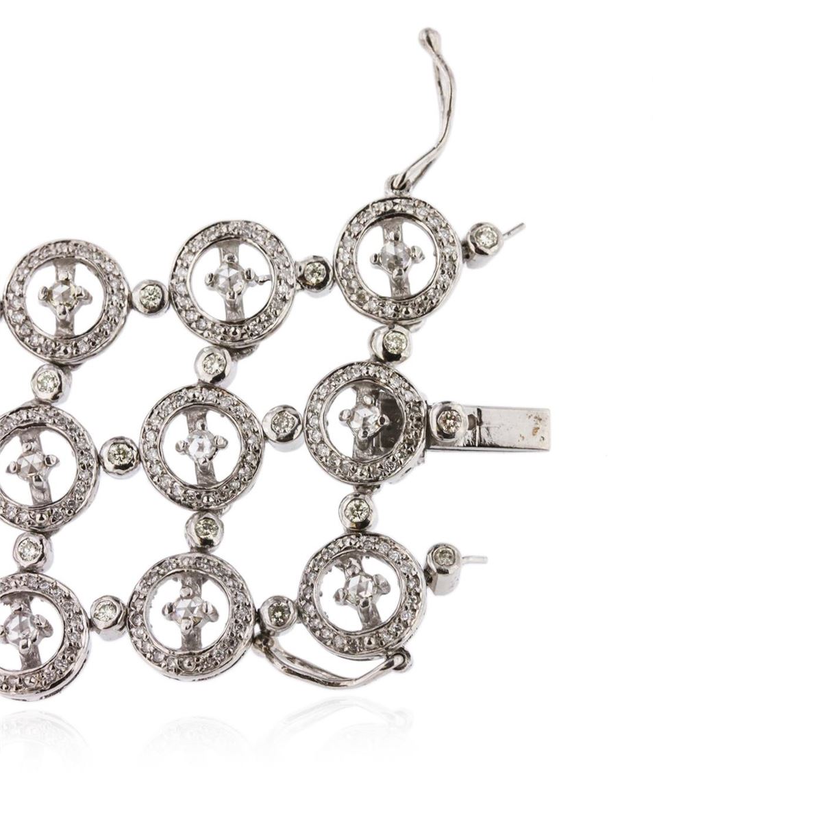 One electronically tested 18KT White Gold ladies cast & assembled diamond bracelet with a bright polish finish. Condition is good. Seven and one-half inch length bracelet features a one and three-eighths inch wide series of diamonds set within diamond bezels, terminating in a concealed clasp with twin safeties. Containing: Forty-Eight prong set rose cut diamonds, measuring 2.40 - 2.20 x 1.20mm (depth est.) approximate. Total Weight of 48 Stones = 1.41ct. Graded in the setting. Clarity: SI-1 to I-1 . Color: H - J. Eighty bezel set round brilliant cut diamonds, measuring 1.60 - 1.50 x 0.93mm (depth est.) approximate. Total Weight of 80 Stones = 1.18ct. Graded in the setting. Clarity: SI-1 to I-1 . Color: I - K. Eight Hundred Sixty-Four bead set round brilliant cut diamonds, measuring 0.90 - 0.80 x 0.51mm (depth est.) approximate. Total Weight of 864 Stones = 2.00ct. Graded in the setting. Clarity: SI-1 to I-1 . Color: H - J. Total Weight of Diamonds 4.59ct. Total Weight of Bracelet 47.24 grams. AIG Appraised at $28,000.00.