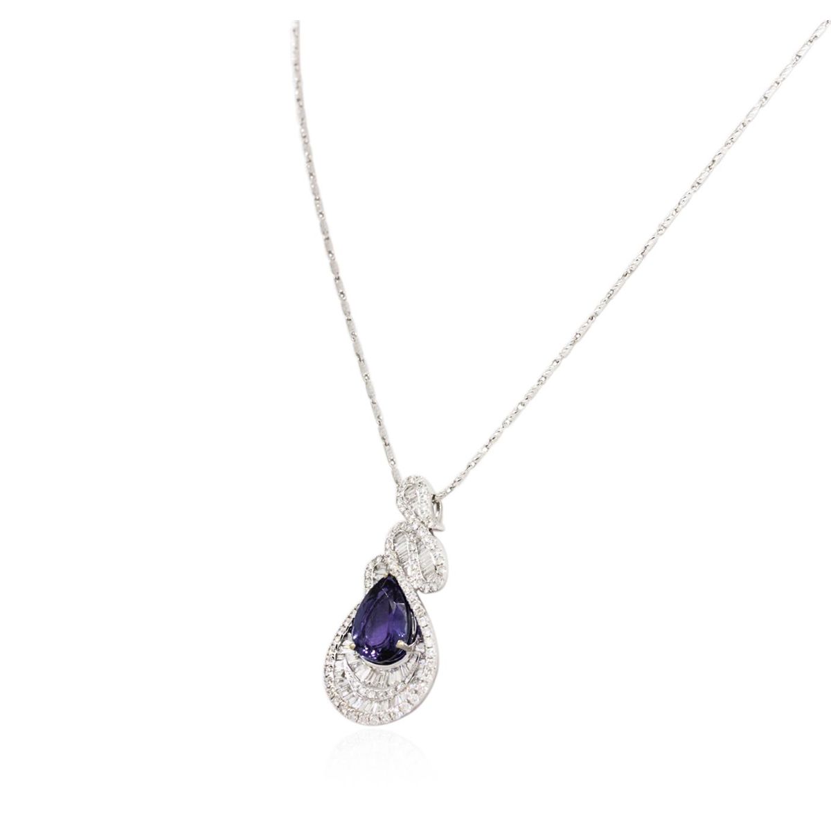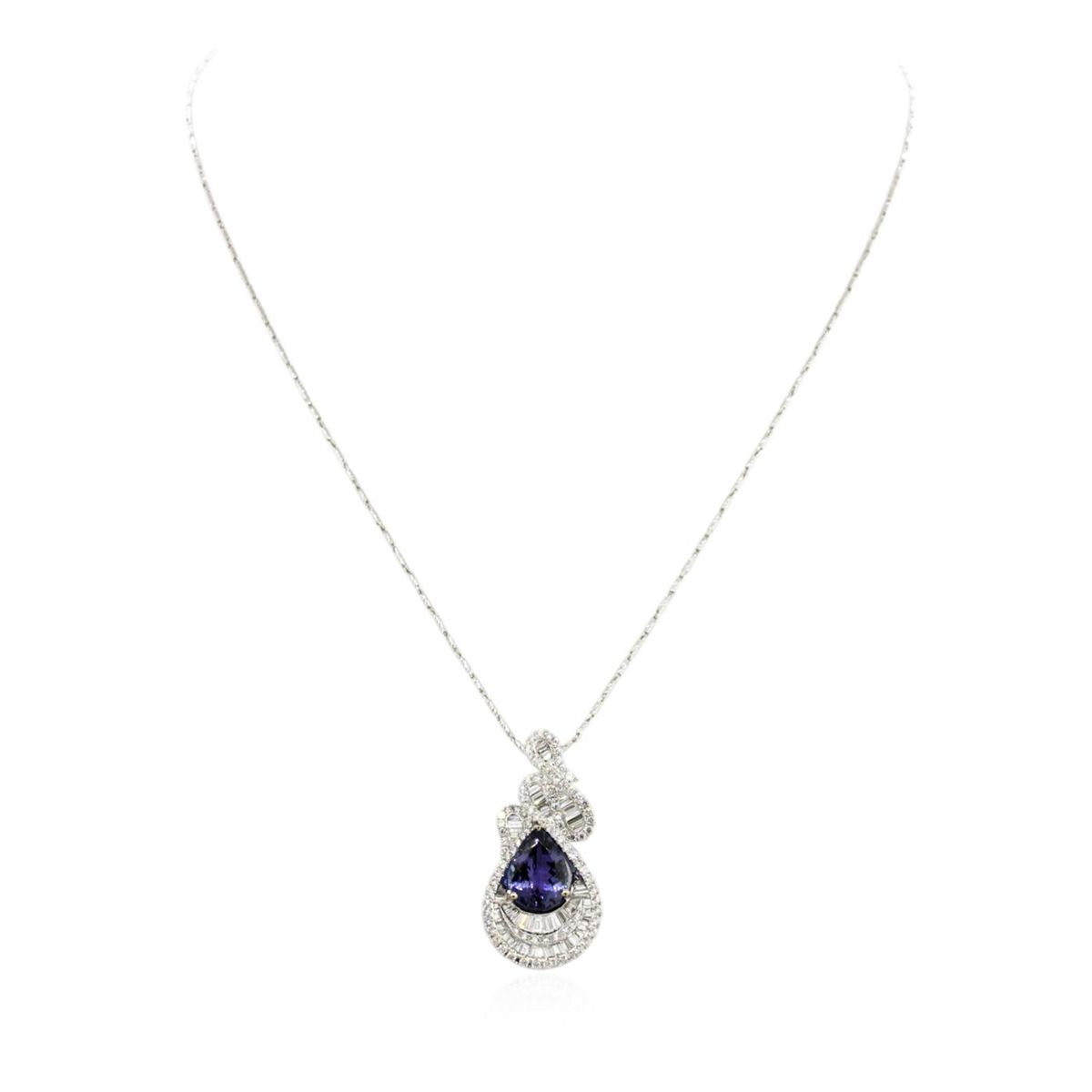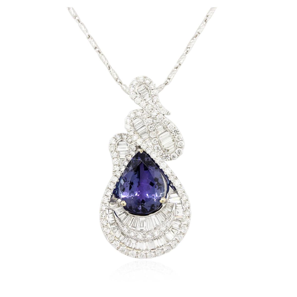One electronically tested 18KT White Gold ladies cast & assembled tanzanite and diamond pendant with chain. The pendant features a tanzanite set within intertwining diamond ribbons, completed by a diamond set hidden bail. The pendant is supported by an eighteen inch length 14KT White Gold designer style chain, terminating in a lobster claw clasp. Bright polish finish with milgrain detailing. Identified with markings of "18K 750". Condition is new, good workmanship. Containing: One prong set pear brilliant cut natural tanzanite, measuring 12.00 x 9.20 x 5.80mm, 8% bulge factor, approximate weight of 4.63ct., clarity is eye clean, type I, medium dark, slightly grayish, bluish violet color, (GIA bV 6/2), cut is good. Transmitting light with no distortion, transparent. Graded in the setting. Tanzanite is a very rare gemstone that is only found in the country of Tanzania. Originally discovered in 1967. Tiffany & Company, named the stone Tanzanite. It is found in the Usumburu Mountains that border the Umba Valley of northern Tanzania. Tanzanite occurs in gray, brown, violet, blue, reddish-purple, & green. The gem is interesting because of its exceptional pleochroism. Rotated in different directions a tanzanite will exhibit multiple changes of color. Tanzanite has a low tolerance to ultrasonic cleaning, and should not be cleaned using this method. One Hundred Forty-Seven prong and channel set round brilliant & baguette cut diamonds approximate total weight of 147 Stones = 2.38ct. Graded in the setting. Clarity: VS-1 to SI-1. Color: G - I. Total Weight of Colored Stones 4.63ct. Total Weight of Diamonds 2.38ct. Total Weight of Pendant With Chain 10.88 grams. AIG Appraised at $19,685.00.