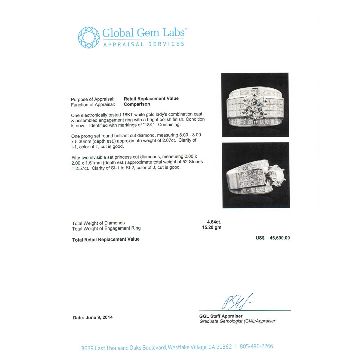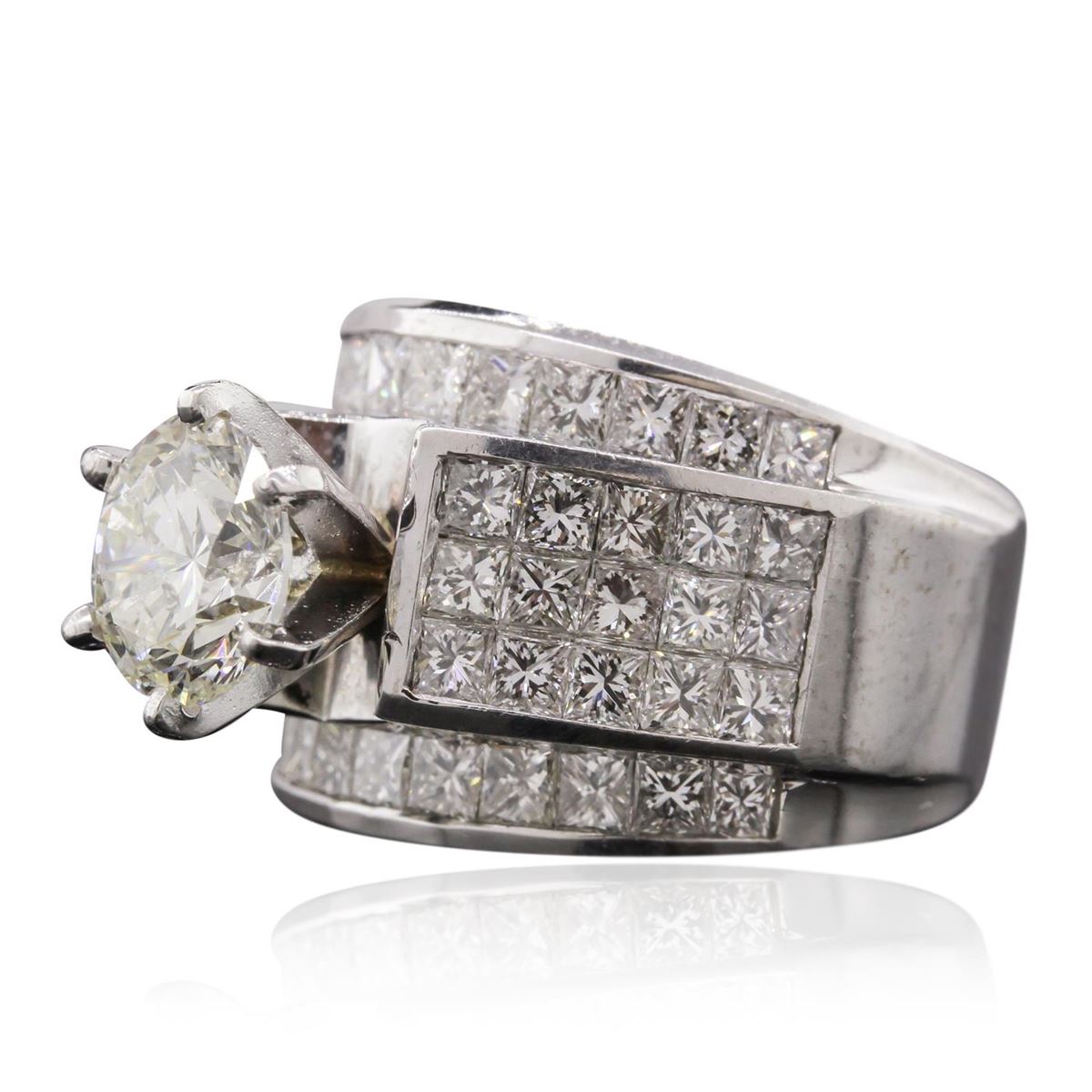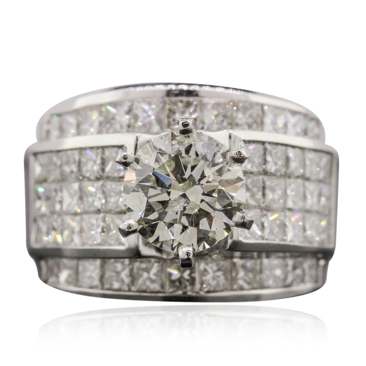 One electronically tested 18KT white gold Ladies combination cast & assembled engagement ring with a bright polish finish. Condition is new. Identified with markings of "18K". Containing: One prong set round brilliant cut diamond, measuring 8.00 - 8.00 x 5.30mm (depth est.) approximate weight of 2.07ct. Clarity: I-1. Color: L, Cut is Good. Fifty-Two invisible set princess cut diamonds, measuring 2.00 x 2.00 x 1.51mm (depth est.) approximate. Total Weight of 52 Stones = 2.57ct. Clarity: SI-1 to SI-2. Color: J, Cut is Good. Total Weight of Diamonds 4.64ct. Total Weight of Engagement Ring 15.20 grams. GGL Appraised at $45,690.00.