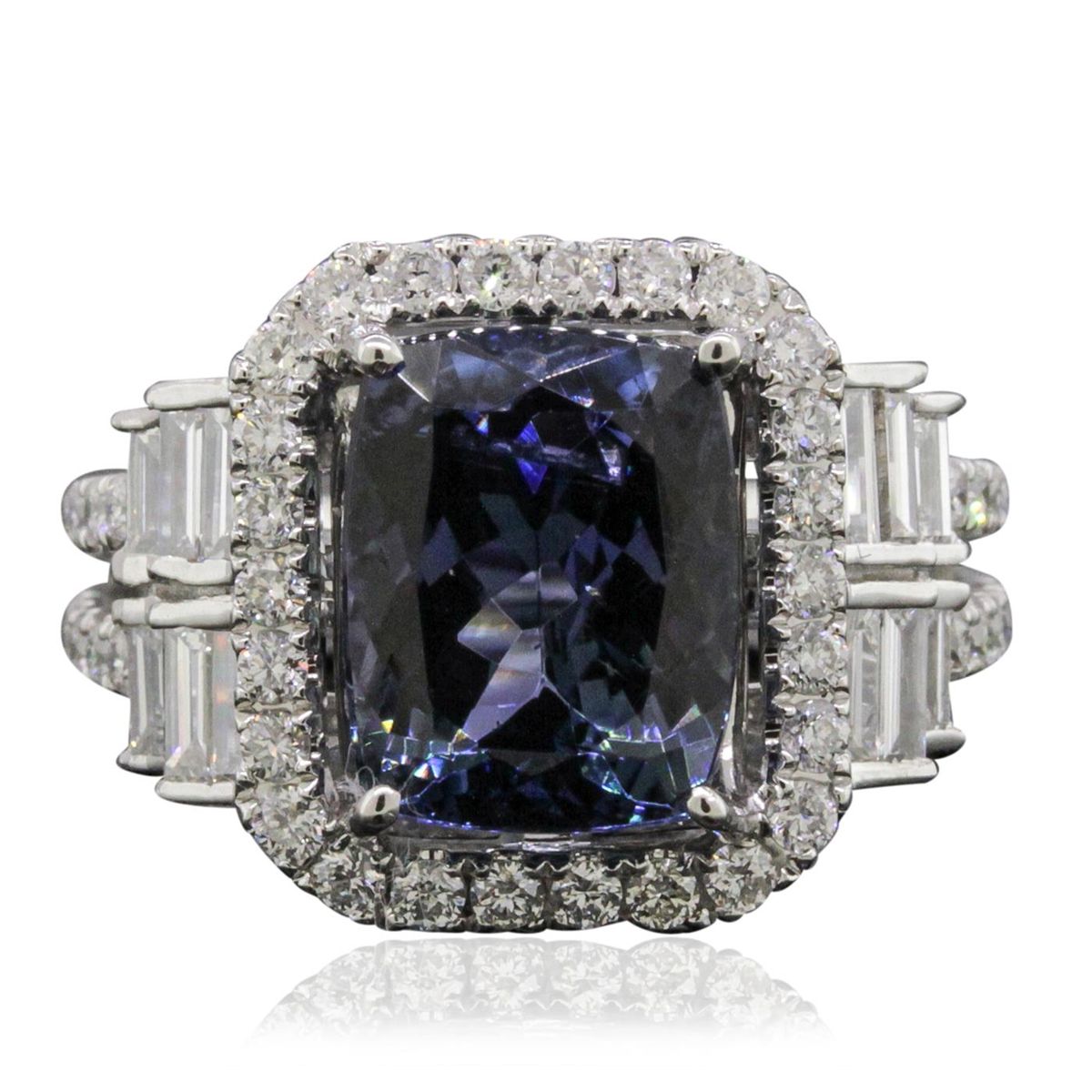 One electronically tested 18KT white gold ladies combination cast & assembled tanzanite and diamond ring with a split shank with a bright polish finish. Identified with markings of "750". Condition is new. Containing: One prong set rectangular cushion modified brilliant cut natural tanzanite, measuring 10.92 x 8.58 x 6.34mm, approximate weight of 4.68ct., clarity is eye clean, type I, medium, moderately strong, violet color, (GIA V 5/4), cut is very good. Forty-Five prong set round brilliant cut diamonds, measuring 1.50 - 1.30 x 0.84mm (depth est.) approximate total weight of 45 Stones = 0.45ct. Clarity: SI-2 to I-1. Color: I - J, Cut is Good. Twelve channel set baguette cut diamonds, measuring from 2.10 x 1.50 x 1.28mm (depth est.) to 3.00 x 1.50 x 1.28mm (depth est.) approximate total weight of 12 Stones = 0.54ct. Clarity: SI-1. Color: I - J, Cut is Good. Colored gemstones are presumed to have been subjected to commonly used enhancement processes. All diamonds and colored gemstones are graded in the mounting, unless otherwise stated. Total Weight of Colored Stones 4.68ct. Total Weight of Diamonds 0.99ct. Total Weight of Ring 9.00 grams. GGL Appraised at $12,830.00.