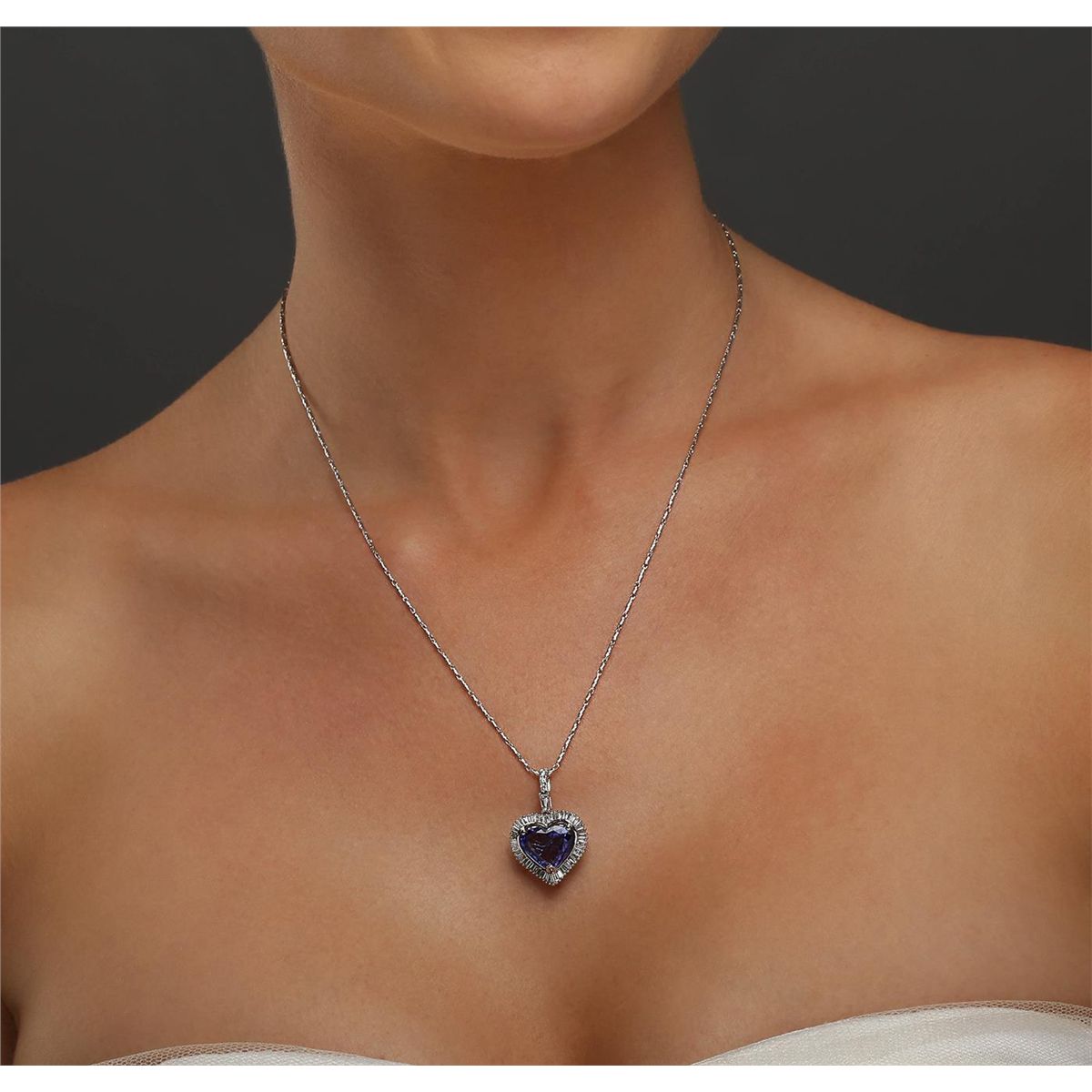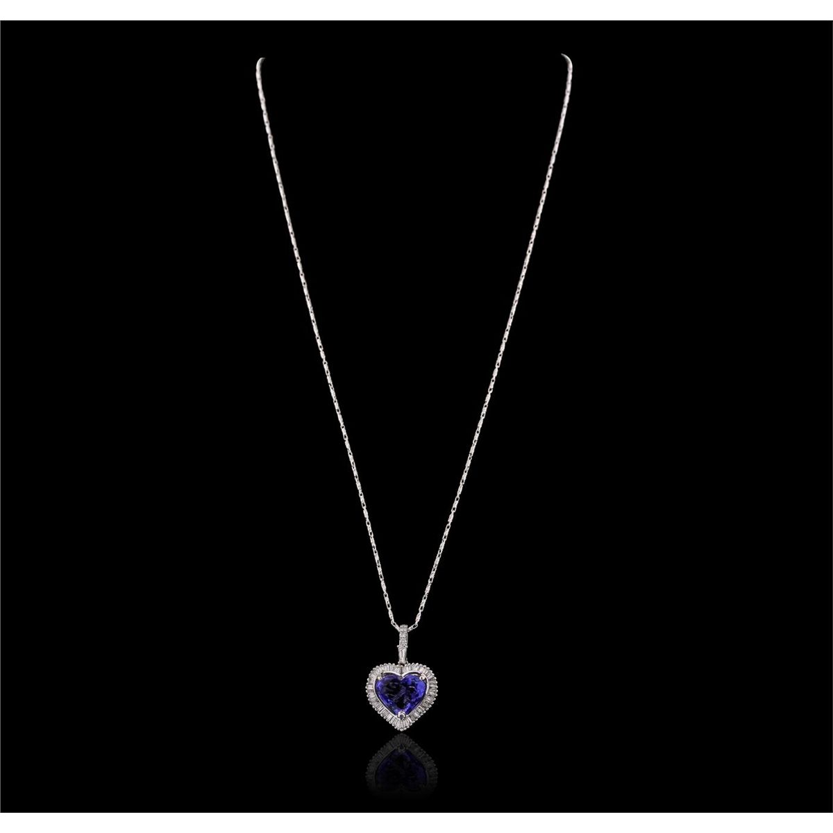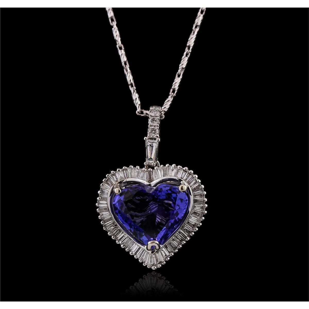 One electronically tested 18KT White Gold ladies cast & assembled tanzanite and diamond pendant with chain. The pendant features a tanzanite set within a diamond bezel, completed by a diamond set bail. The pendant is supported by an eighteen inch length 14KT White Gold designer style chain, terminating in a lobster claw clasp. Bright polish finish. Identified with markings of "18K 750". Condition is new, good workmanship. Containing: One prong set heart brilliant cut natural tanzanite, measuring 10.50 x 12.00 x 5.40mm, 8% bulge factor, approximate weight of 4.80ct., clarity is eye clean, type I, medium dark, moderately strong, violetish blue color, (GIA vB 6/4), cut is good. Transmitting light with no distortion, transparent. Graded in the setting. Tanzanite is a very rare gemstone that is only found in the country of Tanzania. Originally discovered in 1967. Tiffany & Company, named the stone Tanzanite. It is found in the Usumburu Mountains that border the Umba Valley of northern Tanzania. Tanzanite occurs in gray, brown, violet, blue, reddish-purple, & green. The gem is interesting because of its exceptional pleochroism. Rotated in different directions a tanzanite will exhibit multiple changes of color. Tanzanite has a low tolerance to ultrasonic cleaning, and should not be cleaned using this method. Fifty-One prong set baguette cut (tapered) diamonds, measuring from 1.80 x 1.00 x 0.70mm (depth est.) to 2.40 x 1.20 x 0.84mm (depth est.) approximate total weight of 51 Stones = 0.83ct. Graded in the setting. Clarity: VVS-1 to VS-1. Color: G - I Four bead set round brilliant cut diamonds, measuring 1.60 - 1.50 x 0.93mm (depth est.) approximate total weight of 4 Stones = 0.10ct. Graded in the setting. Clarity: VVS-2 to VS-1. Color: G - I. Total Weight of Colored Stones 4.80ct. Total Weight of Diamonds 0.93ct. Total Weight of Pendant With Chain 9.27 grams. AIG Appraised at $17,645.00.