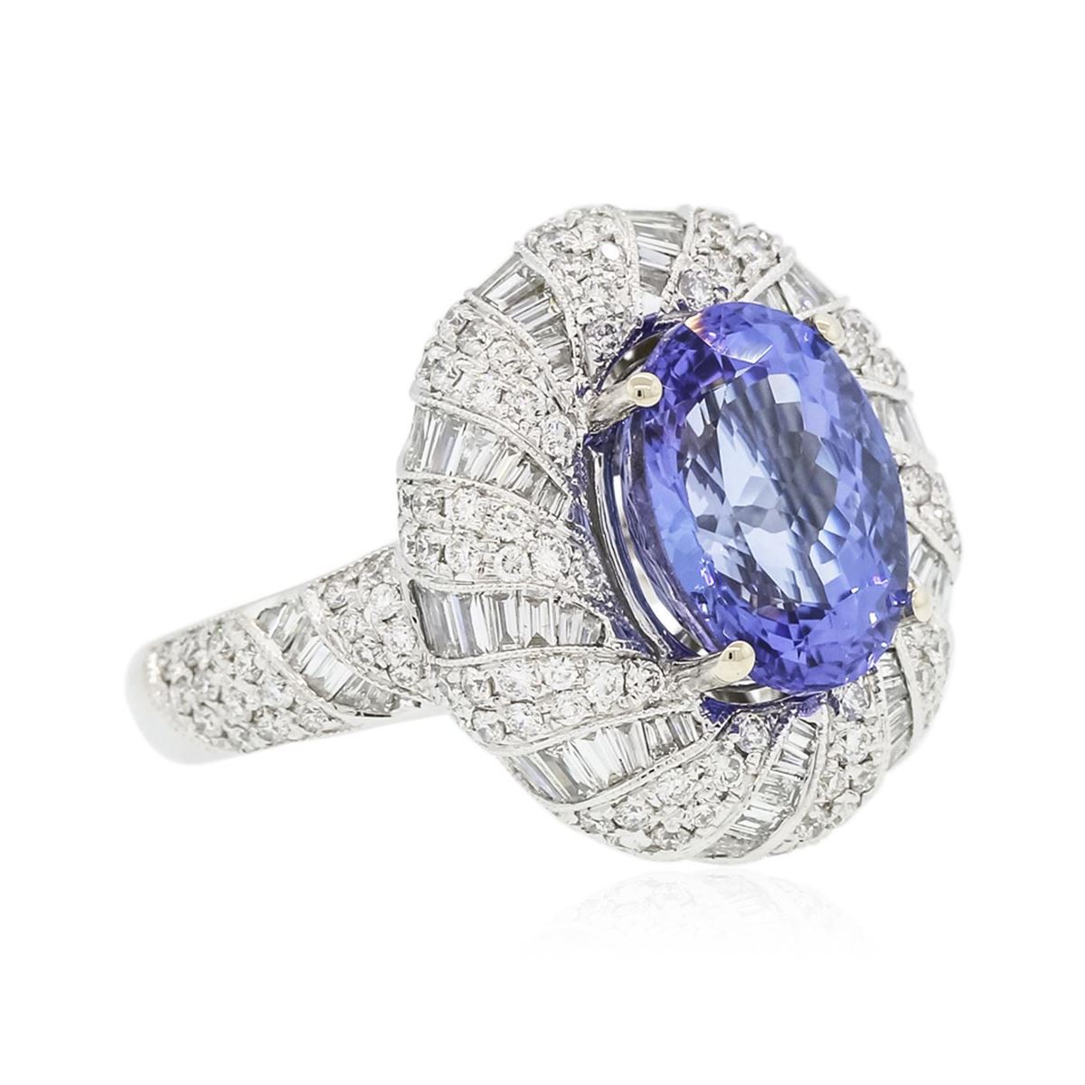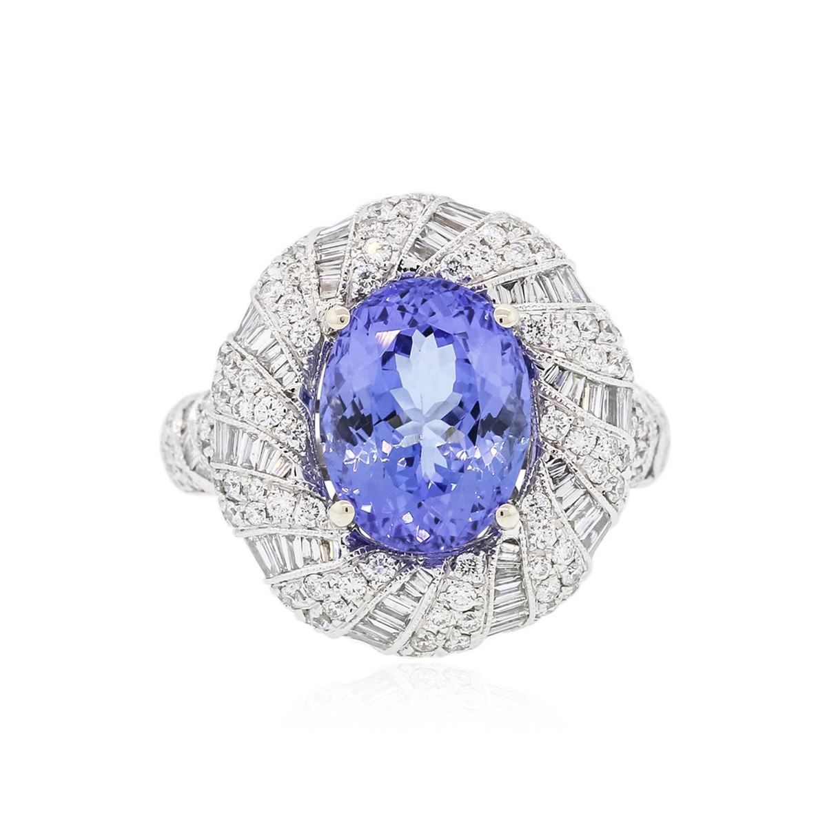 One electronically tested 18KT white gold ladies combination cast & assembled prong set ring with a bright polish finish. Identified with markings of "750". Condition is new. Containing: One prong set oval modified brilliant cut natural tanzanite, measuring 11.66 x 8.95 x 6.83mm, approximate weight of 4.86ct., clarity is eye clean, type I, medium light, very slightly grayish, violet color, (GIA V 4/3), cut is good. One Hundred Sixty-Six prong set round brilliant cut diamonds, measuring 1.30 - 1.10 x 0.72mm (depth est.) approximate total weight of 166 Stones = 1.05ct. Clarity: SI-2 to I-1. Color: H - I, Cut is Good. All diamonds are graded in the mounting, unless otherwise stated, Colored gemstones are presumed to have been subjected to commonly used enhancement processes. One Hundred Ten channel set baguette cut diamonds, measuring from 1.10 x 1.10 x 0.94mm (depth est.) to 2.00 x 1.50 x 1.28mm (depth est.) approximate total weight of 110 Stones = 2.24ct. Clarity: SI-1. Color: G - H, Cut is Good. Colored gemstones are presumed to have been subjected to commonly used enhancement processes. All diamonds and colored gemstones are graded in the mounting, unless otherwise stated. Total Weight of Colored Stones 4.86ct. Total Weight of Diamonds 3.29ct. Total Weight of Ring 11.50 grams. GGL Appraised at $20,495.00.