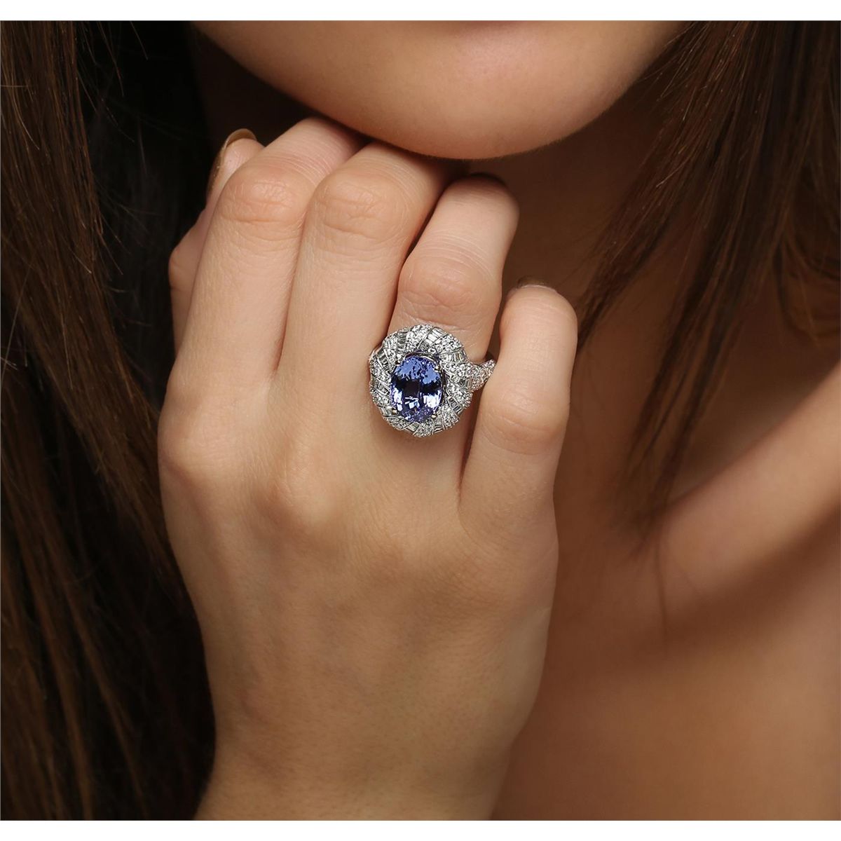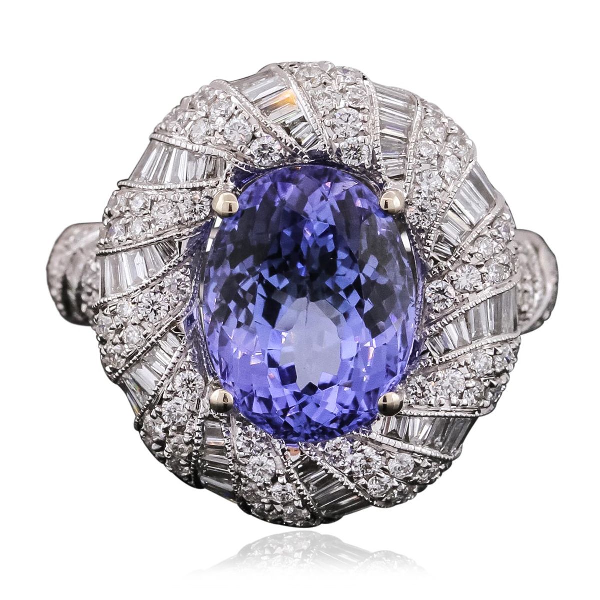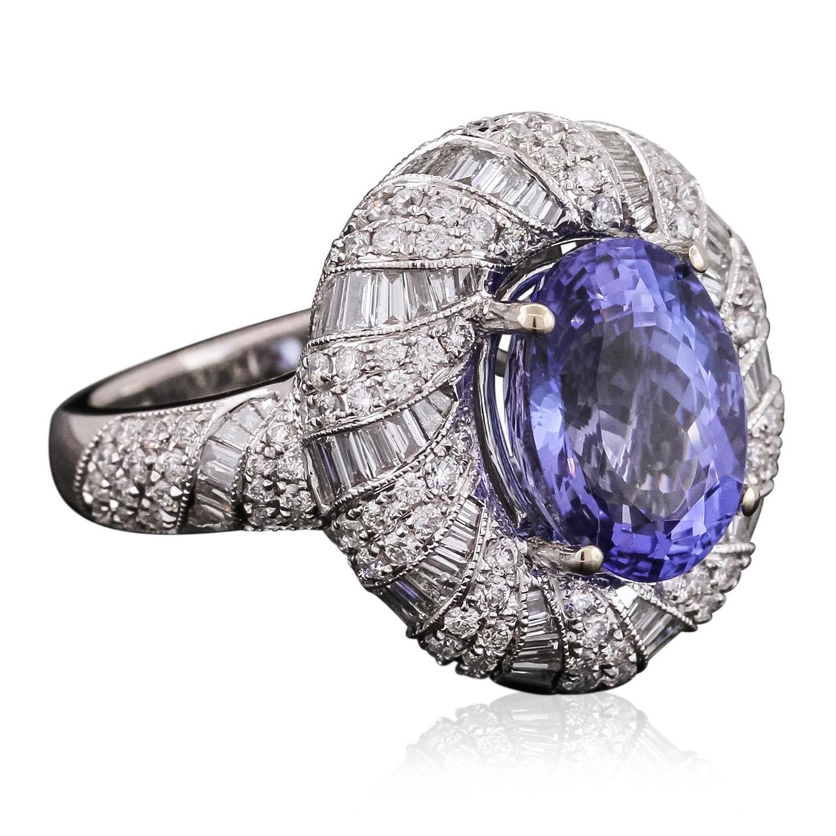 One electronically tested 18KT white gold ladies combination cast & assembled prong set ring with a bright polish finish. Identified with markings of "750". Condition is new. Containing: One prong set oval modified brilliant cut natural tanzanite, measuring 11.66 x 8.95 x 6.83mm, approximate weight of 4.86ct., clarity is eye clean, type I, medium light, very slightly grayish, violet color, (GIA V 4/3), cut is good. One Hundred Sixty-Six prong set round brilliant cut diamonds, measuring 1.30 - 1.10 x 0.72mm (depth est.) approximate total weight of 166 Stones = 1.05ct. Clarity: SI-2 to I-1. Color: H - I, Cut is Good. All diamonds are graded in the mounting, unless otherwise stated, Colored gemstones are presumed to have been subjected to commonly used enhancement processes. One Hundred Ten channel set baguette cut diamonds, measuring from 1.10 x 1.10 x 0.94mm (depth est.) to 2.00 x 1.50 x 1.28mm (depth est.) approximate total weight of 110 Stones = 2.24ct. Clarity: SI-1. Color: G - H, Cut is Good. Colored gemstones are presumed to have been subjected to commonly used enhancement processes. All diamonds and colored gemstones are graded in the mounting, unless otherwise stated. Total Weight of Colored Stones 4.86ct. Total Weight of Diamonds 3.29ct. Total Weight of Ring 11.50 grams. GGL Appraised at $20,495.00.