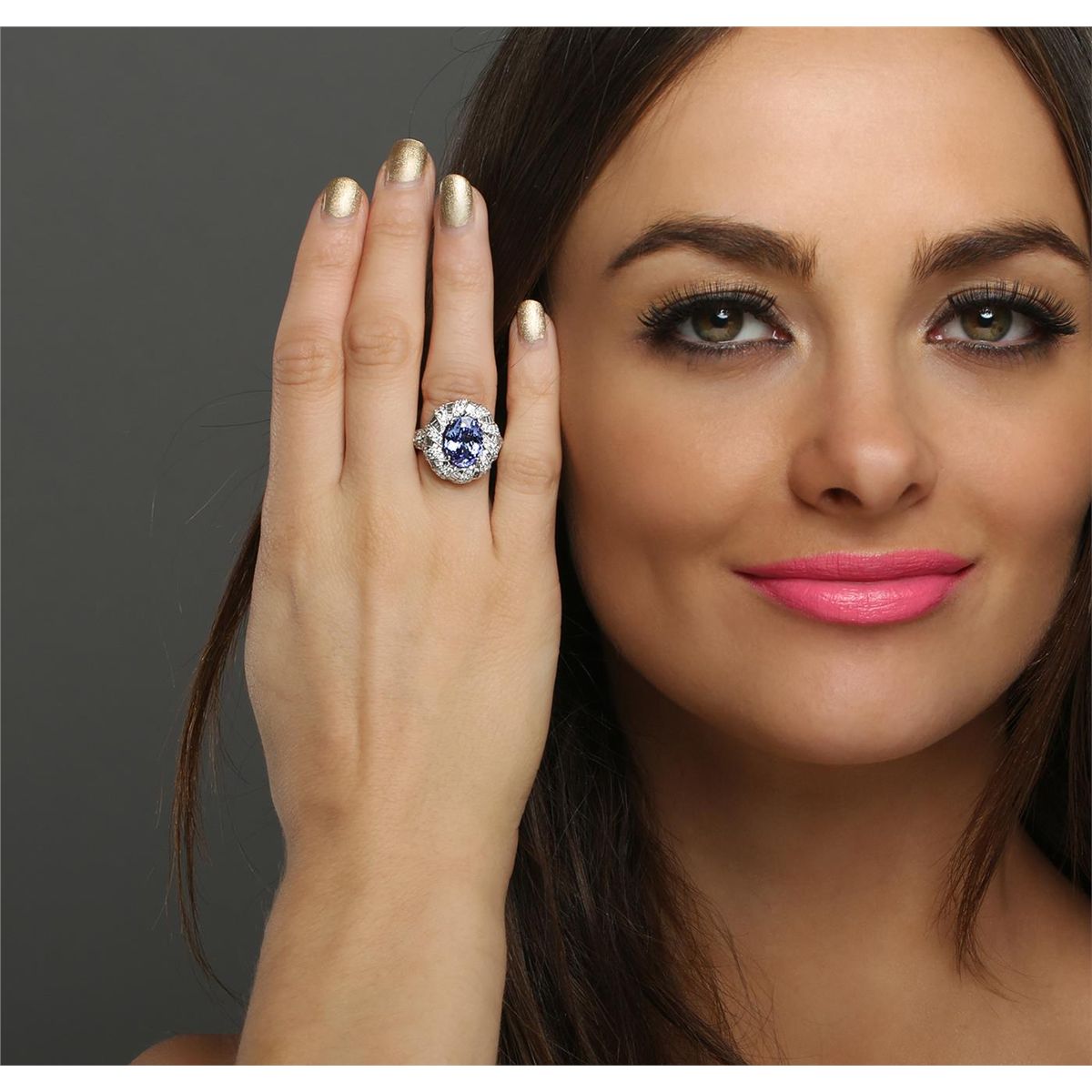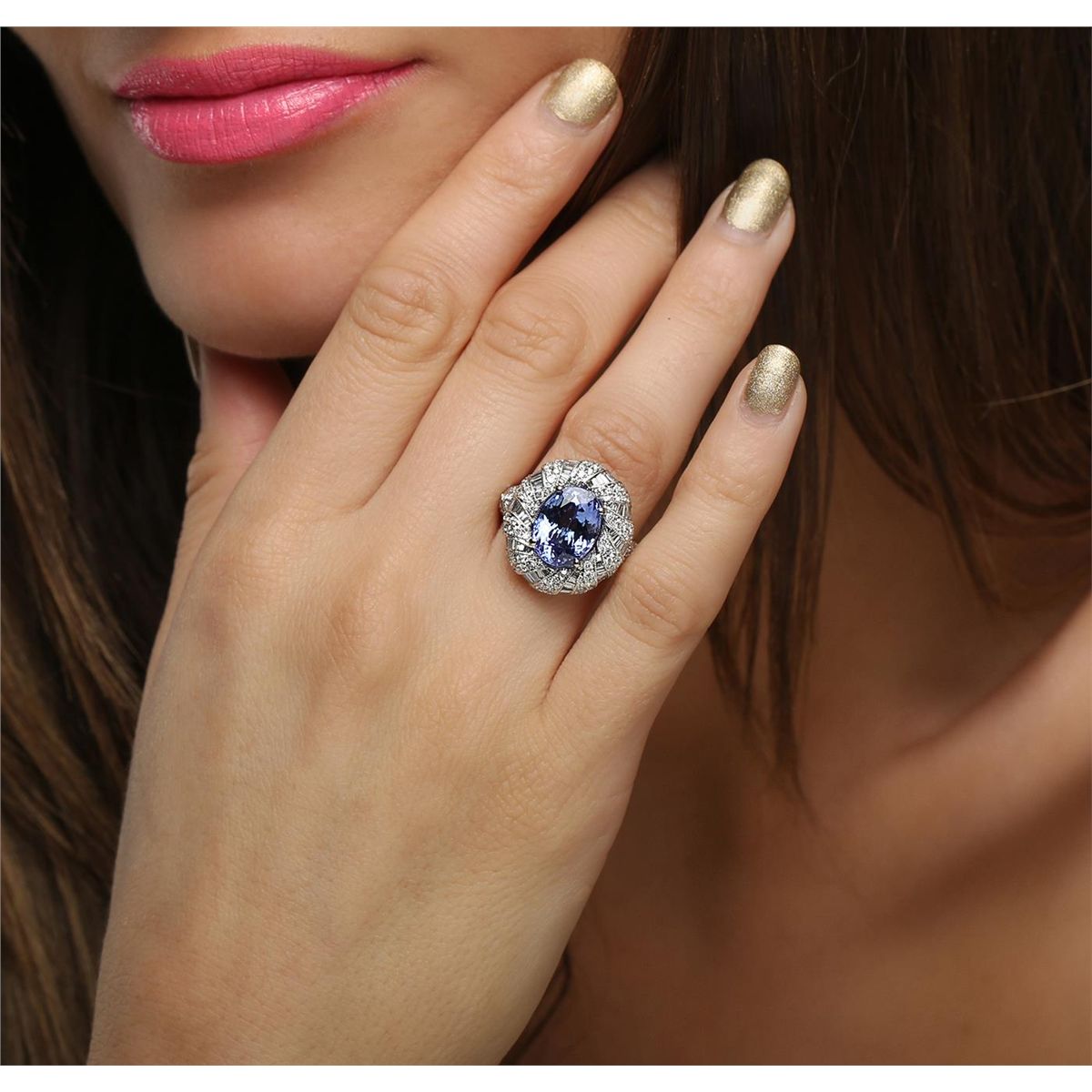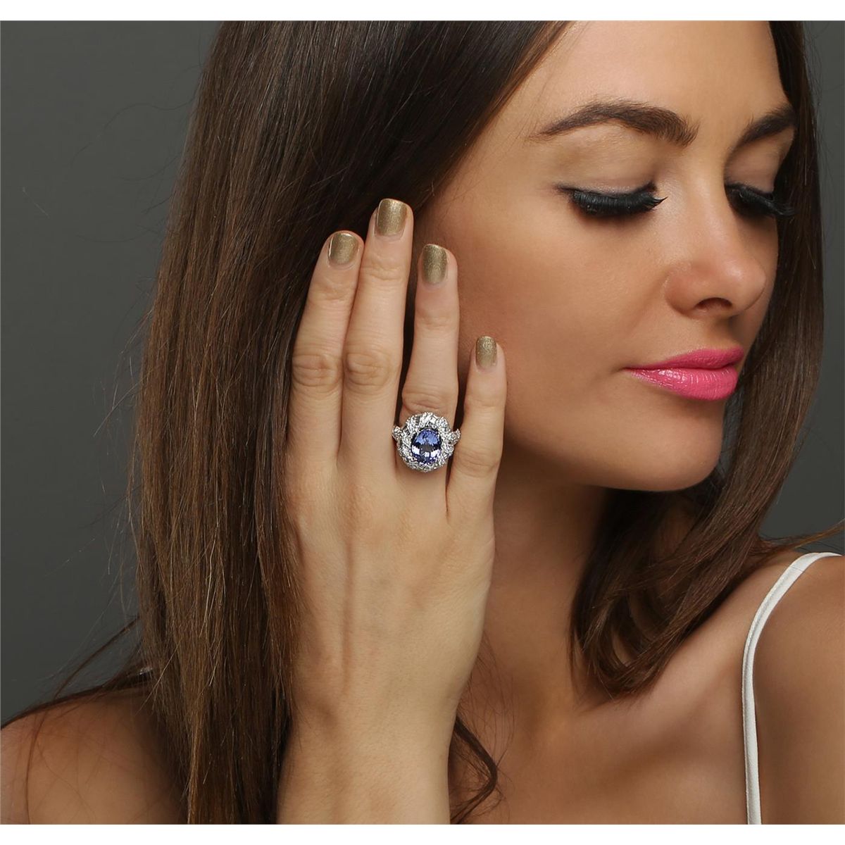 One electronically tested 18KT white gold ladies combination cast & assembled prong set ring with a bright polish finish. Identified with markings of "750". Condition is new. Containing: One prong set oval modified brilliant cut natural tanzanite, measuring 11.66 x 8.95 x 6.83mm, approximate weight of 4.86ct., clarity is eye clean, type I, medium light, very slightly grayish, violet color, (GIA V 4/3), cut is good. One Hundred Sixty-Six prong set round brilliant cut diamonds, measuring 1.30 - 1.10 x 0.72mm (depth est.) approximate total weight of 166 Stones = 1.05ct. Clarity: SI-2 to I-1. Color: H - I, Cut is Good. All diamonds are graded in the mounting, unless otherwise stated, Colored gemstones are presumed to have been subjected to commonly used enhancement processes. One Hundred Ten channel set baguette cut diamonds, measuring from 1.10 x 1.10 x 0.94mm (depth est.) to 2.00 x 1.50 x 1.28mm (depth est.) approximate total weight of 110 Stones = 2.24ct. Clarity: SI-1. Color: G - H, Cut is Good. Colored gemstones are presumed to have been subjected to commonly used enhancement processes. All diamonds and colored gemstones are graded in the mounting, unless otherwise stated. Total Weight of Colored Stones 4.86ct. Total Weight of Diamonds 3.29ct. Total Weight of Ring 11.50 grams. GGL Appraised at $20,495.00.