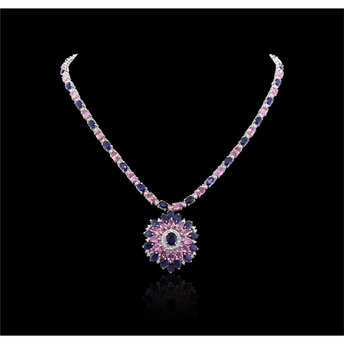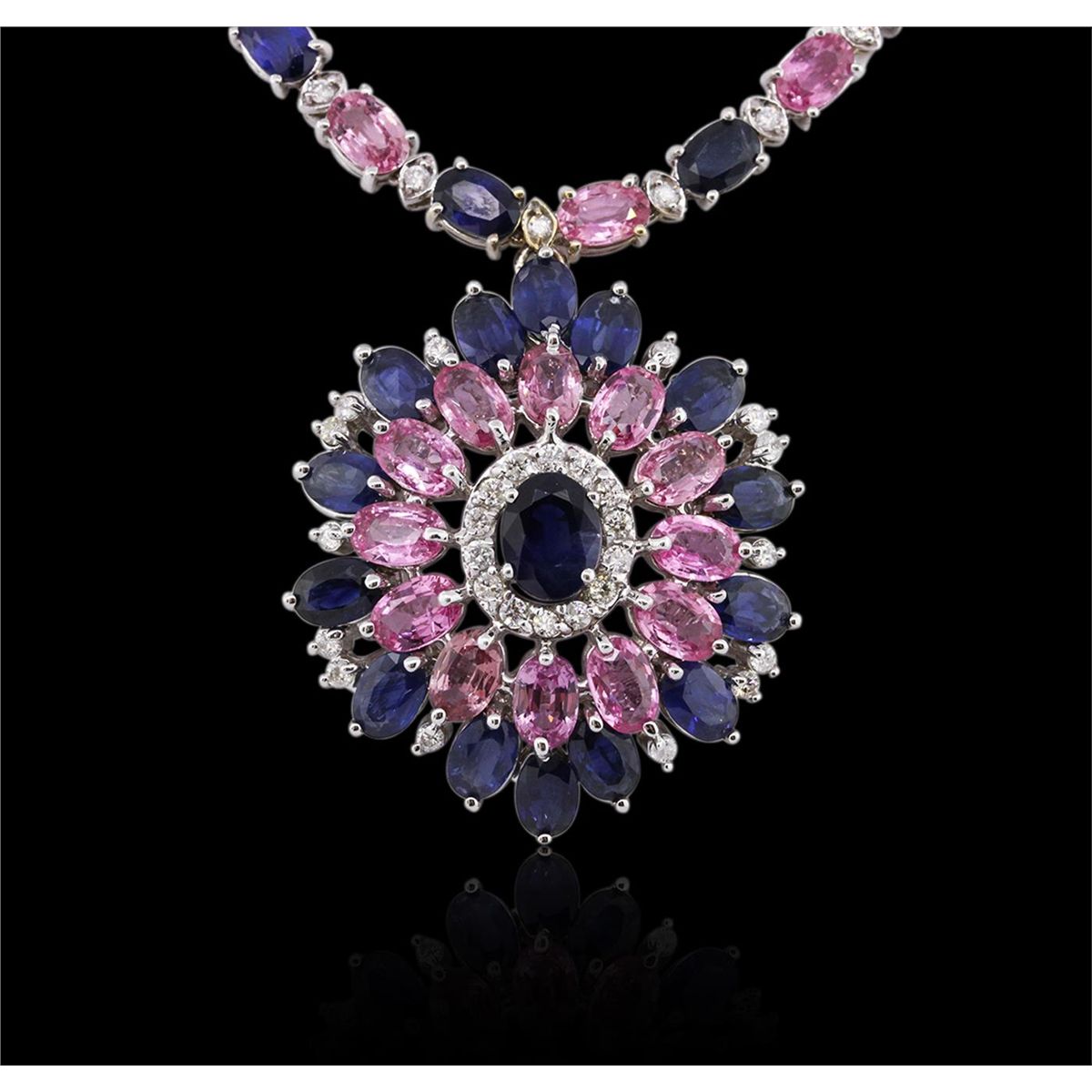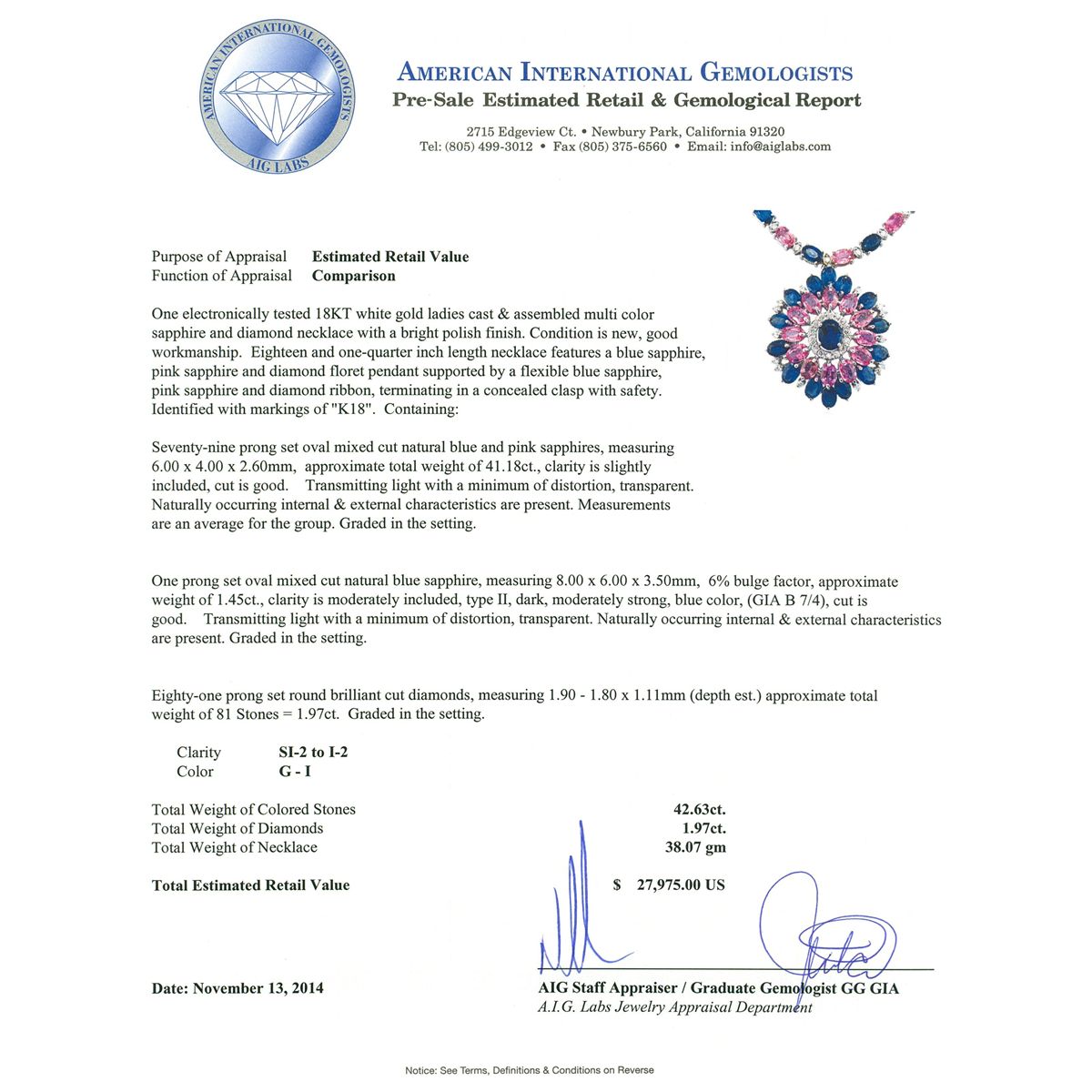 One electronically tested 18KT white gold ladies cast & assembled multi color sapphire and diamond necklace with a bright polish finish. Eighteen and one-quarter inch length necklace features a blue sapphire, pink sapphire and diamond floret pendant supported by a flexible blue sapphire, pink sapphire and diamond ribbon, terminating in a concealed clasp with safety. Identified with markings of "K18". Condition is new, good workmanship. Containing: Seventy-nine prong set oval mixed cut natural blue and pink sapphires, measuring 6.00 x 4.00 x 2.60mm, approximate total weight of 41.18ct., clarity is slightly included, cut is good. Transmitting light with a minimum of distortion, transparent. Naturally occurring internal & external characteristics are present. Measurements are an average for the group. Graded in the setting. One prong set oval mixed cut natural blue sapphire, measuring 8.00 x 6.00 x 3.50mm, 6% bulge factor, approximate weight of 1.45ct., clarity is moderately included, type II, dark, moderately strong, blue color, (GIA B 7/4), cut is good. Transmitting light with a minimum of distortion, transparent. Naturally occurring internal & external characteristics are present. Graded in the setting. Eighty-One prong set round brilliant cut diamonds, measuring 1.90 - 1.80 x 1.11mm (depth est.) approximate total weight of 81 Stones = 1.97ct. Graded in the setting. Clarity: SI-2 to I-2. Color: G - I. Total Weight of Colored Stones 42.63ct. Total Weight of Diamonds 1.97ct. Total Weight of Necklace 38.07 grams. AIG Appraised at $27,975.00.