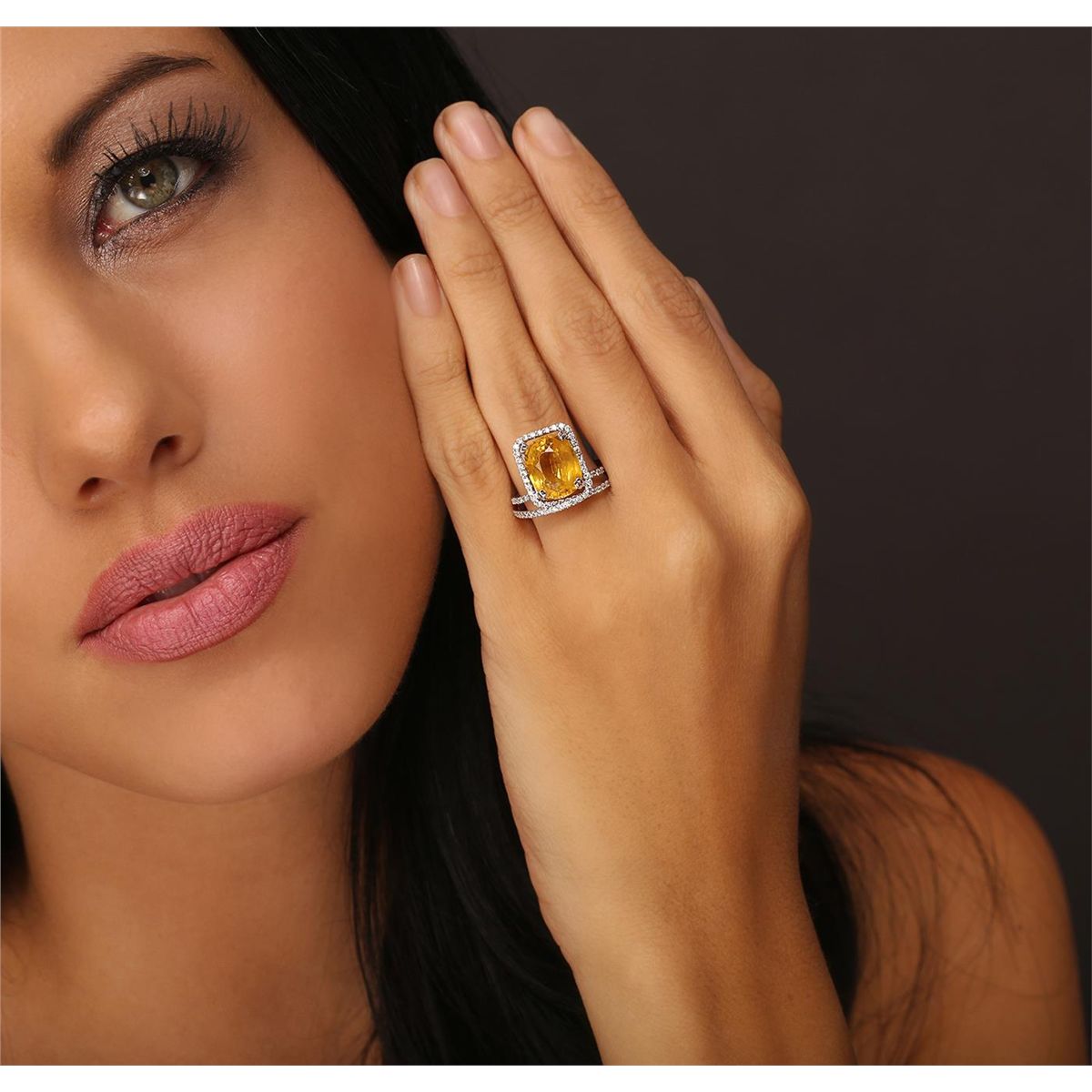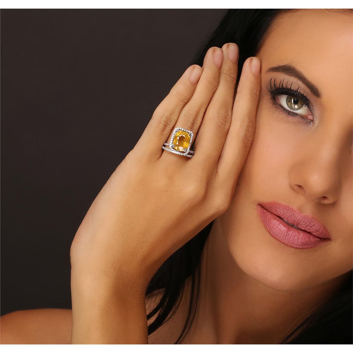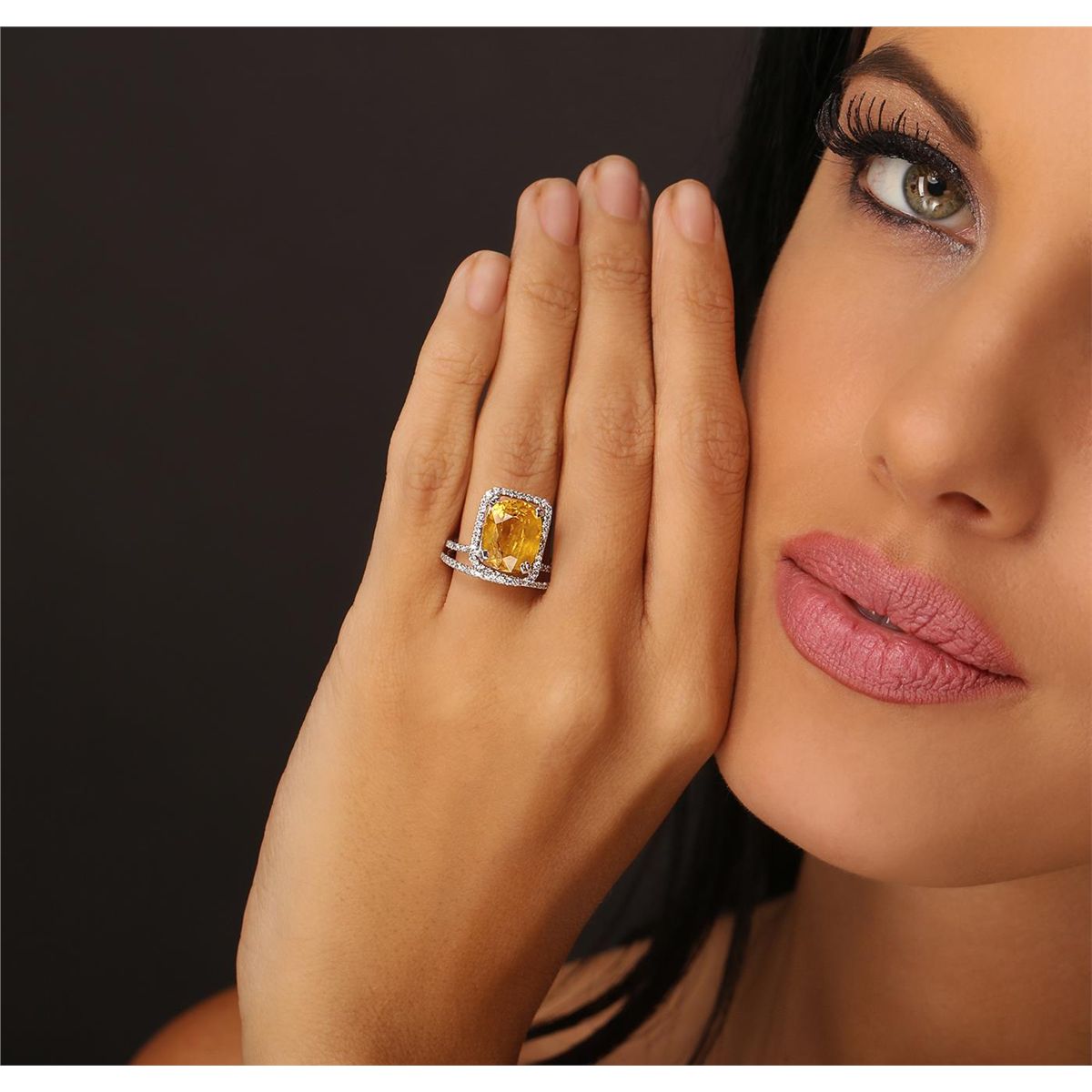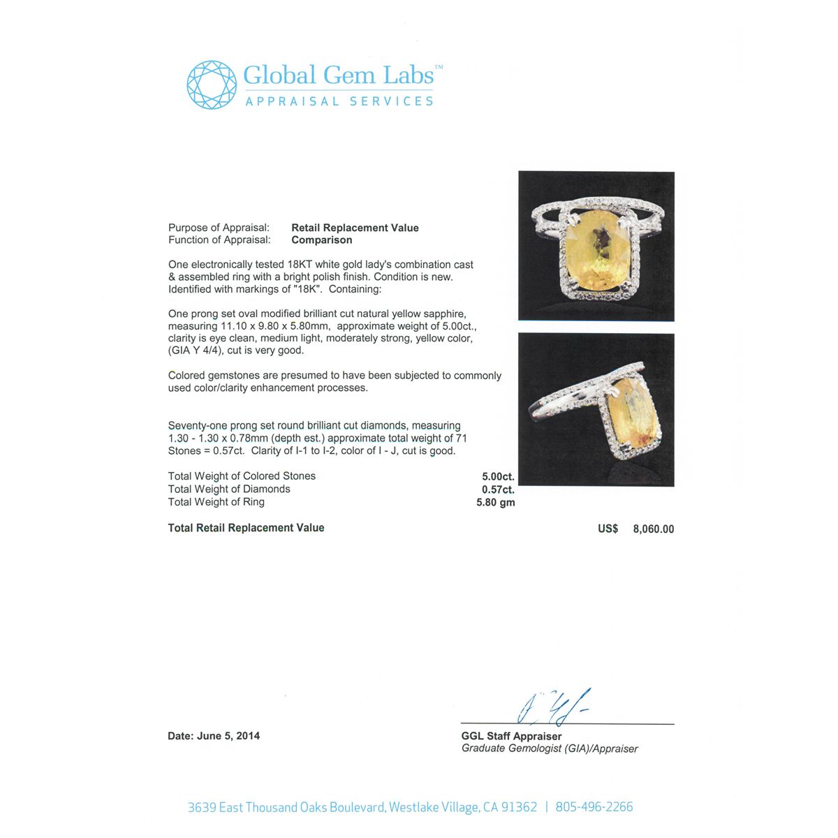 One electronically tested 18KT white gold Ladies combination cast & assembled ring with a bright polish finish. Condition is new. Identified with markings of "18K". Containing: One prong set oval modified brilliant cut natural yellow sapphire, measuring 11.10 x 9.80 x 5.80mm, approximate weight of 5.00ct., clarity is eye clean, medium light, moderately strong, yellow color, (GIA Y 4/4), cut is very good. Colored gemstones are presumed to have been subjected to commonly used color/clarity enhancement processes. Seventy-One prong set round brilliant cut diamonds, measuring 1.30 - 1.30 x 0.78mm (depth est.) approximate. Total Weight of 71 Stones = 0.57ct. Clarity: I-1 to I-2. Color: I - J, Cut is Good. Total Weight of Colored Stones 5.00ct. Total Weight of Diamonds 0.57ct. Total Weight of Ring 5.80 grams. GGL Appraised at $8,060.00.