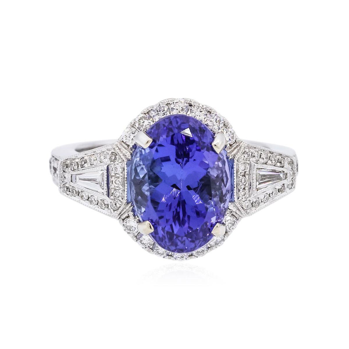 One electronically tested 18KT white gold ladies combination cast & assembled prong set ring with a split shoulder shank with a bright polish finish. Identified with markings of "750". Condition is new. Containing: One prong set oval modified brilliant cut natural tanzanite, measuring 11.82 x 8.33 x 7.42mm, approximate weight of 5.05ct., clarity is eye clean, type I, medium, moderately strong, bluish violet color, (GIA bV 5/4), cut is good. Fifty-Two prong set round brilliant cut diamonds, measuring 1.80 - 1.00 x 0.84mm (depth est.) approximate total weight of 52 Stones = 0.53ct. Clarity: SI-1 to I-1. Color: H - I, Cut is Good. Two bezel set baguette cut (tapered) diamonds, measuring 4.00 x 1.50 x 1.28mm (depth est.) approximate total weight of 2 Stones = 0.16ct. Clarity: SI-1. Color: H, Cut is Good. All diamonds are graded in the mounting, unless otherwise stated. Colored gemstones are presumed to have been subjected to commonly used enhancement processes. Total Weight of Colored Stones 5.05ct. Total Weight of Diamonds 0.69ct. Total Weight of Ring 7.20 grams. GGL Appraised at $11,915.00.