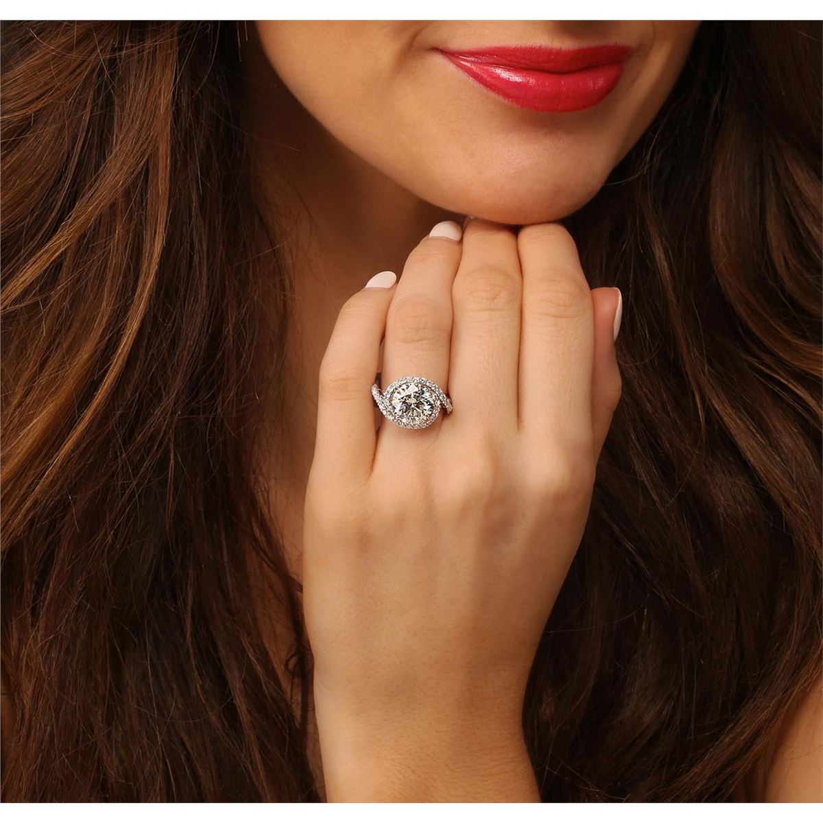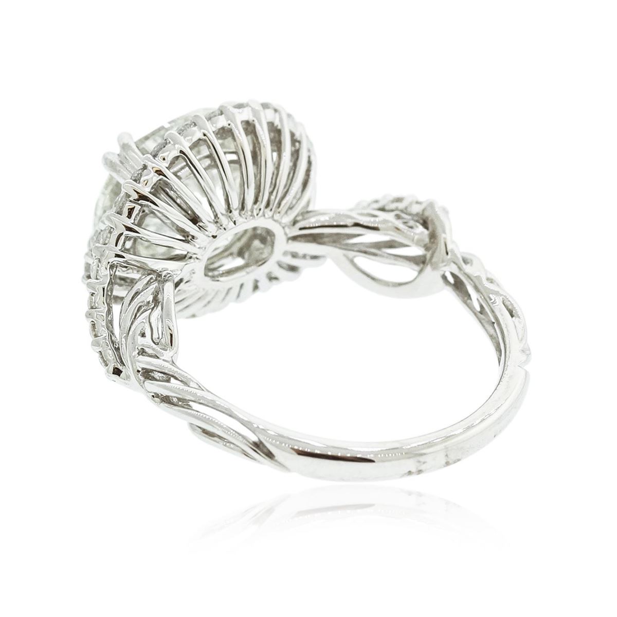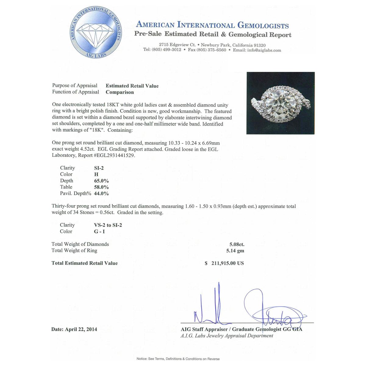 One electronically tested 18KT White Gold ladies cast & assembled diamond unity ring with a bright polish finish. Condition is new, good workmanship. The featured diamond is set within a diamond bezel supported by elaborate intertwining diamond set shoulders, completed by a one and one-half millimeter wide band. Identified with markings of "18K". Containing: One prong set round brilliant cut diamond, measuring 10.33 - 10.24 x 6.69mm exact weight 4.52. EGL Grading Report attached. Graded loose in the EGL Laboratory, Report #EGL2931441529. Clarity SI-2 Color H Depth 65.0% Table 58.0% Pavil Depth 44.0%. Thirty-four prong set round brilliant cut diamonds, measuring 1.60 - 1.50 x 0.93mm (depth est.) approximate total weight of 34 Stones = 0.56ct. Graded in the setting. Clarity VS-2 to SI-2. Color G-I. Total Weight of Diamond 5.08ct. Total Weight of Ring 5.14 grams. AIG Appraised at $211,915.00.