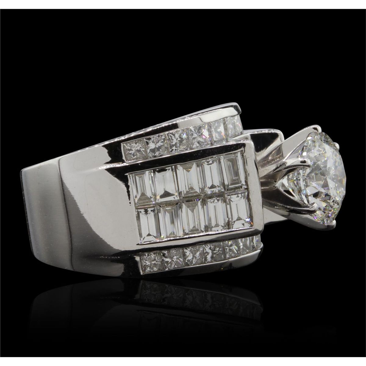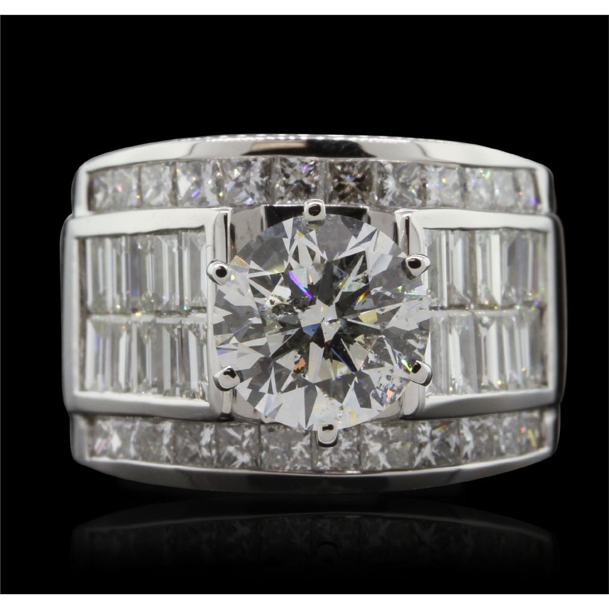 One electronically tested 18KT White Gold ladies cast & assembled diamond unity ring with a bright polish finish. Condition is new, good workmanship. The ring features a cathedral set diamond supported by diamond set shoulders, completed by a seven and one-half millimeter wide band. Identified with markings of "18K". Containing: One prong set round brilliant cut diamond, measuring 8.37 - 8.31 x 5.23mm exact weight 2.24ct. Graded loose prior to setting in the EGL Laboratory, Report #2159261733. Clarity: SI-1. Color: D Depth 62.8%. Table 57.0%. Pavil. Depth%. 43.0%. Twenty-Four channel set princess cut diamonds, measuring 2.00 x 2.00 x 1.50mm (depth est.) approximate. Total Weight of 24 Stones = 1.11ct. Graded in the setting. Clarity: VS-1 to SI-1. Color: G - I. Twenty channel set baguette cut diamonds, measuring from 3.20 x 1.90 x 1.33mm (depth est.) to 3.40 x 2.20 x 1.54mm (depth est.) approximate. Total Weight of 20 Stones = 1.77ct. Graded in the setting. Clarity: VVS-1 to VVS-2 Color G - I. Total Weight of Diamonds 5.12ct. Total Weight of Ring 16.18gm. AIG Appraised at $148,415.00.