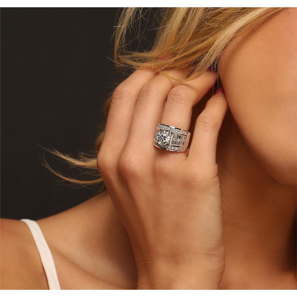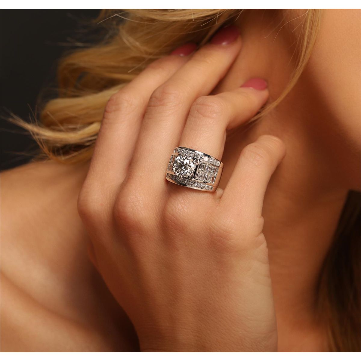 One electronically tested 18KT White Gold ladies cast & assembled diamond unity ring with a bright polish finish. Condition is new, good workmanship. The ring features a cathedral set diamond supported by diamond set shoulders, completed by a seven and one-half millimeter wide band. Identified with markings of "18K". Containing: One prong set round brilliant cut diamond, measuring 8.37 - 8.31 x 5.23mm exact weight 2.24ct. Graded loose prior to setting in the EGL Laboratory, Report #2159261733. Clarity: SI-1. Color: D Depth 62.8%. Table 57.0%. Pavil. Depth%. 43.0%. Twenty-Four channel set princess cut diamonds, measuring 2.00 x 2.00 x 1.50mm (depth est.) approximate. Total Weight of 24 Stones = 1.11ct. Graded in the setting. Clarity: VS-1 to SI-1. Color: G - I. Twenty channel set baguette cut diamonds, measuring from 3.20 x 1.90 x 1.33mm (depth est.) to 3.40 x 2.20 x 1.54mm (depth est.) approximate. Total Weight of 20 Stones = 1.77ct. Graded in the setting. Clarity: VVS-1 to VVS-2 Color G - I. Total Weight of Diamonds 5.12ct. Total Weight of Ring 16.18gm. AIG Appraised at $148,415.00.