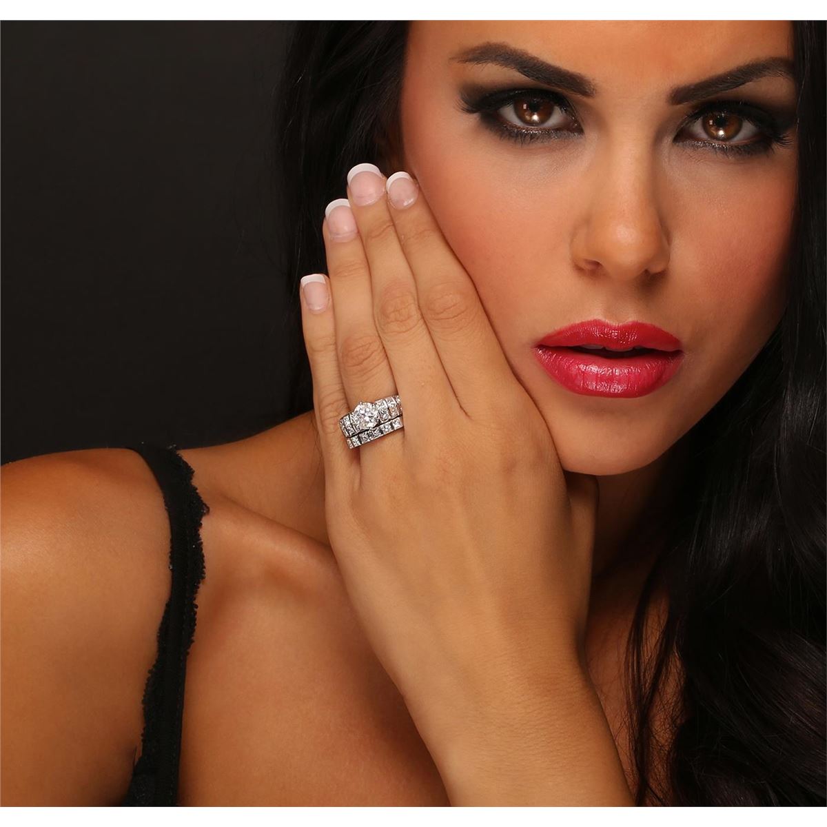 One electronically tested 18KT white gold Ladies combination cast & assembled engagement ring & wedding band with a bright polish finish. Condition is new. Engagement ring and wedding band soldered together. Containing: One prong set round brilliant cut diamond, measuring 8.00 - 8.00 x 5.20mm (depth est.) approximate weight of 2.03ct. Clarity: I-2. Color: G, Cut is Good. Nineteen prong set princess cut diamonds, measuring 3.00 x 3.00 x 2.26mm (depth est.) approximate. Total Weight of 19 Stones = 3.17ct. Clarity: VS-2 to SI-1. Color: I - J, Cut is Good. Total Weight of Diamonds 5.20ct. Total Weight of 16.60 grams. GGL Appraised at $38,585.00.