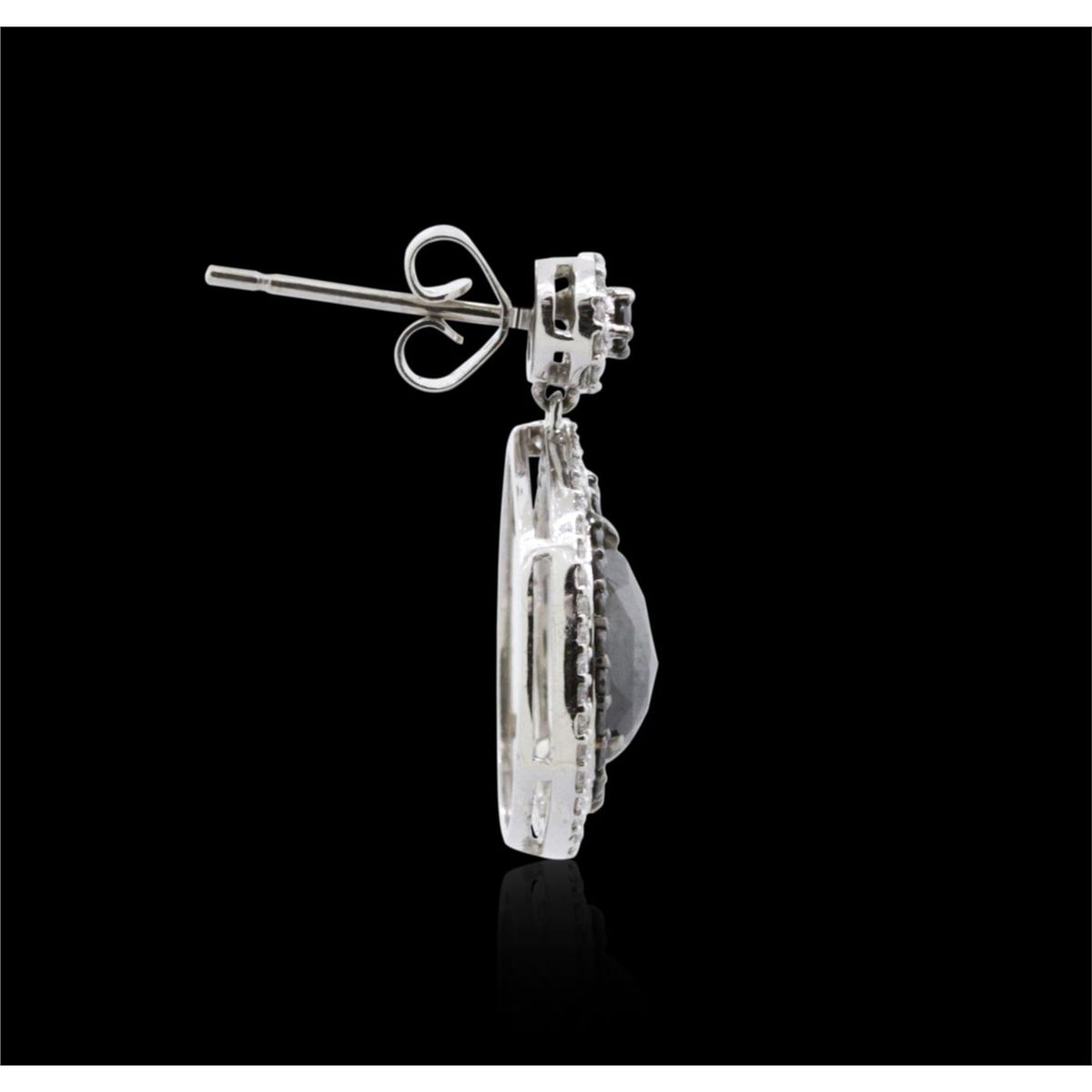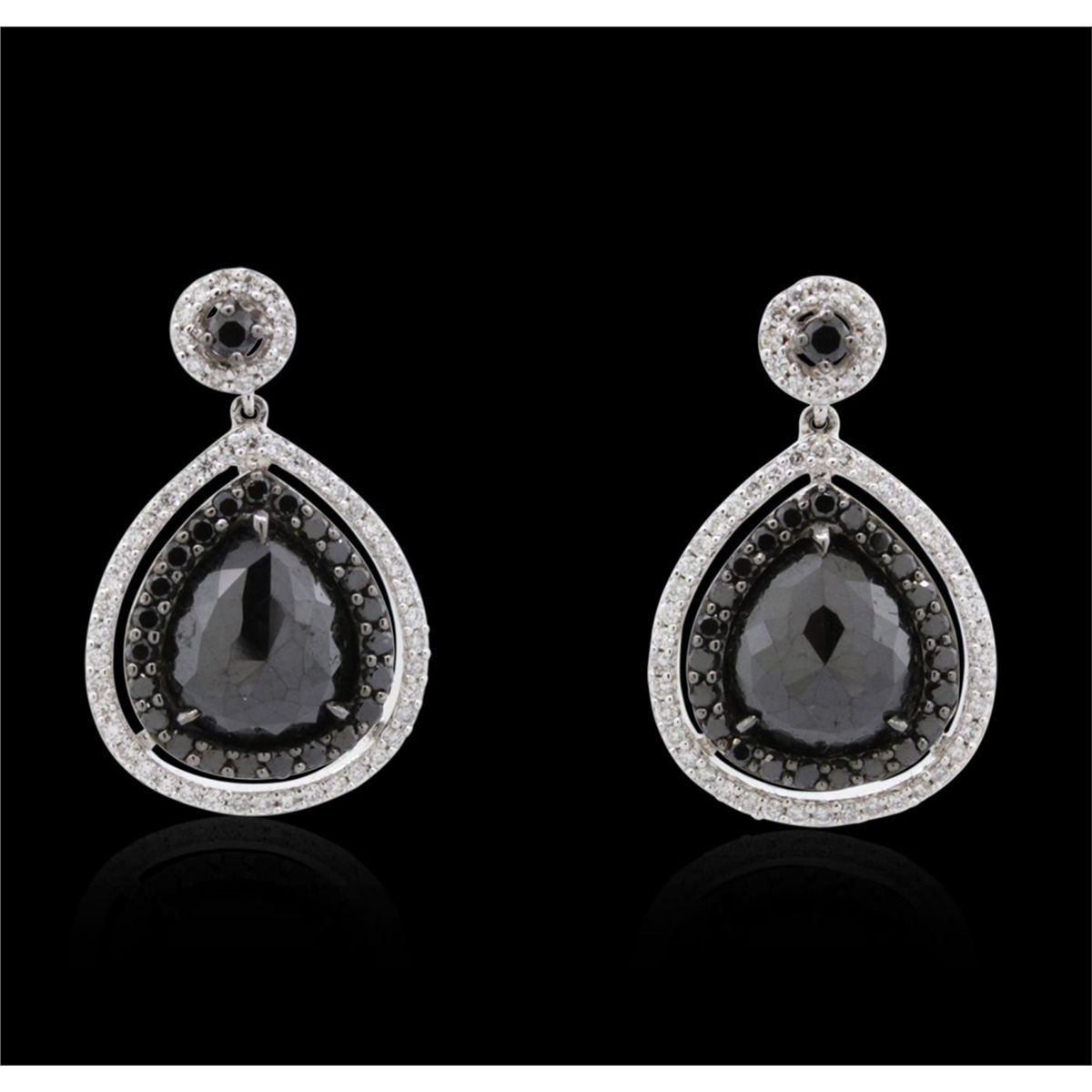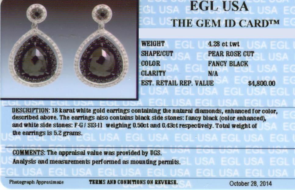 One pair of 18KT white gold earrings containing two pear rose cut fancy black diamonds, enhanced for color, with a total weight of 4.28ct. The earrings also contain diamonds: fancy black (color enhanced) and white side stones: F-G / SI3-I1 weighing 0.50ct
