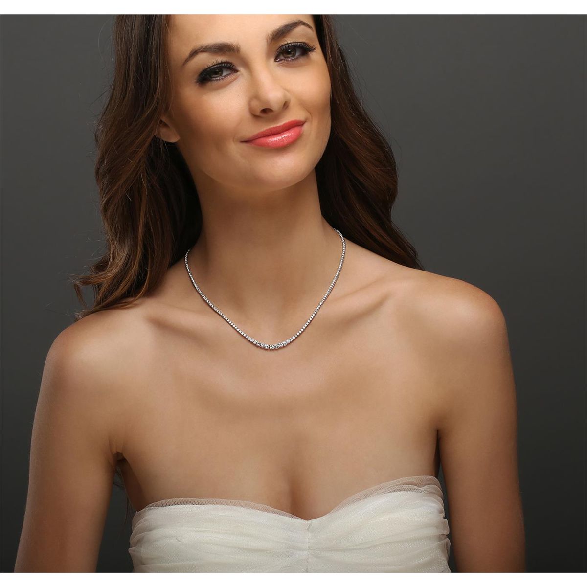 One electronically tested 18KT white gold ladies combination cast & assembled diamond necklace with a hidden box clasp with safety closer with a bright polish finish. Measurements: 16.50" in length. Identified with markings of "K18". Condition is new. Containing: One Hundred Seventy-Four prong set round brilliant cut diamonds, measuring 1.80 - 1.80 x 1.08mm (depth est.) approximate total weight of 174 Stones = 3.71ct. . Clarity: SI-2 to I-2. Color: I - J, Cut is Good. Six prong set round brilliant cut diamonds, measuring 3.00 - 3.00 x 1.80mm (depth est.) approximate total weight of 6 Stones = 0.59ct. . Clarity: SI-2. Color: I - J, Cut is Good. Four prong set round brilliant cut diamonds, measuring 3.20 - 3.20 x 1.92mm (depth est.) approximate total weight of 4 Stones = 0.48ct. . Clarity: SI-2 to I-1. Color: I - J, Cut is Good. Three prong set round brilliant cut diamonds, measuring 3.50 - 3.50 x 2.10mm (depth est.) approximate total weight of 3 Stones = 0.47ct. . Clarity: SI-2 to I-1. Color: I - J, Cut is Good. All diamonds are graded in the mounting, unless otherwise stated.. Total Weight of Diamonds 5.25ct.. Total Weight of Necklace 14.80 grams. GGL Appraised at $17,005.00.