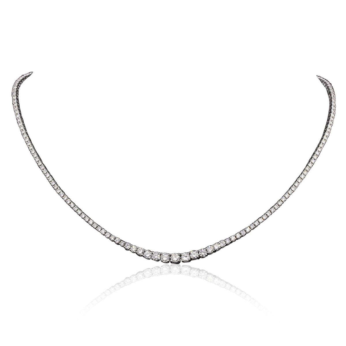One electronically tested 18KT white gold ladies combination cast & assembled diamond necklace with a hidden box clasp with safety closer with a bright polish finish. Measurements: 16.50" in length. Identified with markings of "K18". Condition is new. Containing: One Hundred Seventy-Four prong set round brilliant cut diamonds, measuring 1.80 - 1.80 x 1.08mm (depth est.) approximate total weight of 174 Stones = 3.71ct. . Clarity: SI-2 to I-2. Color: I - J, Cut is Good. Six prong set round brilliant cut diamonds, measuring 3.00 - 3.00 x 1.80mm (depth est.) approximate total weight of 6 Stones = 0.59ct. . Clarity: SI-2. Color: I - J, Cut is Good. Four prong set round brilliant cut diamonds, measuring 3.20 - 3.20 x 1.92mm (depth est.) approximate total weight of 4 Stones = 0.48ct. . Clarity: SI-2 to I-1. Color: I - J, Cut is Good. Three prong set round brilliant cut diamonds, measuring 3.50 - 3.50 x 2.10mm (depth est.) approximate total weight of 3 Stones = 0.47ct. . Clarity: SI-2 to I-1. Color: I - J, Cut is Good. All diamonds are graded in the mounting, unless otherwise stated.. Total Weight of Diamonds 5.25ct.. Total Weight of Necklace 14.80 grams. GGL Appraised at $17,005.00.