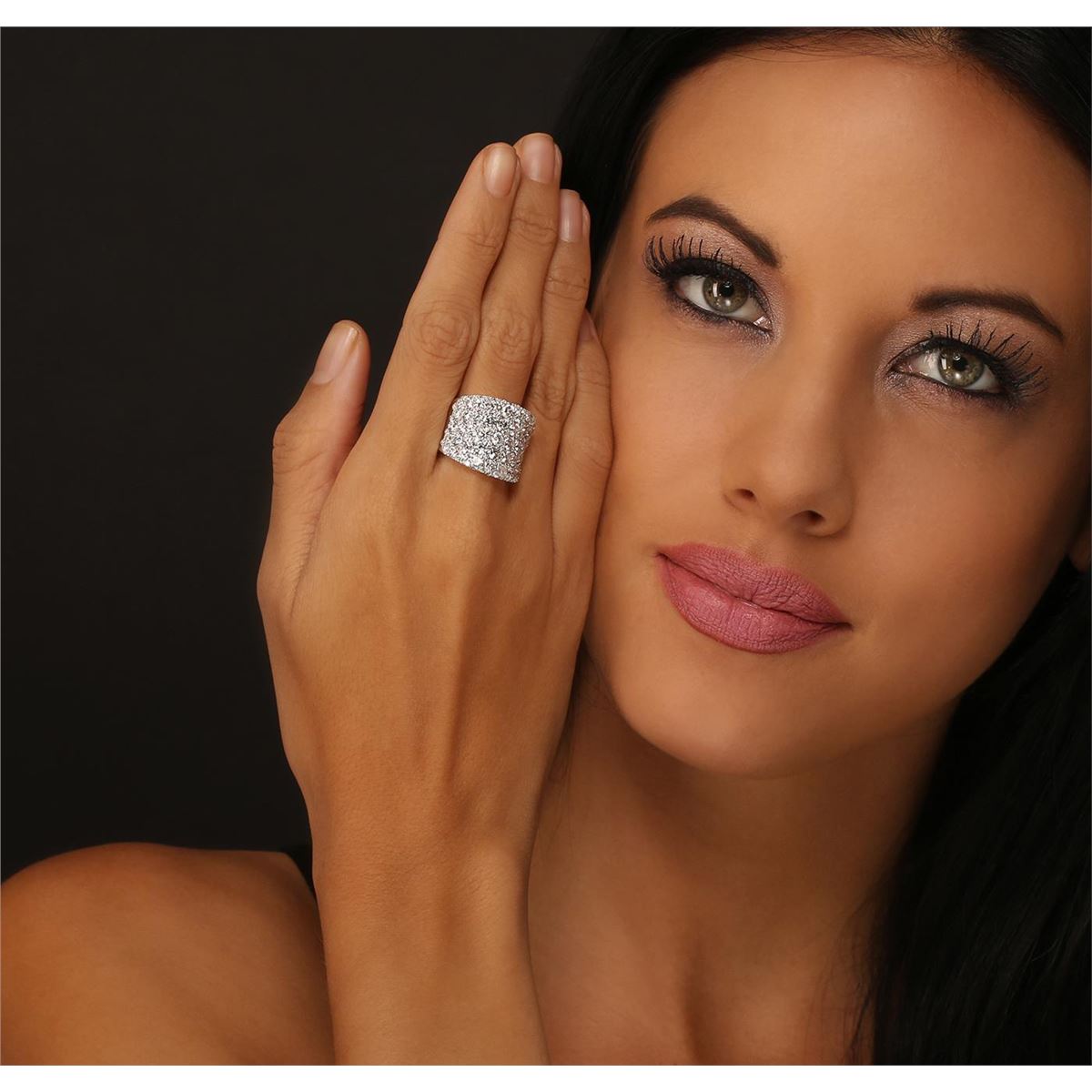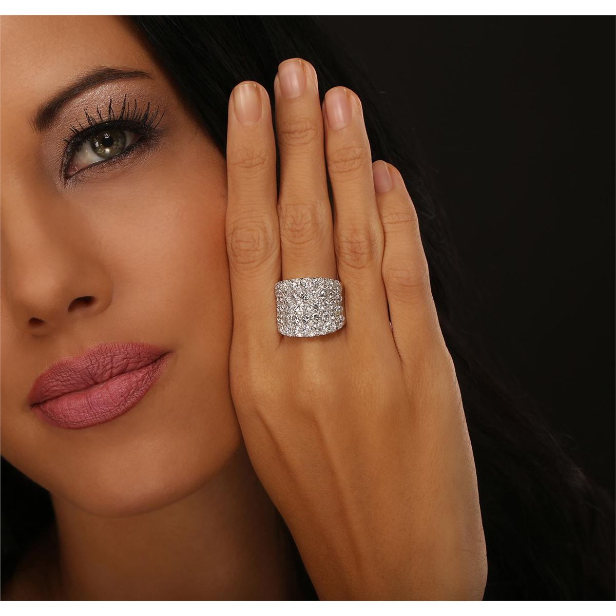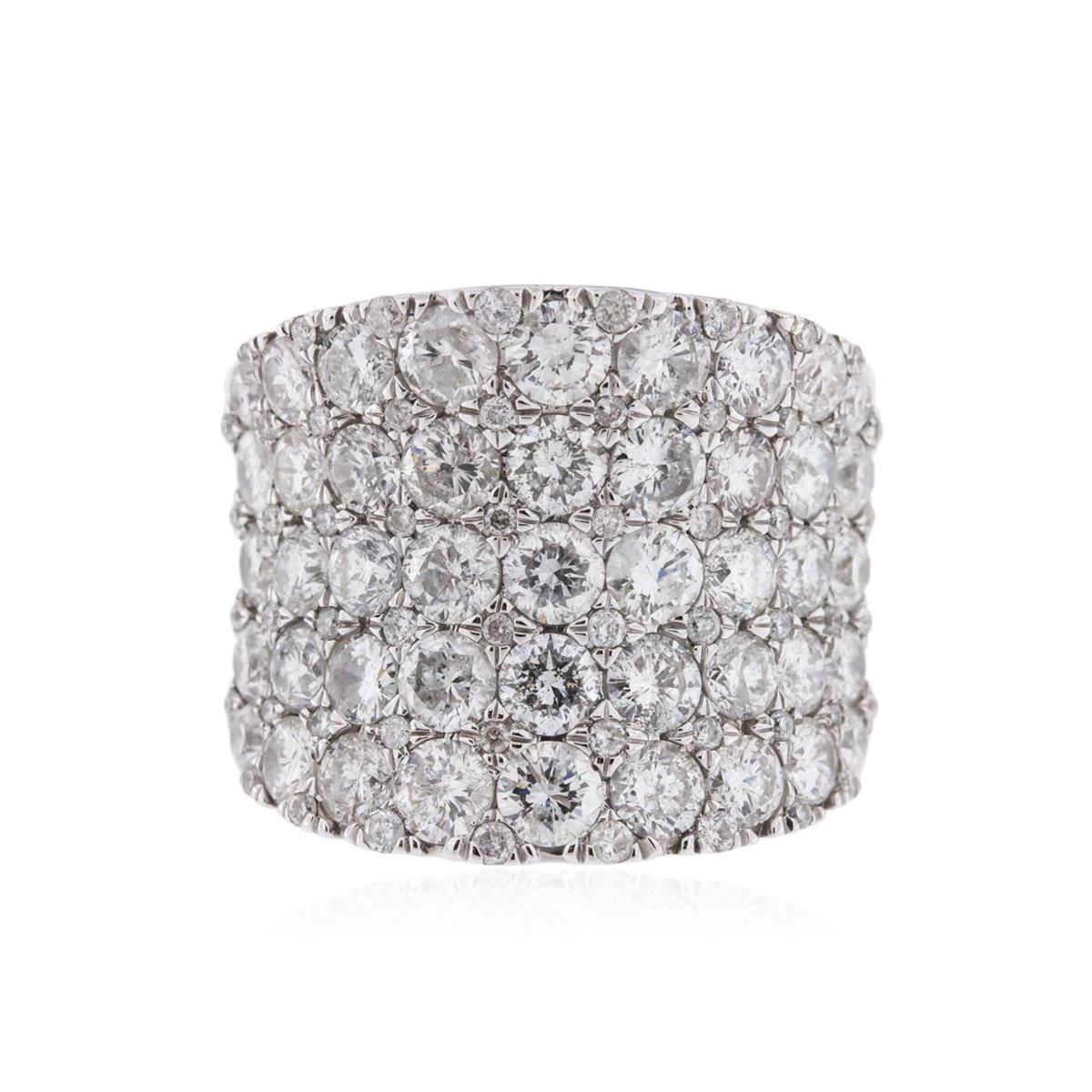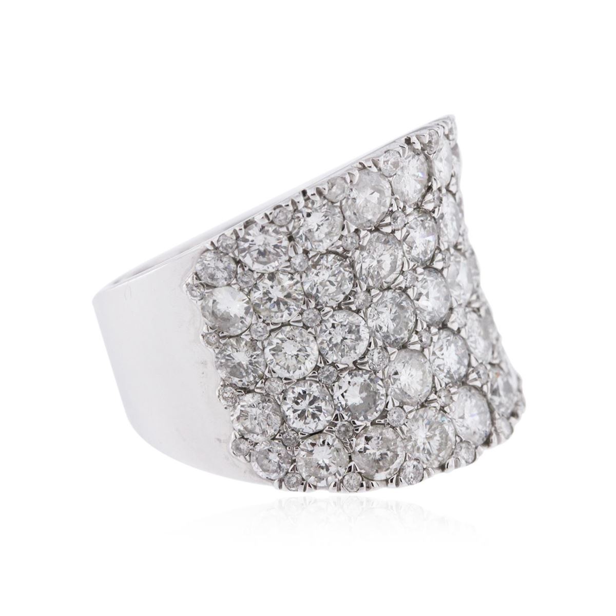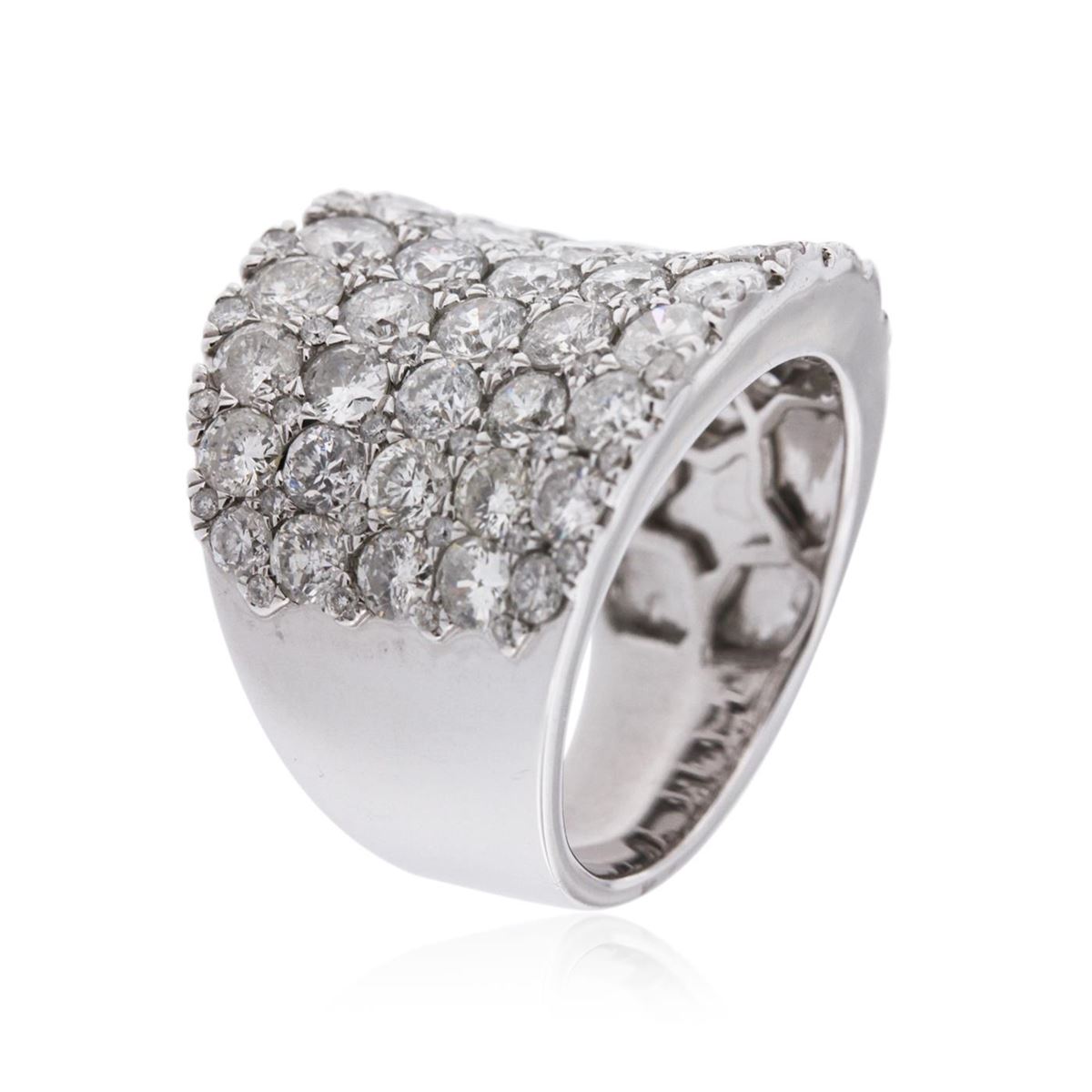 One electronically tested 18KT white gold ladies cast diamond ring with a bright polish finish. Condition is new, good workmanship. The ring features an elaborate eighteen millimeter wide diamond set curvature, completed by a six millimeter wide band. Identified with markings of "18K". Containing: Forty pav‚ set round brilliant cut diamonds, measuring 3.30 - 3.00 x 1.89mm (depth est.) approximate. Total Weight of 40 Stones = 4.67ct. The clarity grade reflects the entire range of clarity for this group. Graded in the setting. Clarity: SI-2 to I-2. Color: F - H Four pav‚ set round brilliant cut diamonds, measuring 2.30 - 2.20 x 1.35mm (depth est.) approximate. Total Weight of 4 Stones = 0.20ct. Graded in the setting. Clarity: SI-2 to I-1. Color: F - G Fifty-Six pav‚ set round brilliant cut diamonds, measuring 1.20 - 1.10 x 0.69mm (depth est.) approximate. Total Weight of 56 Stones = 0.40ct. Graded in the setting. Clarity: SI-1 to I-1. Color: F - H. Total Weight of Diamonds 5.27ct. Total Weight of Ring 14.00 grams. AIG Appraised at $17,920.00.
