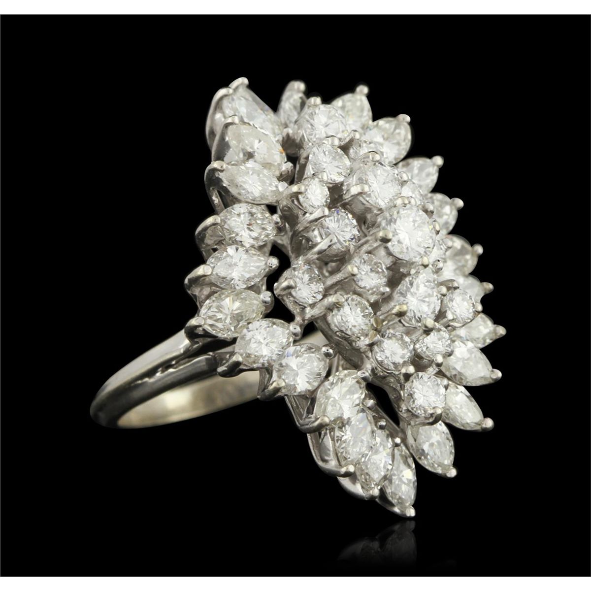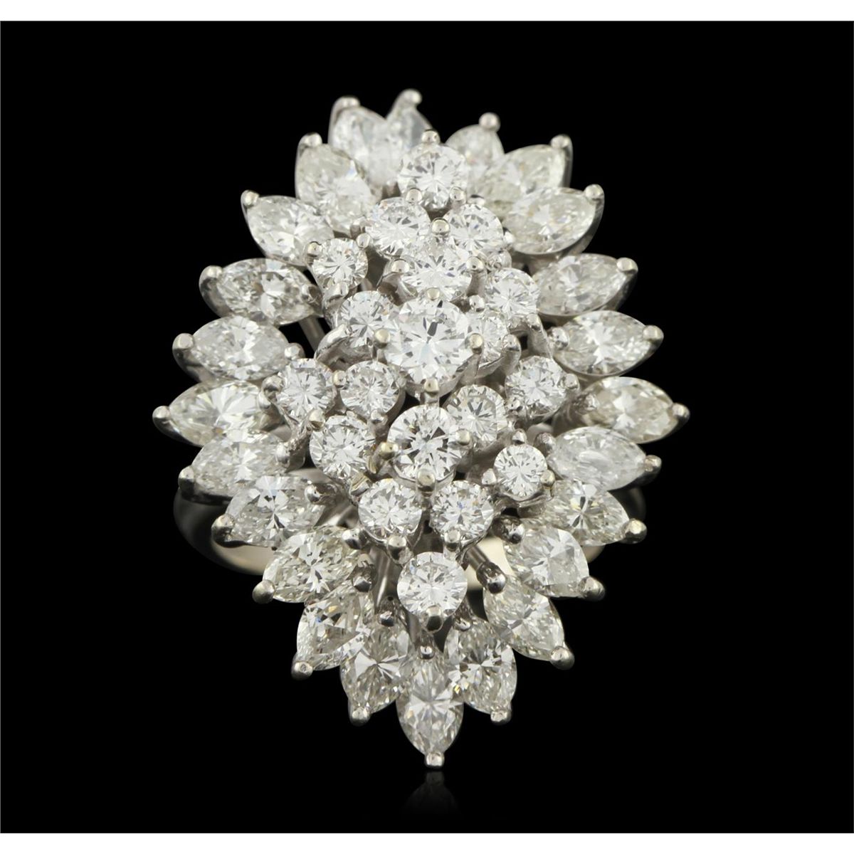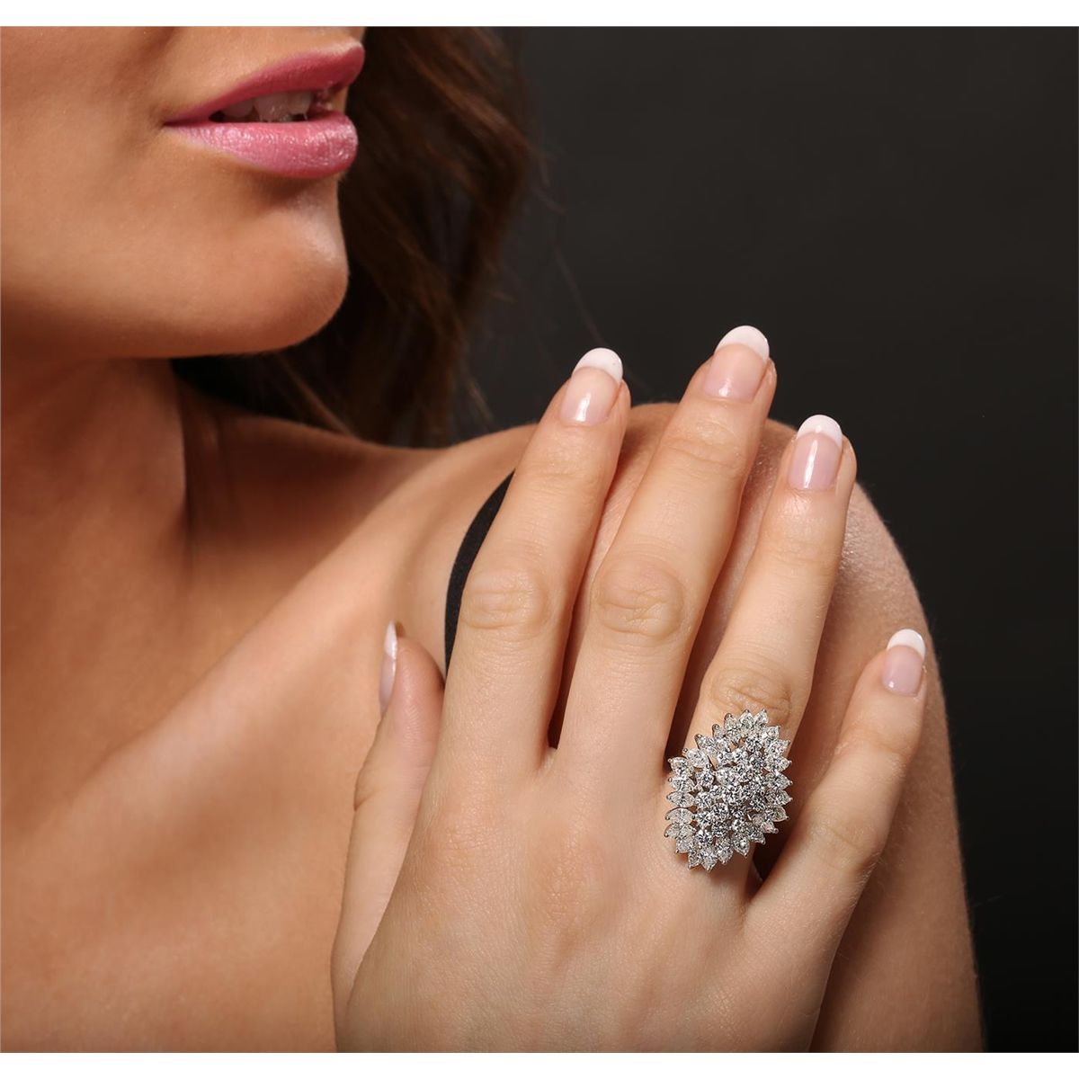 One electronically tested 18KT white gold ladies cast & assembled diamond ring with a bright polish finish. Condition is good. The ring features a stylized diamond cluster, completed by a grooved two millimeter wide band. Identified with markings of "18K". Containing: Nine prong set round brilliant cut diamonds, measuring 3.50 - 3.00 x 1.95mm (depth est.) approximate total weight of 9 Stones = 1.24ct. Graded in the setting. Clarity VS-1 to SI-1. Color G - I. Ten prong set round brilliant cut diamonds, measuring 2.50 - 2.00 x 1.35mm (depth est.) approximate total weight of 10 Stones = 0.51ct. Graded in the setting. Clarity VS-1 to SI-1. Color G - I. Twenty-four prong set marquise shaped cut diamonds, measuring 4.50 x 3.00 x 1.89mm (depth est.) approximate total weight of 24 Stones = 3.55ct. Graded in the setting. Clarity VS-1 to SI- 1. Color H - J. Total Weight of Diamonds 5.30ct. Total Weight of Ring 8.56gm. AIG Appraised at $20,135.00.