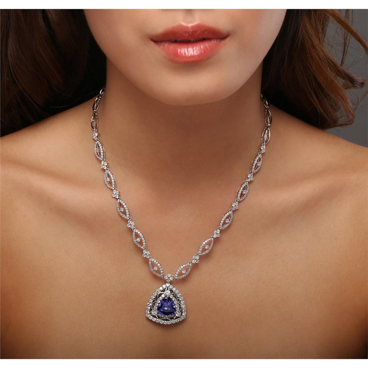 One necklace featuring: 18KT white gold weighing 30.00 grams containing one tanzanite center stone with a total weight of 5.31ct and round diamonds with a total weight of 7.20cts.