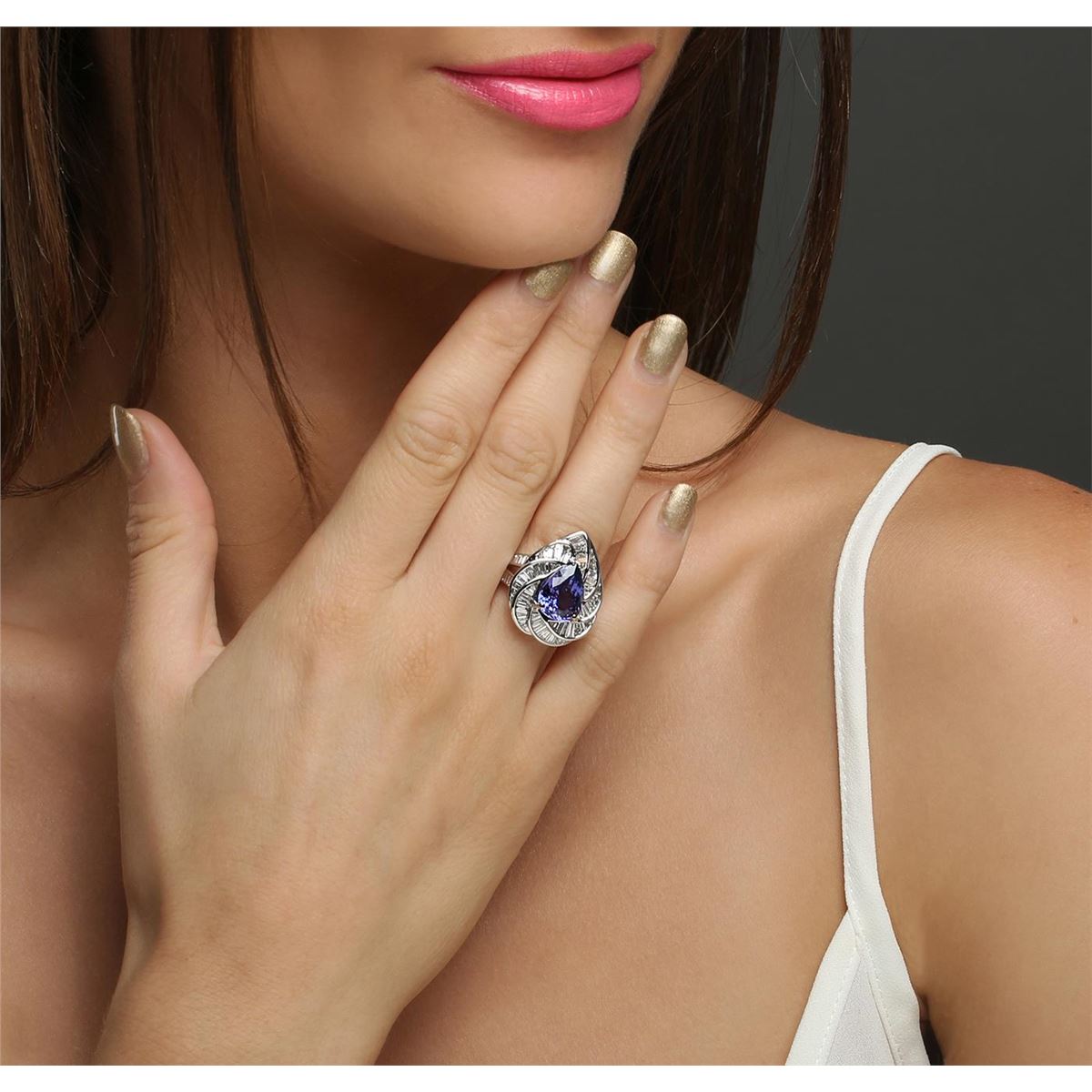 One electronically tested 18KT white gold ladies combination cast & assembled prong set ring with a split shank with a bright polish finish. Identified with markings of "750". Condition is new. Containing: One prong set pear modified brilliant cut natural tanzanite, measuring 11.85 x 9.70 x 6.96mm, approximate weight of 5.36ct., clarity is eye clean, type I, medium light, moderately strong, violet color, (GIA V 4/4), cut is good. One Hundred Nine channel set baguette cut diamonds, measuring from 1.10 x 1.10 x 0.94mm (depth est.) to 2.60 x 1.50 x 1.28mm (depth est.) approximate total weight of 109 Stones = 2.01ct. Clarity: VS-2 to SI-1. Color: H - I, Cut is Good. All diamonds are graded in the mounting, unless otherwise stated, Colored gemstones are presumed to have been subjected to commonly used enhancement processes. Total Weight of Colored Stones 5.36ct. Total Weight of Diamonds 2.01ct. Total Weight of Ring 12.10 grams. GGL Appraised at $18,225.00.