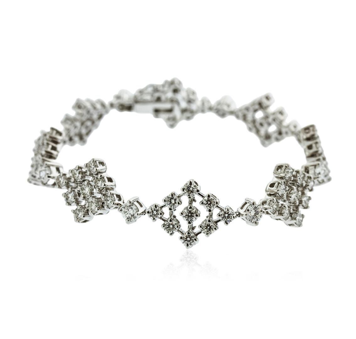 One electronically tested 18KT white gold ladies cast diamond bracelet with a hidden box clasp with a bright polish finish. Measurements: 6.75" in length. Identified with markings of "750". Condition is new. Containing: Eight prong set round brilliant cut diamonds, measuring 3.50 - 3.50 x 2.10mm (depth est.) approximate total weight of 8 Stones = 1.26ct. Clarity: VS-2. Color: - J, Cut is Very Good. Seventy-Two prong set round brilliant cut diamonds, measuring 2.50 - 2.50 x 1.50mm (depth est.) approximate total weight of 72 Stones = 4.11ct. Clarity: VS-2 to SI-2. Color: J, Cut is Very Good. All diamonds are graded in the mounting, unless otherwise stated. Total Weight of Diamonds 5.37ct. Total Weight of Bracelet 21.10 grams. GGL Appraised at $15,805.00.