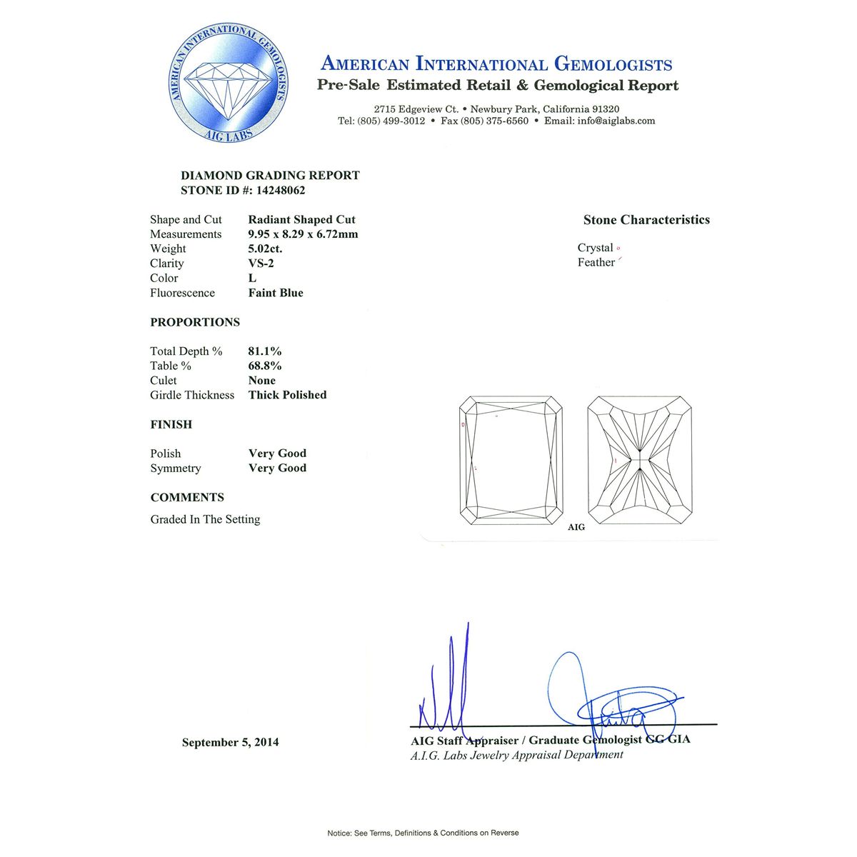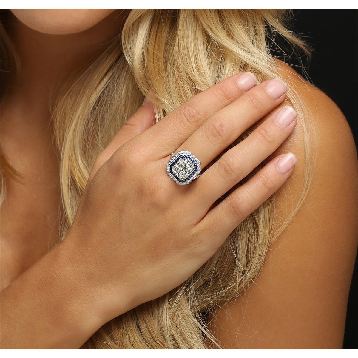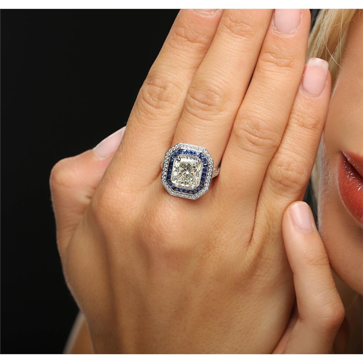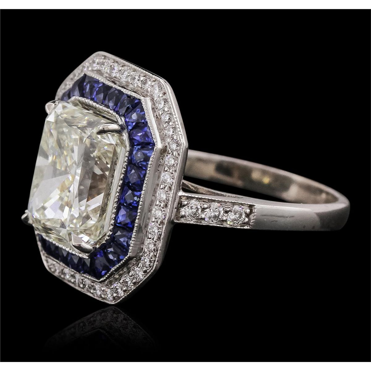 One electronically tested 18KT White Gold ladies cast diamond and sapphire ring. The featured diamond is set within an inner sapphire bezel and an outer diamond bezel supported by diamond set shoulders, completed by a two millimeter wide band. Bright polish finish with milgrain detailing. Identified with markings of "18K".The ring is reminiscent of the jewelry designs from the Art Deco Period. The Paris Exposition of Decorative Arts and Modern Manufacturers in 1925 gave the movement its name. The Art Deco Period is characterized with jewelry designs composed of bold geometric designs, & cubism. Condition is good. Containing: One prong set radiant shaped cut diamond, measuring 9.95 x 8.29 x 6.72mm (depth est.), 8.00.% GTCF approximate weight of 5.02ct with a faint blue fluorescence. Diamond Grading Report attached. Graded in the setting. Clarity: VS-2. Color: L. Depth 81.1%. Table 68.8%. Forty-Eight bead set round brilliant cut diamonds, measuring 1.80 - 1.20 x 0.90mm (depth est.) approximate total weight of 48 Stones = 0.50ct. Graded in the setting. Clarity: VVS-1 to VVS-2 Color G - I. Twenty-six channel set trapezoid step cut natural blue sapphires approximate total weight of 1.86ct., clarity is eye clean, type II, medium dark, moderately strong, blue color, (GIA B 6/4), cut is good. Transmitting light with no distortion, transparent. Color grade is an average for the group. Graded in the setting. Total Weight of Colored Stones 1.86ct. Total Weight of Diamonds 5.52ct. Total Weight of Ring 5.89 grams. AIG Appraised at $117,075.00.
